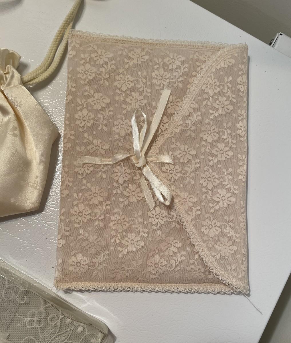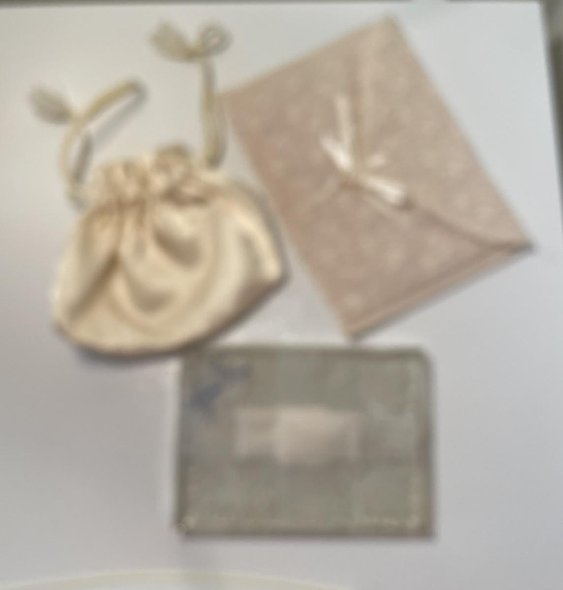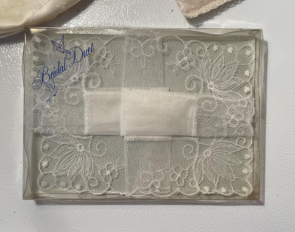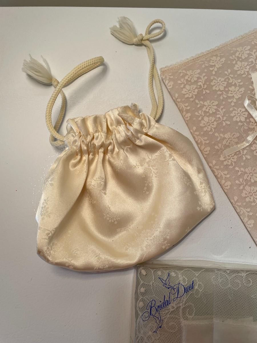 The satin drawsting bag is about 7 inches by 7.5 inches and in excellent condition. The vintage bridal hanky is about 10.5 inches square with a linen center and large lage edging and the original box. It is unused. The lingerie bag is in an unused condition as well.