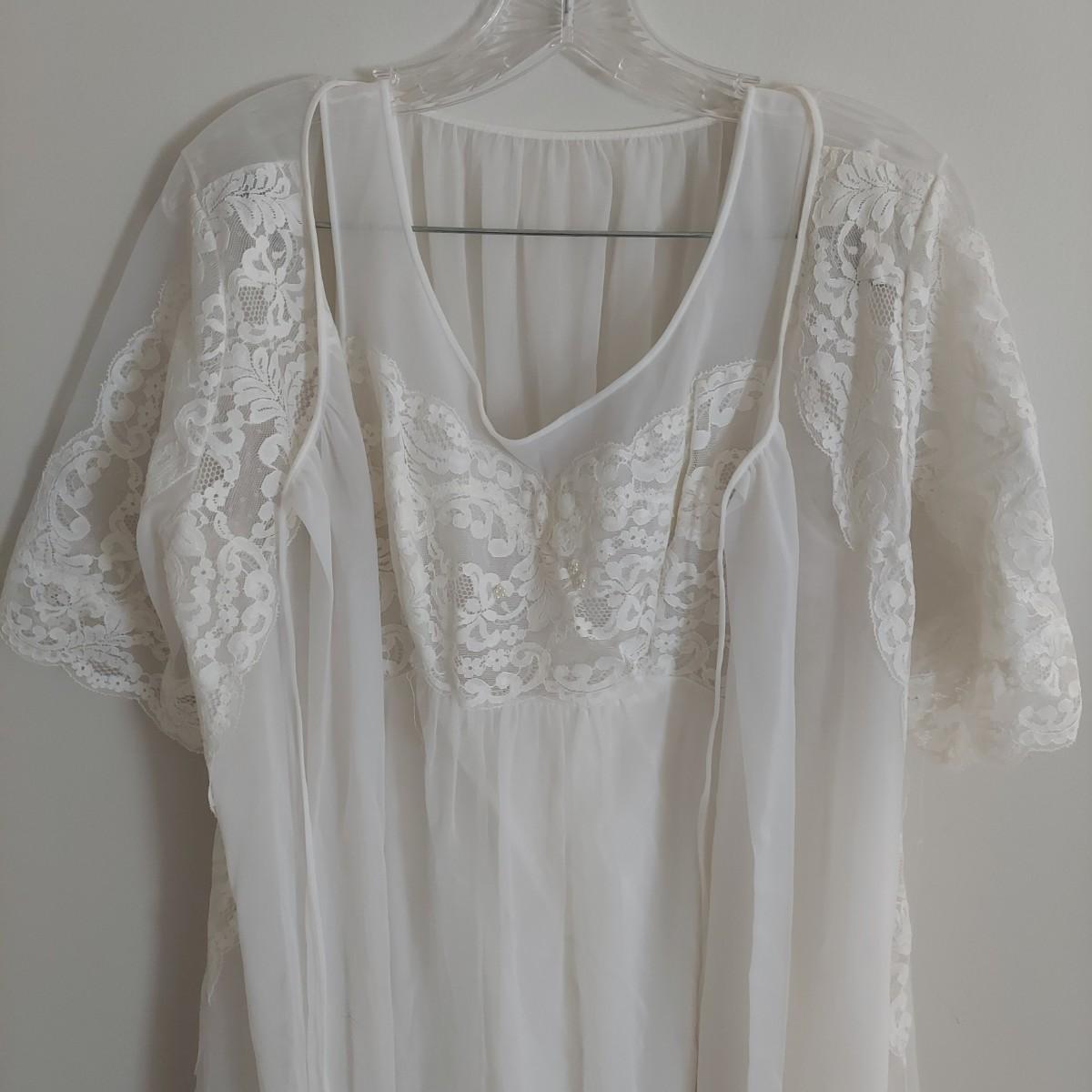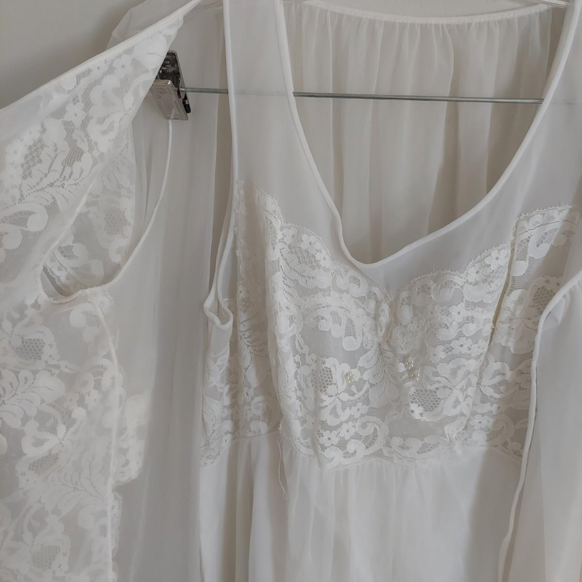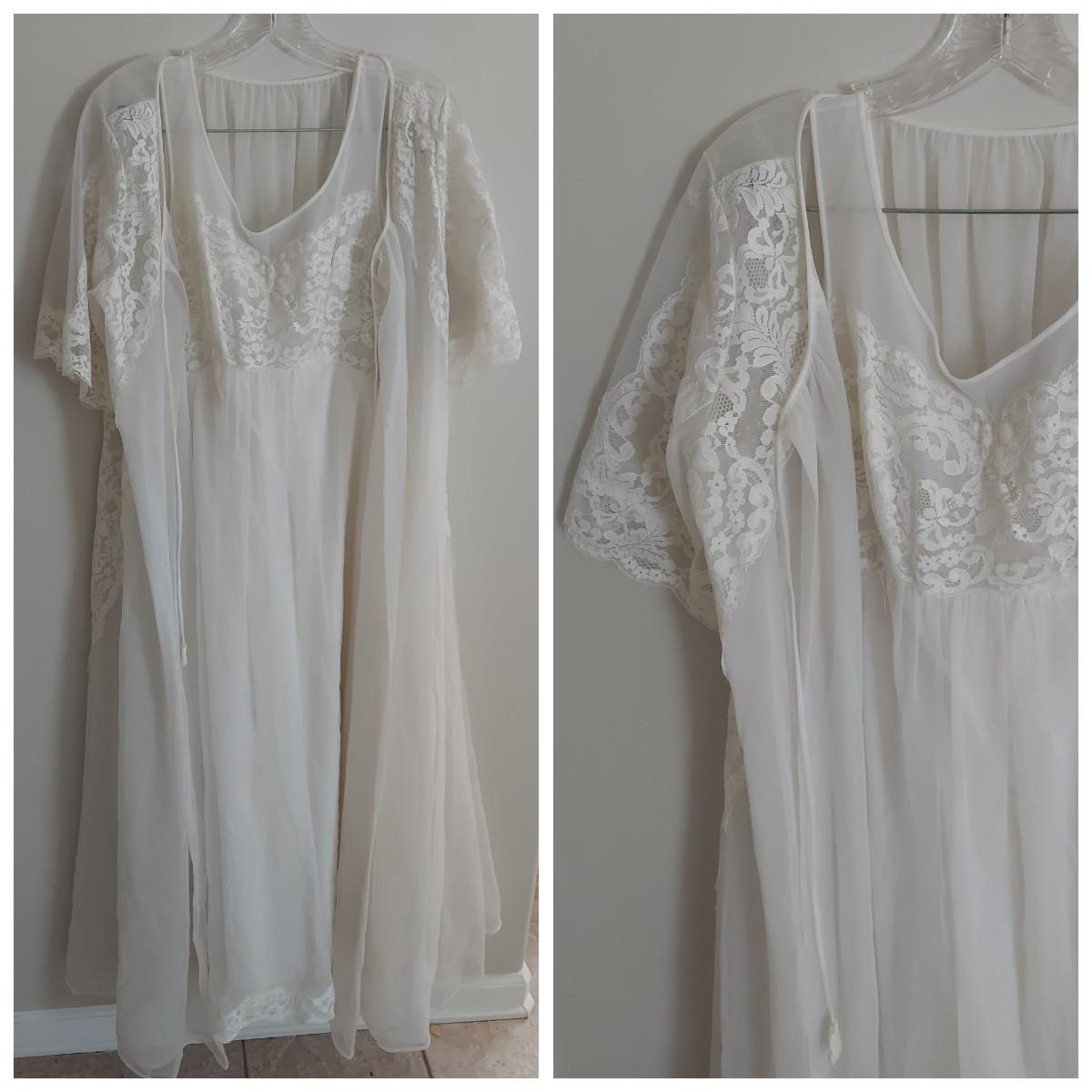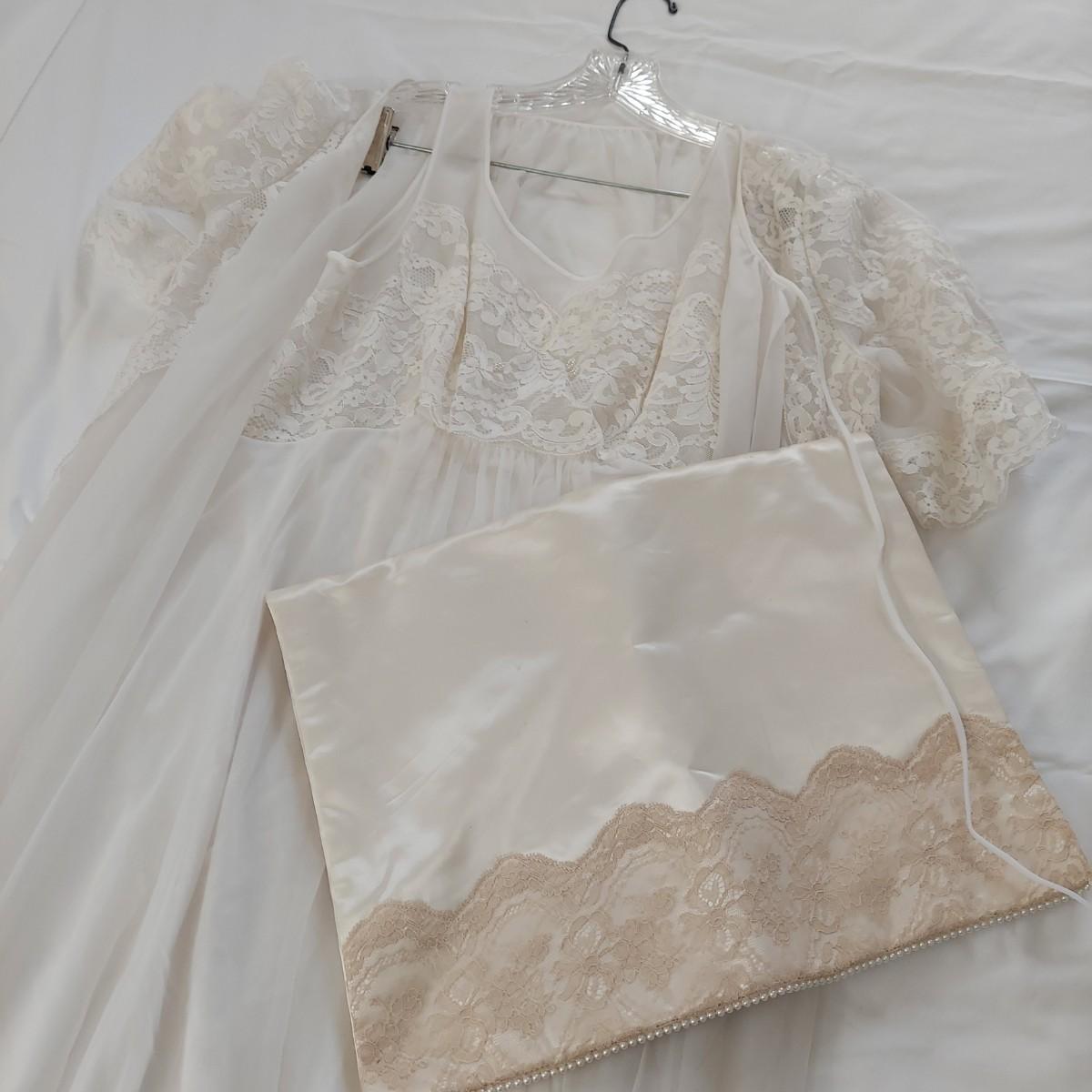 Vintage nightgown and duster that appear to be wedding night wear. Also comes with a satin bridal purse. Please see photos for details. Shipping available