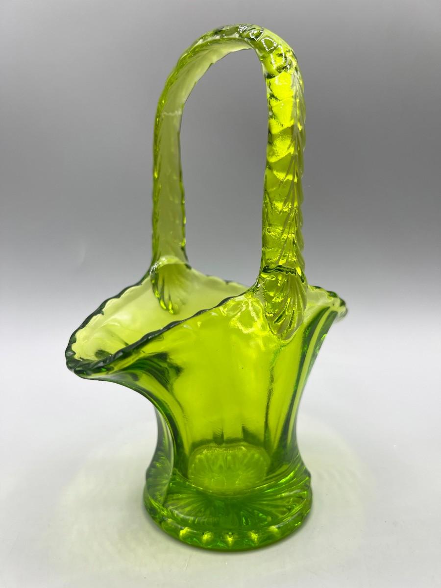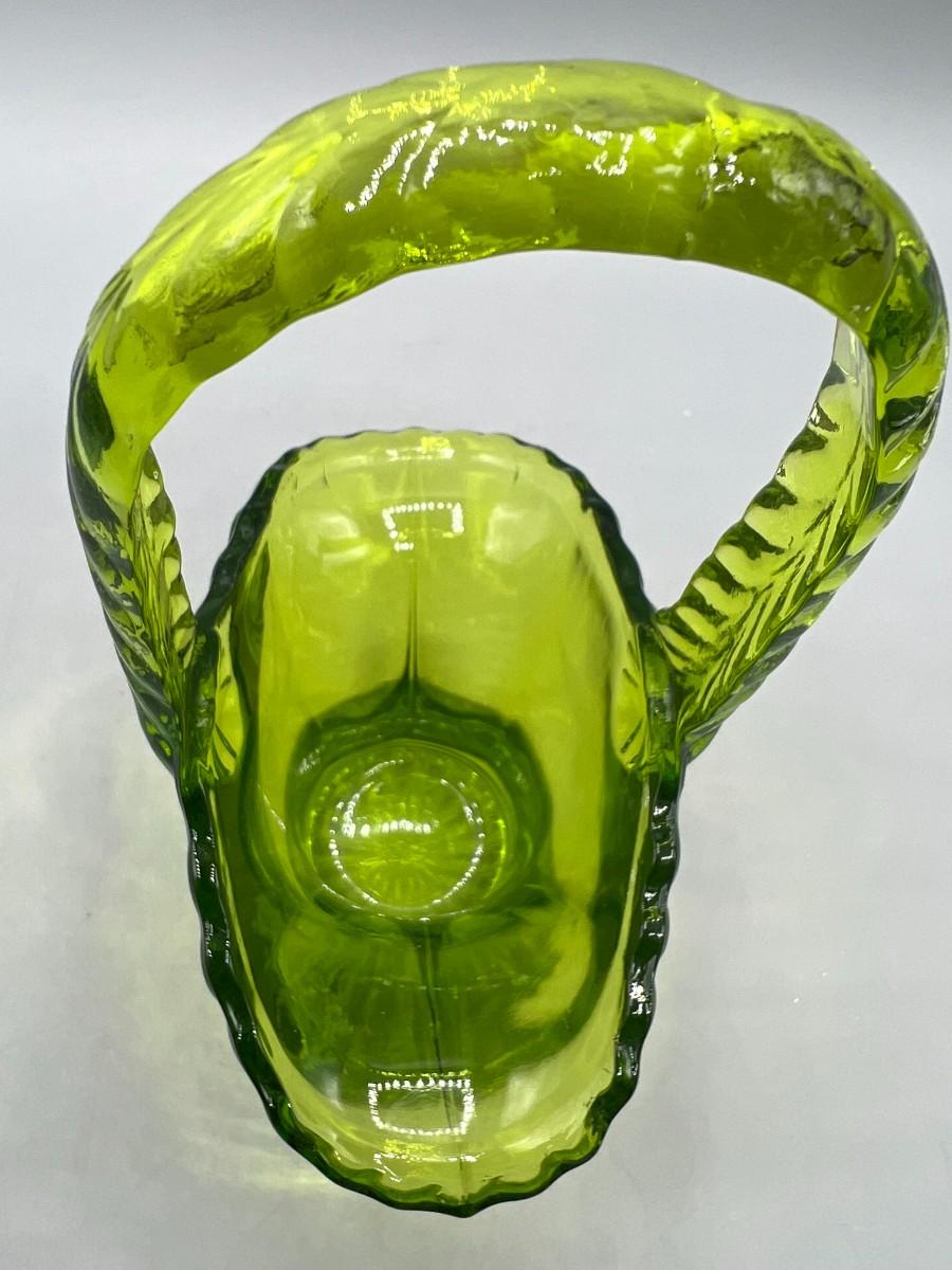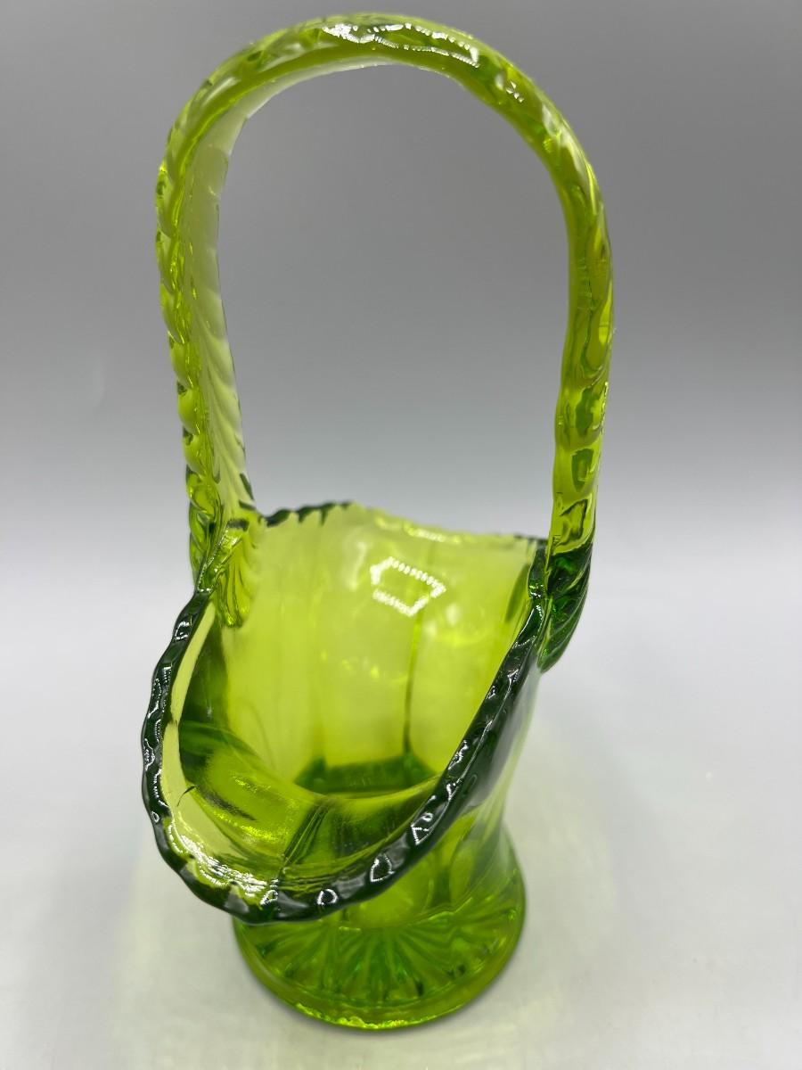 Vintage Bright Green Westmoreland Glass Bridal Basket. Green colored glass, not vaseline glass, we checked. In good condition. About 7" size.