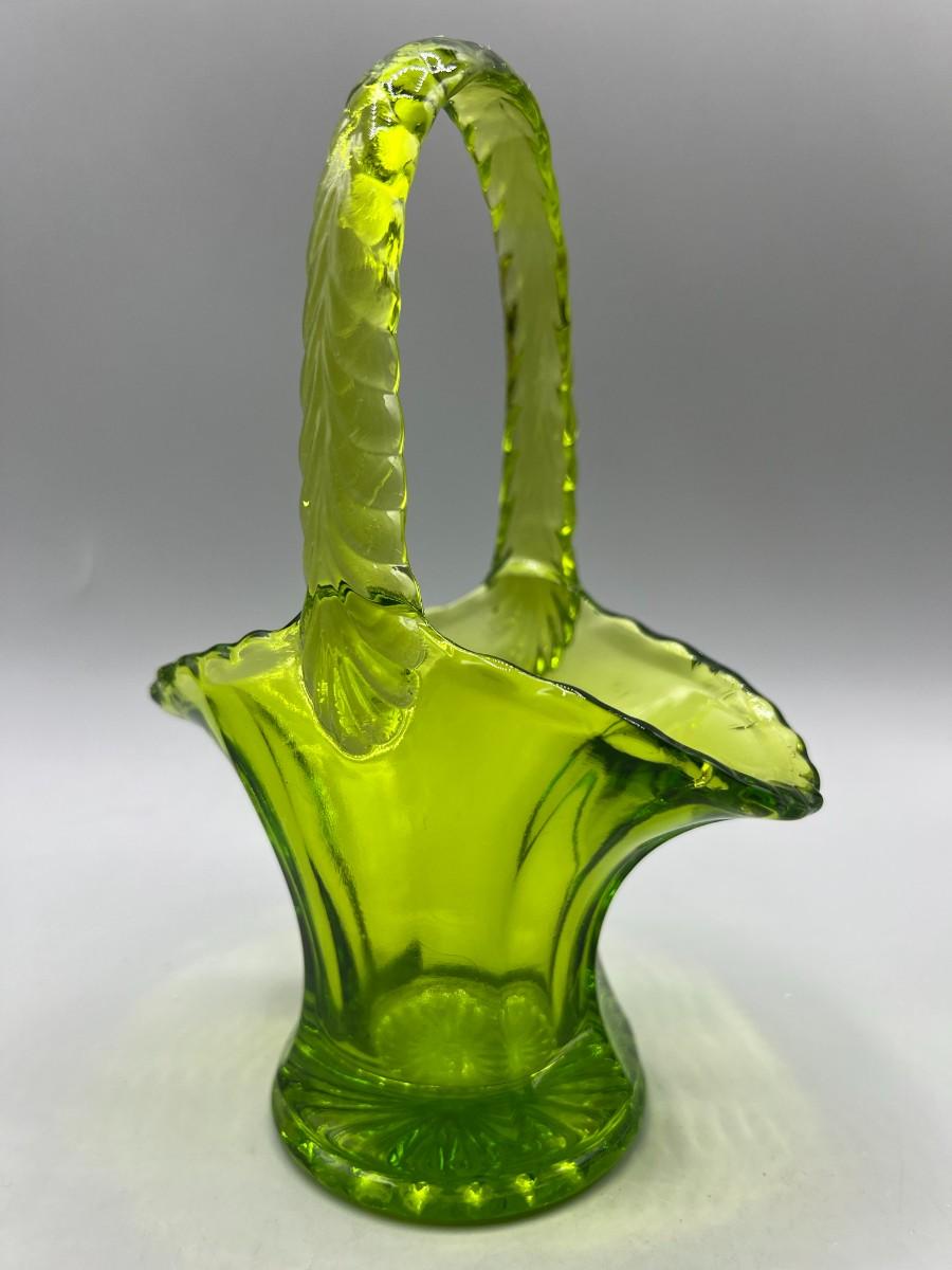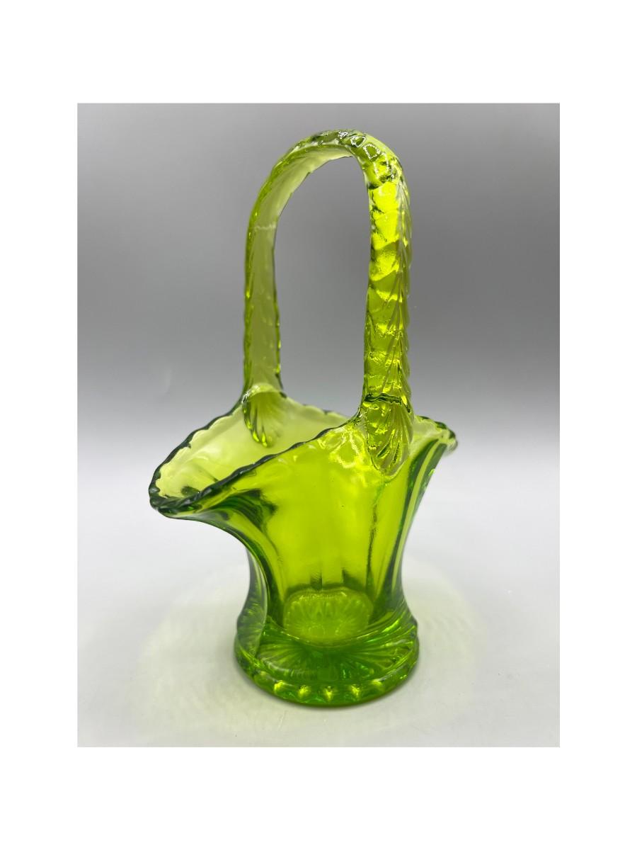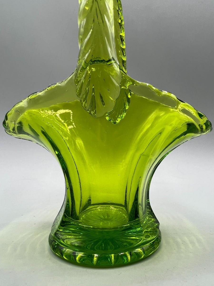 Vintage Bright Green Westmoreland Glass Bridal Basket. Green colored glass, not vaseline glass, we checked. In good condition. About 7" size.