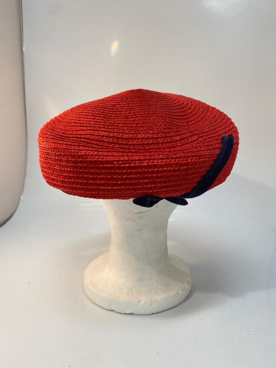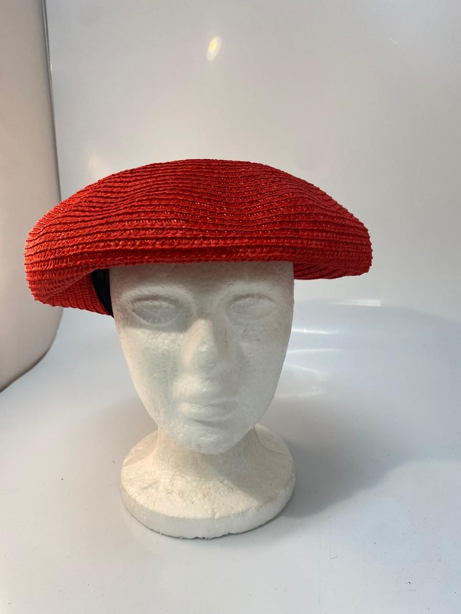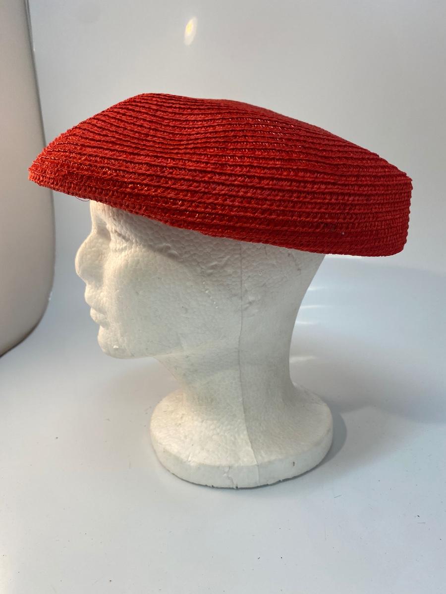 Vintage Bright Red Mr. John Sophisticate Woven Raffia Straw Beret Style Hat. Sold by Bullock's Santa Ana. In good condition, vibrant color.