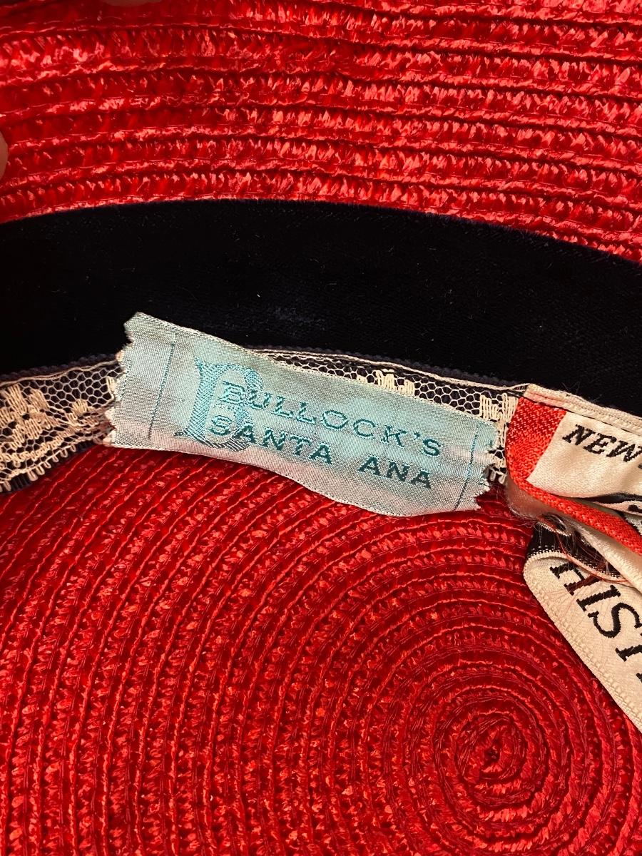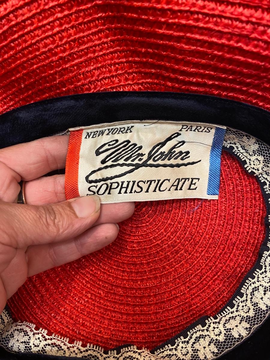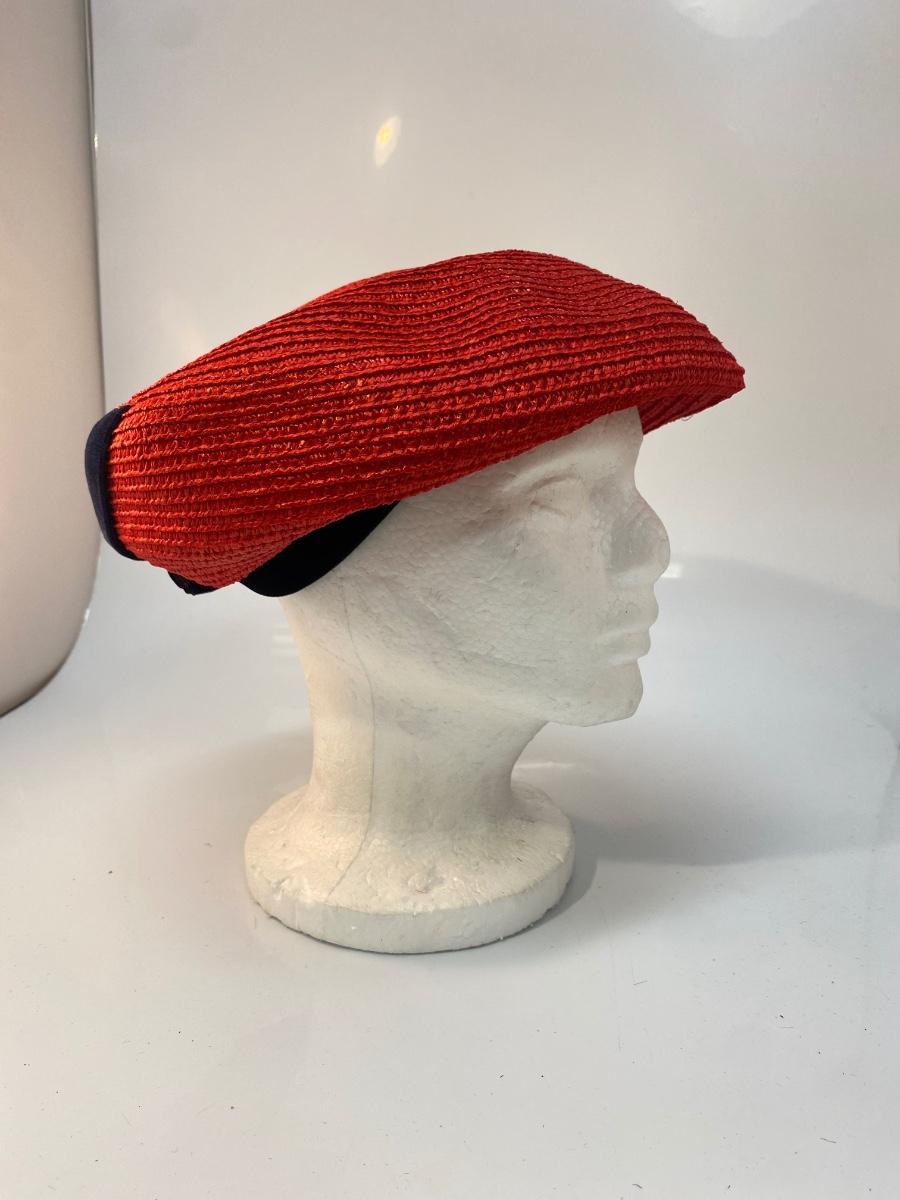 Vintage Bright Red Mr. John Sophisticate Woven Raffia Straw Beret Style Hat. Sold by Bullock's Santa Ana. In good condition, vibrant color.
