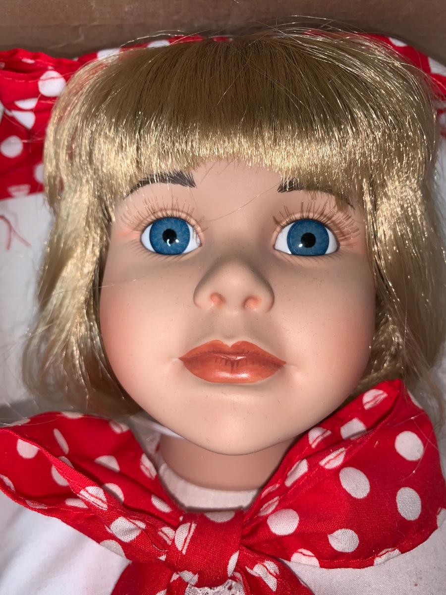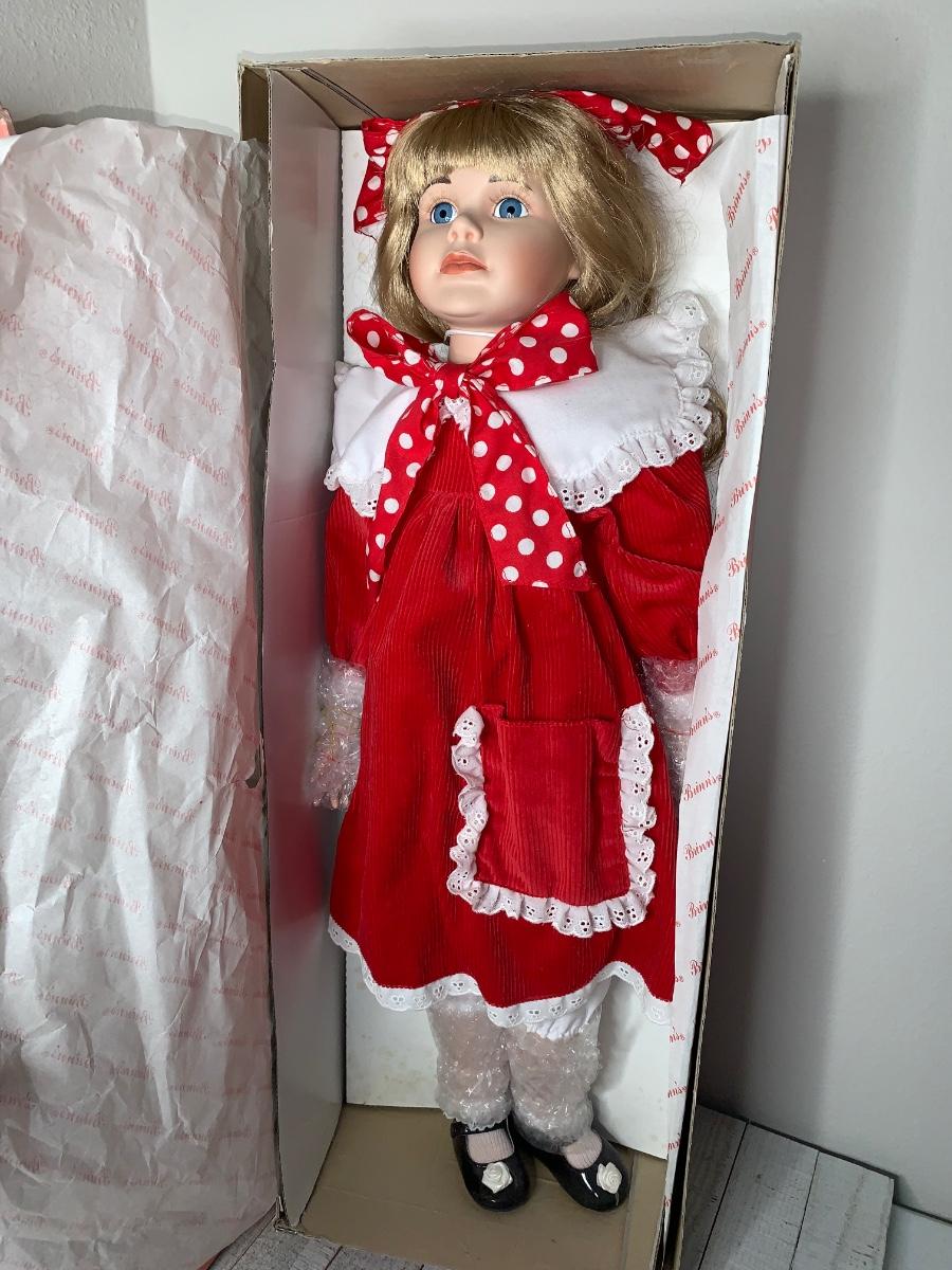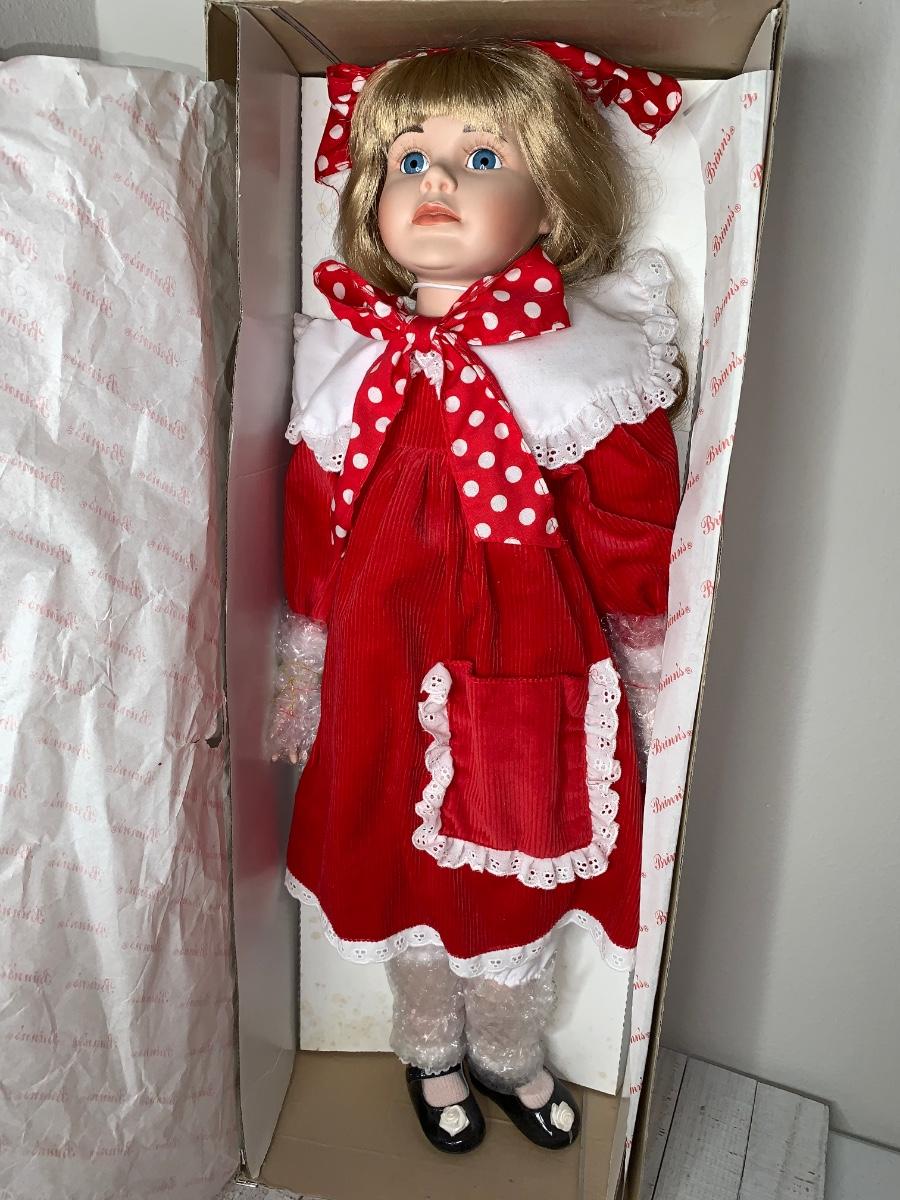 Meet Kate a super cute adorable Vintage Brinn's Limited Edition Porcelain Doll she is in her adorable Corduroy red Dress & Polka Dot Ribbon 1991 she is beautiful and in pristine condition I only open the box for photos, she is still attached to the box like she just came from the store.
