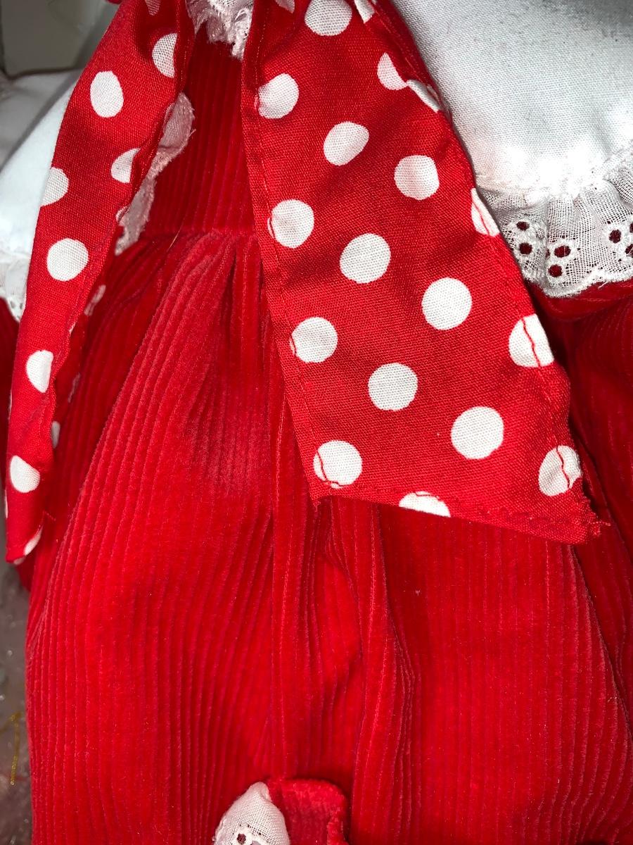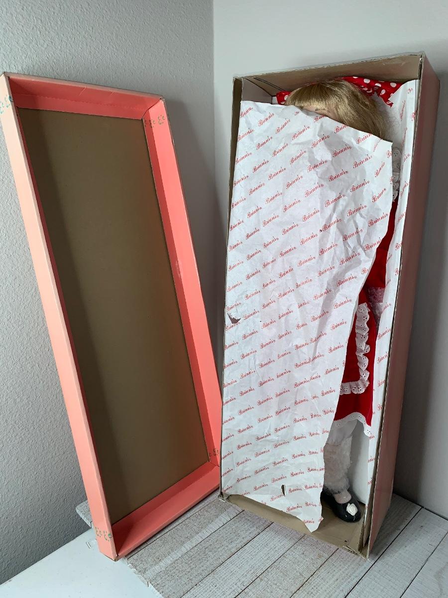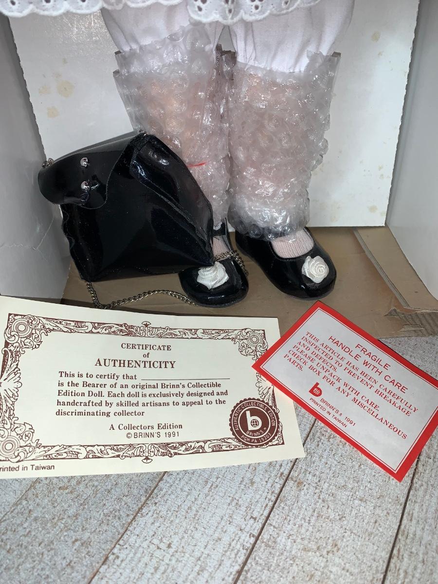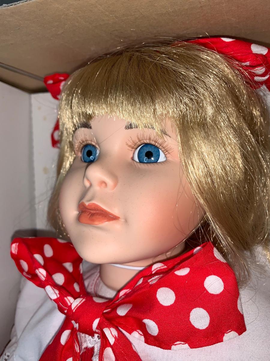 Meet Kate a super cute adorable Vintage Brinn's Limited Edition Porcelain Doll she is in her adorable Corduroy red Dress & Polka Dot Ribbon 1991 she is beautiful and in pristine condition I only open the box for photos, she is still attached to the box like she just came from the store.