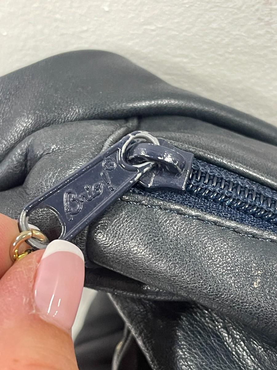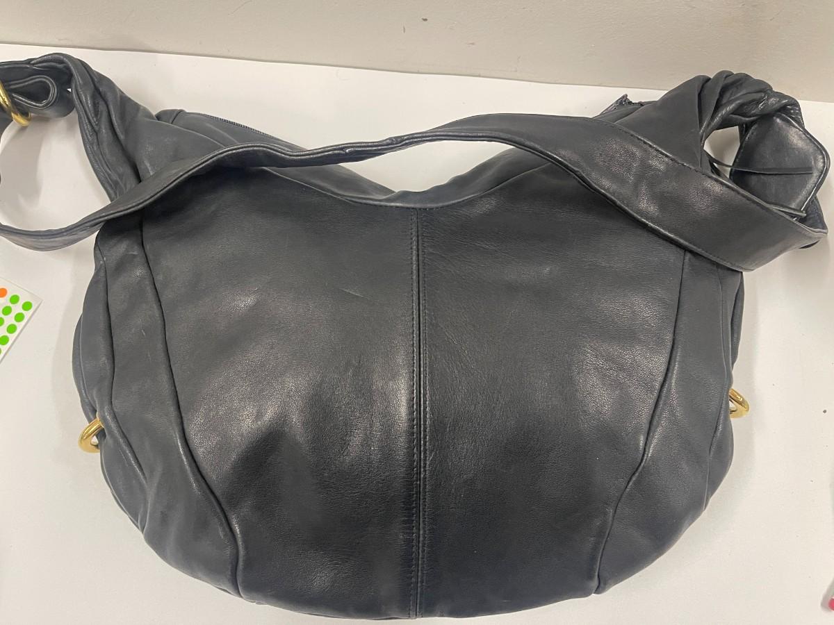 Vintage Brio blue leather handbag. Very good condition. Minor signs of wear, including some scuff marks. Gold tone hardware. Approximately 12" x 14"