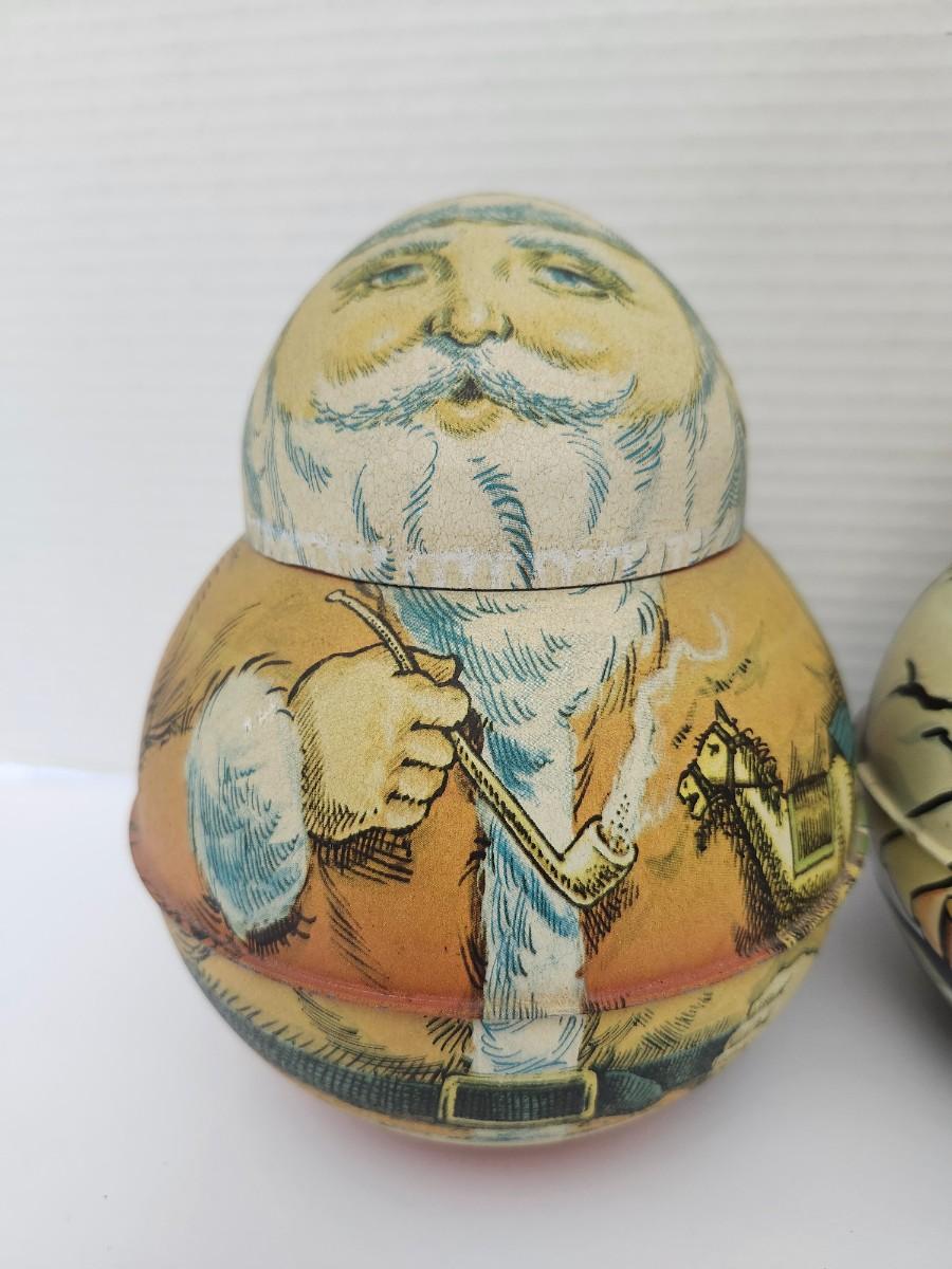 Pair of vintage Santa Claus character tins with rounded figural form and printed illustration decoration. One marked Santa 1980 made by Bristol Ware a division of Chain Industries Inc Burlington New Jersey. The second marked as a replica of an antique container manufactured in the United States circa 1912 made by Cheinco Housewares a division of Chein Industries Inc Burlington New Jersey with patent applied for note. Both feature removable lids and classic Santa imagery. Sold together as a matching vintage style tin lot exactly as shown.