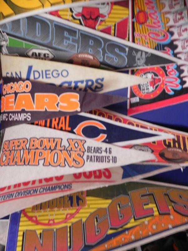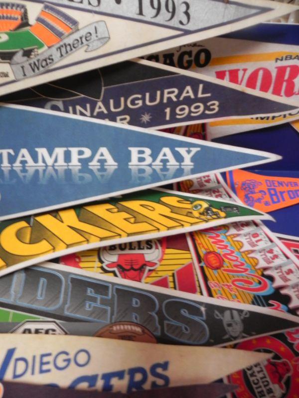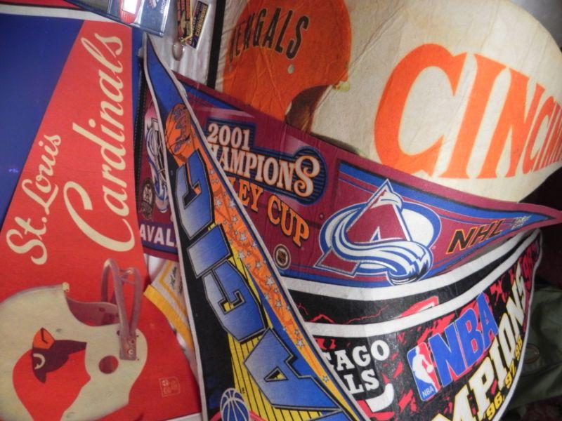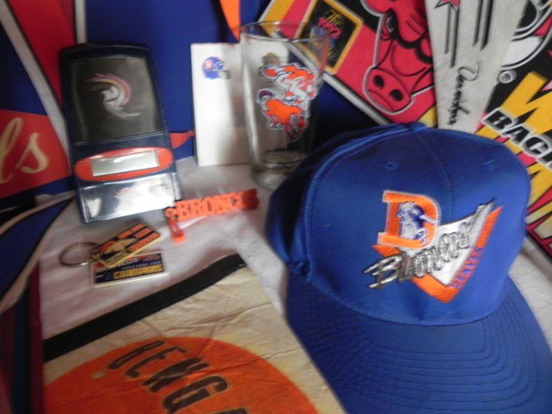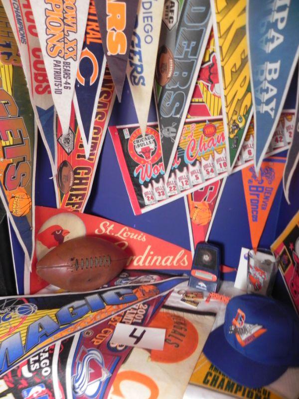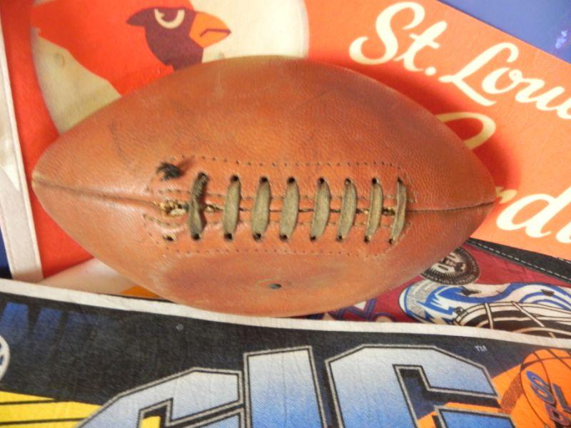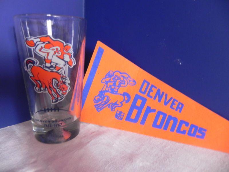 *PENNETS ARE OF FULL SIZE, MANY TEAMS AND SPORTS, VINTAGE LEATHER LACED FOOTBALL, VINTAGE BRONCO PENNE (MINI) AND DRINKING GLASS WITH VINTAGE BRONCO EMBLEM
