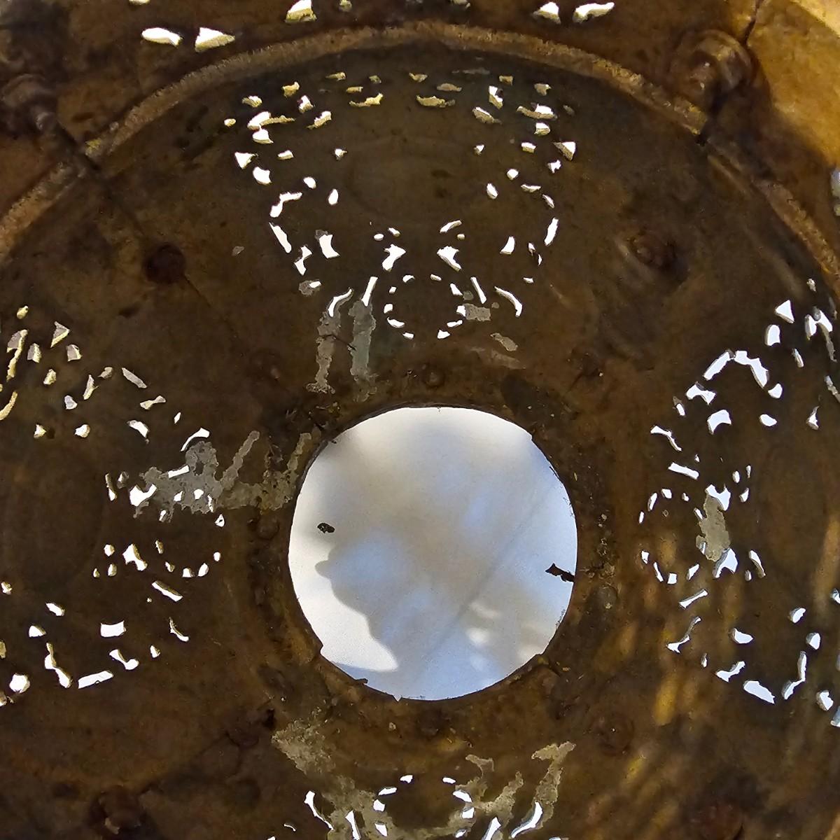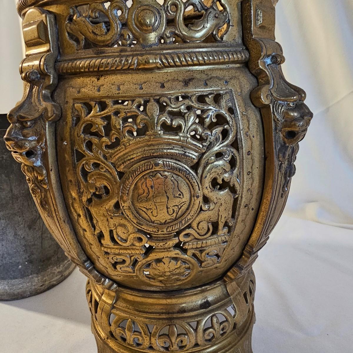 Highly decorated bronze jar with metal insert. Jar measures 10" D x 13"H. Asian cultural influence reflected in the design and execution of the piece. See photos for details. Shipping available.