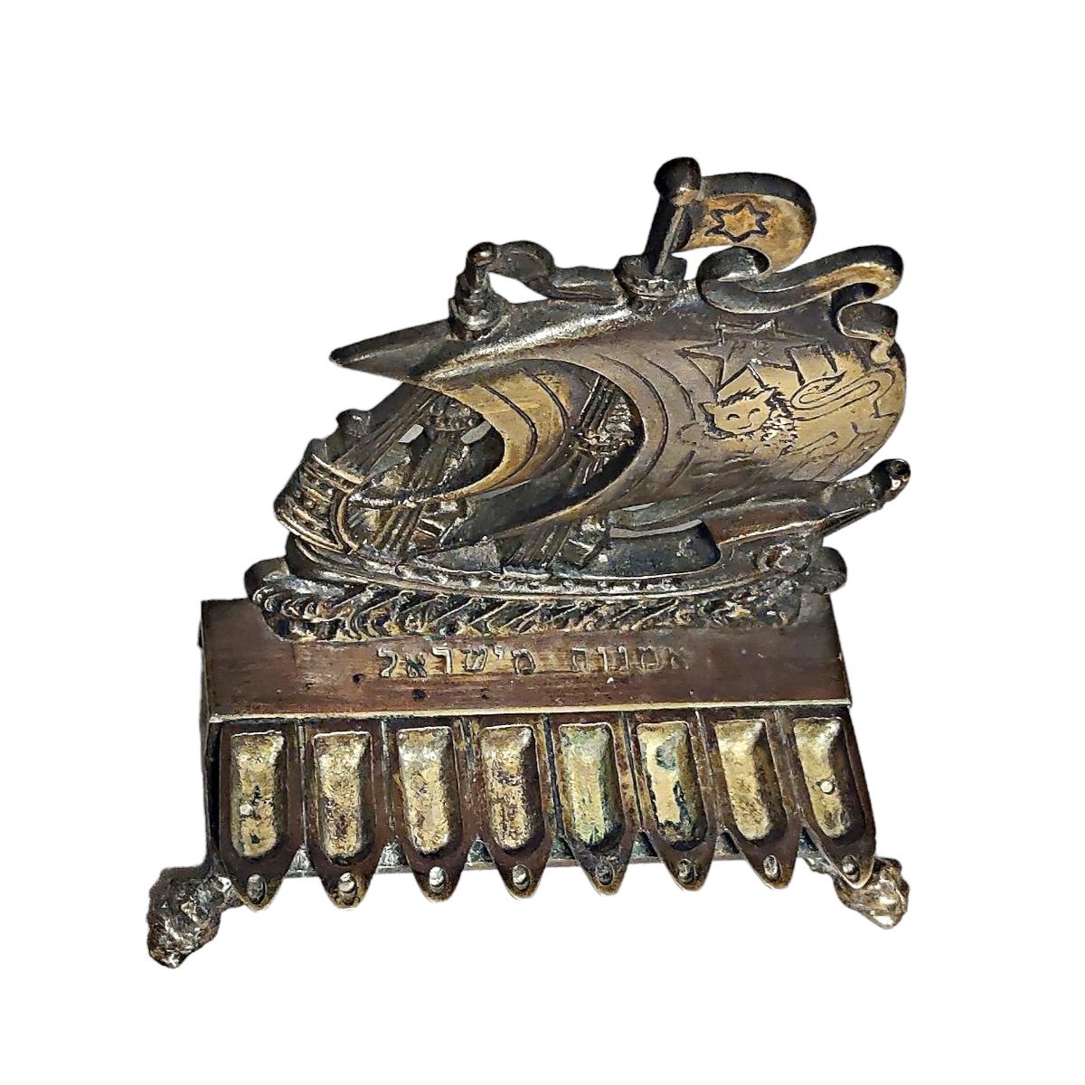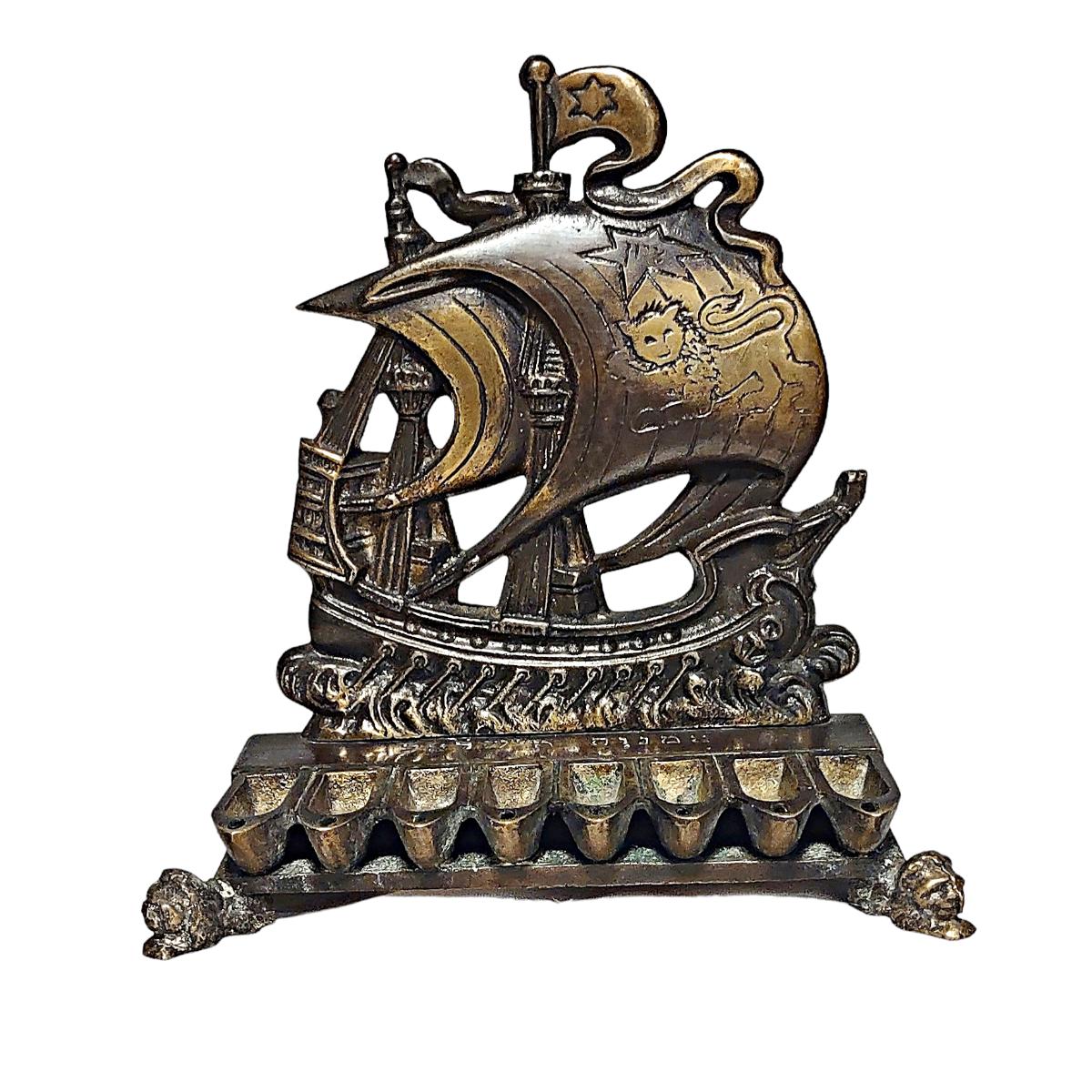 - Vintage Cast Bronze Engraved Menorrah in the Form of a Galley Ship