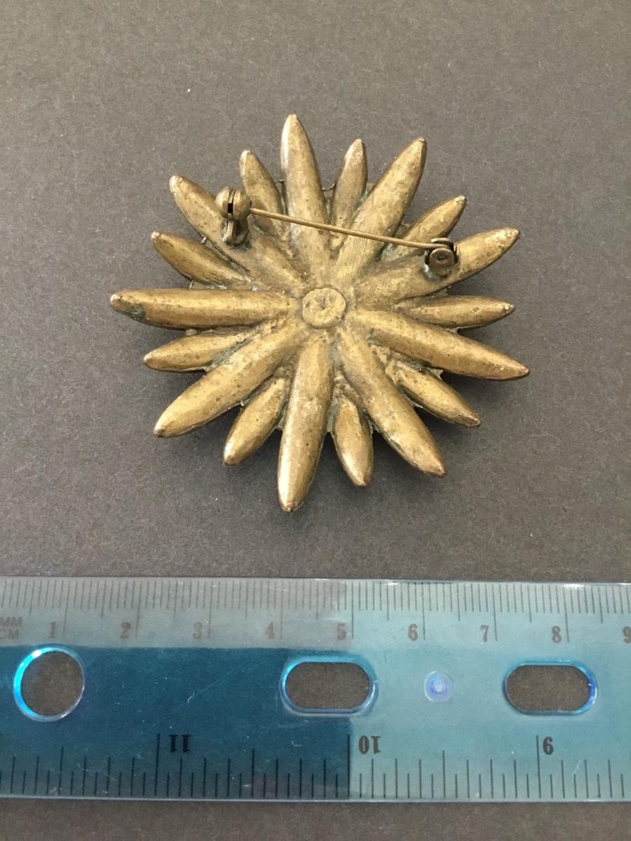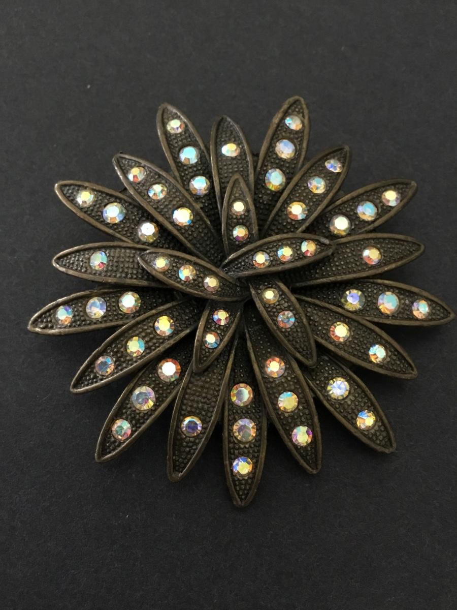 Vintage bronze, toned, heavy metal, rhinestone, flower, brooch, large