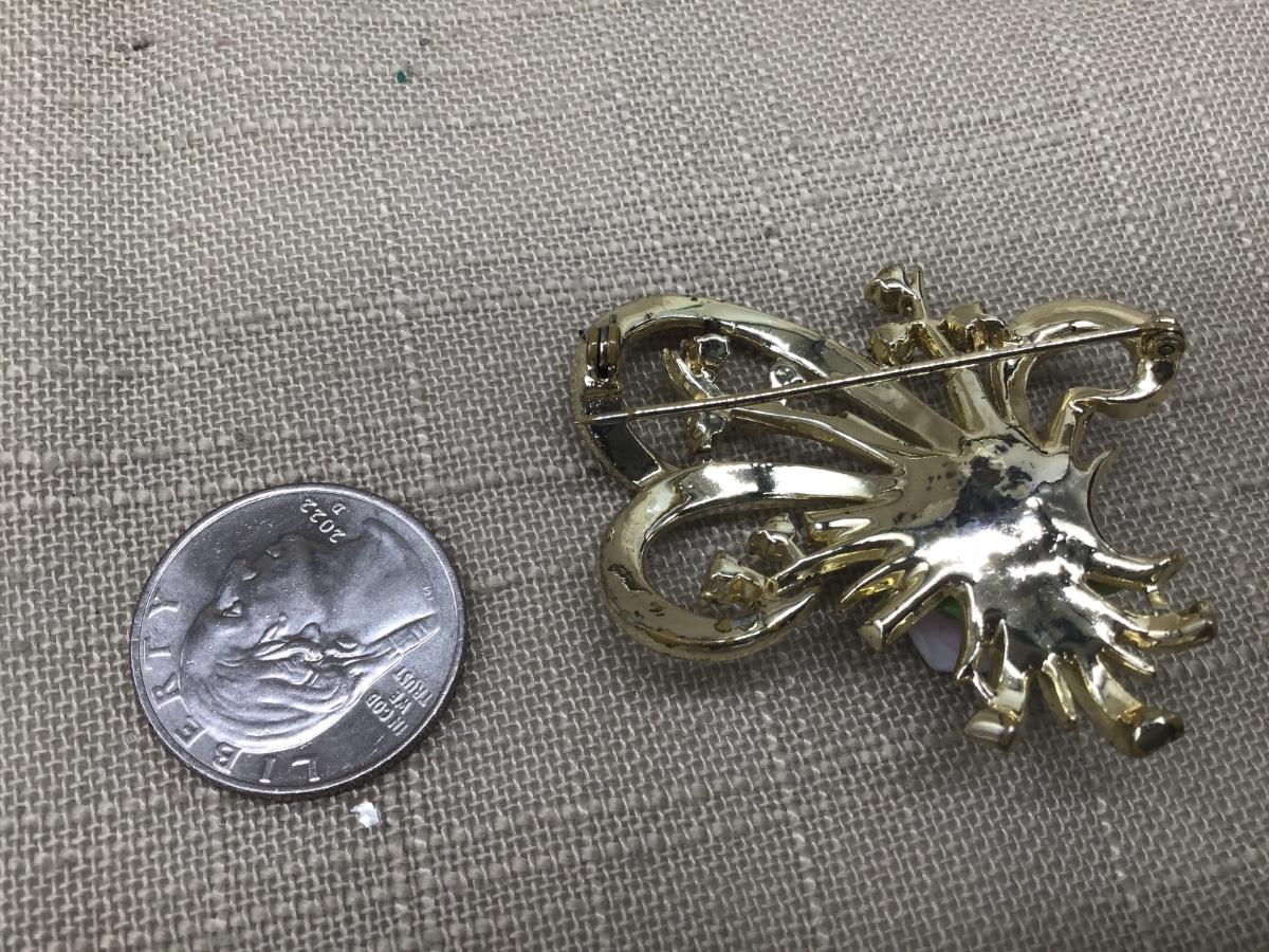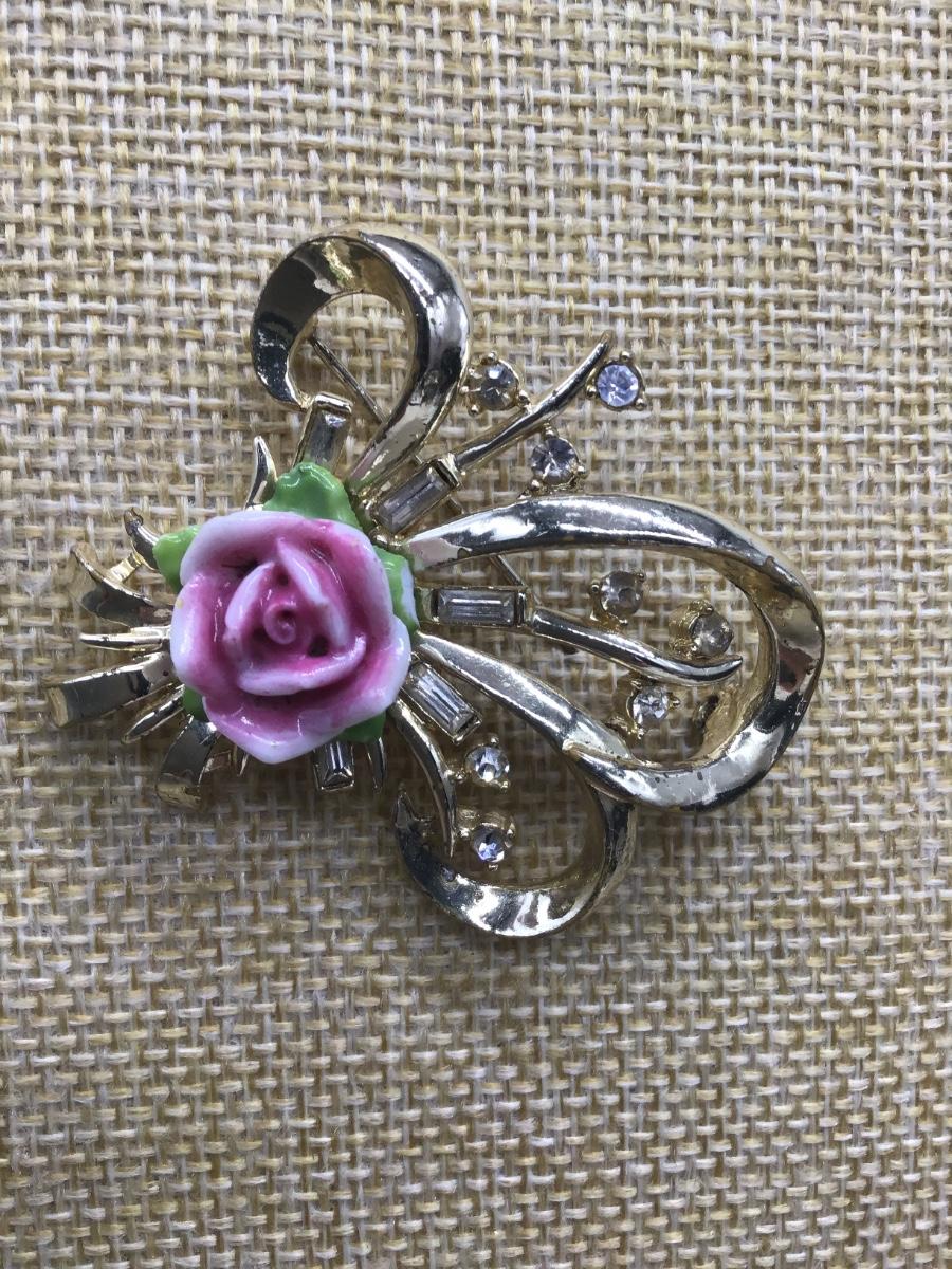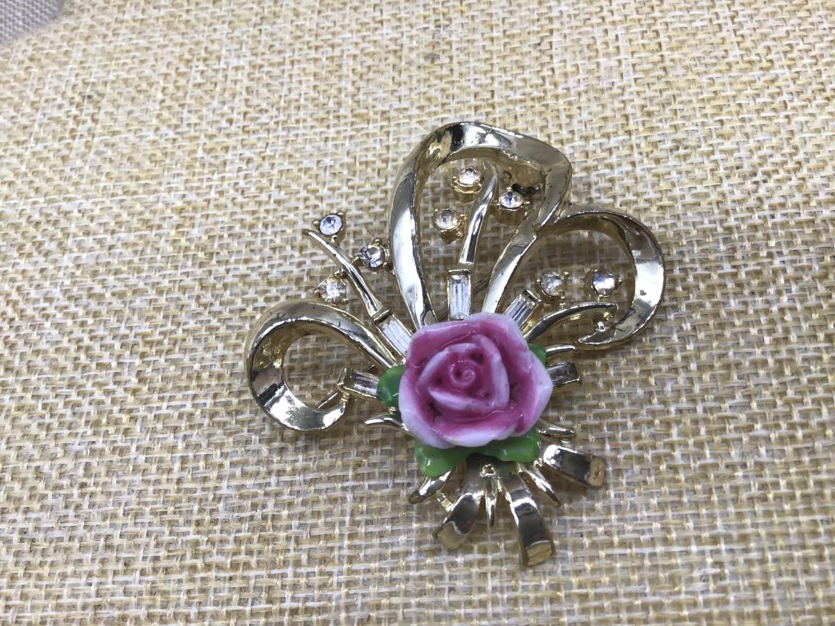 Vintage Brooch Gold Tone Porcelain Ceramic Floral Multicolor Rose