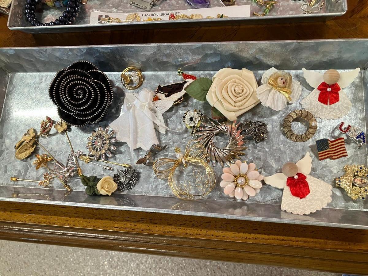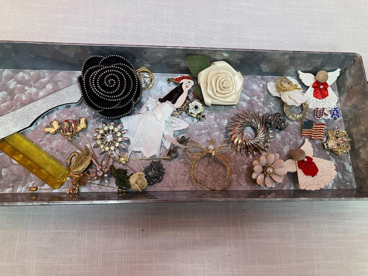 Collection of 30 vintage brooches of various sizes and materials, and 1 vintage folding comb