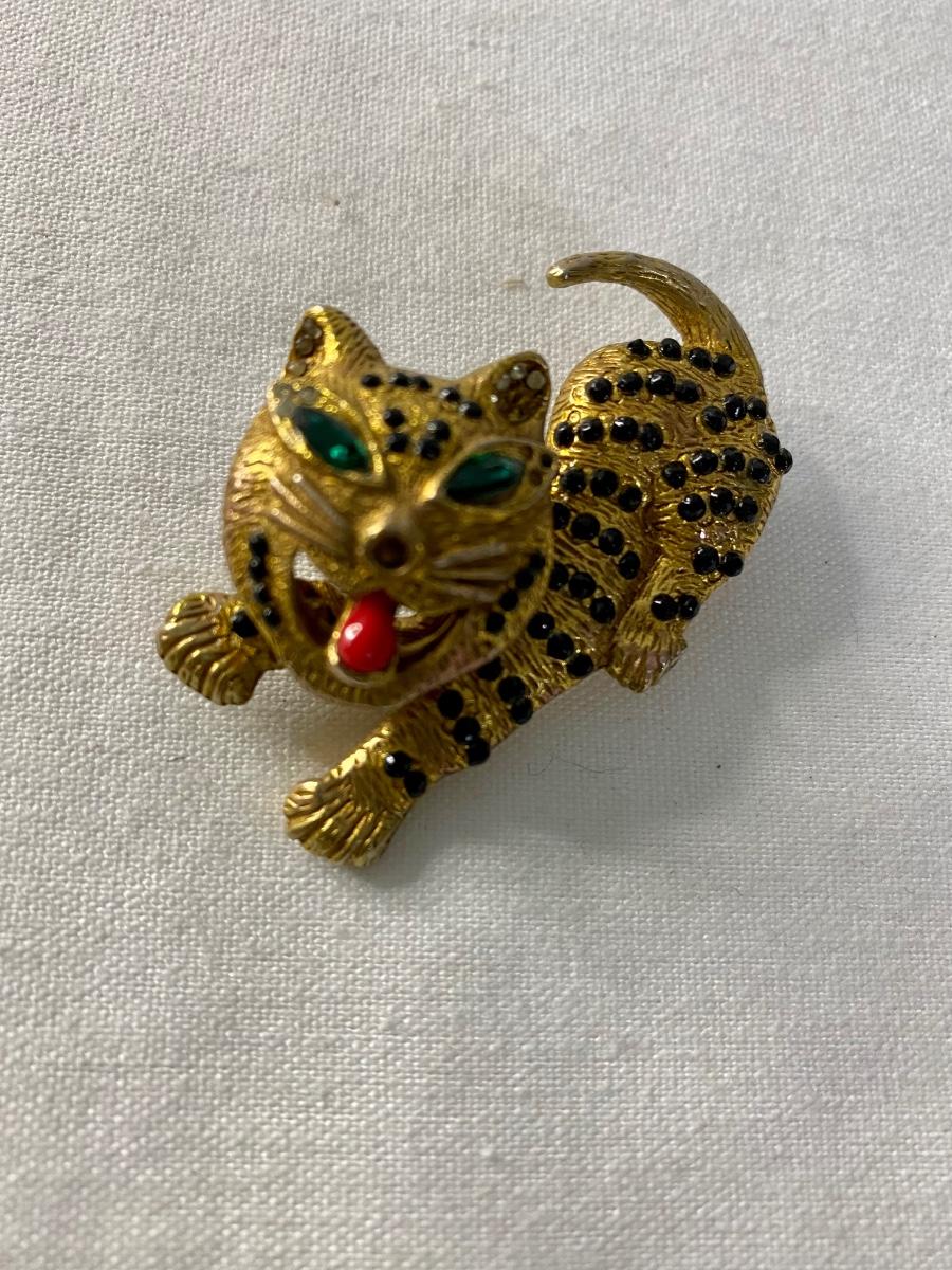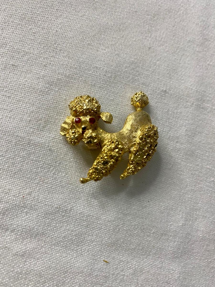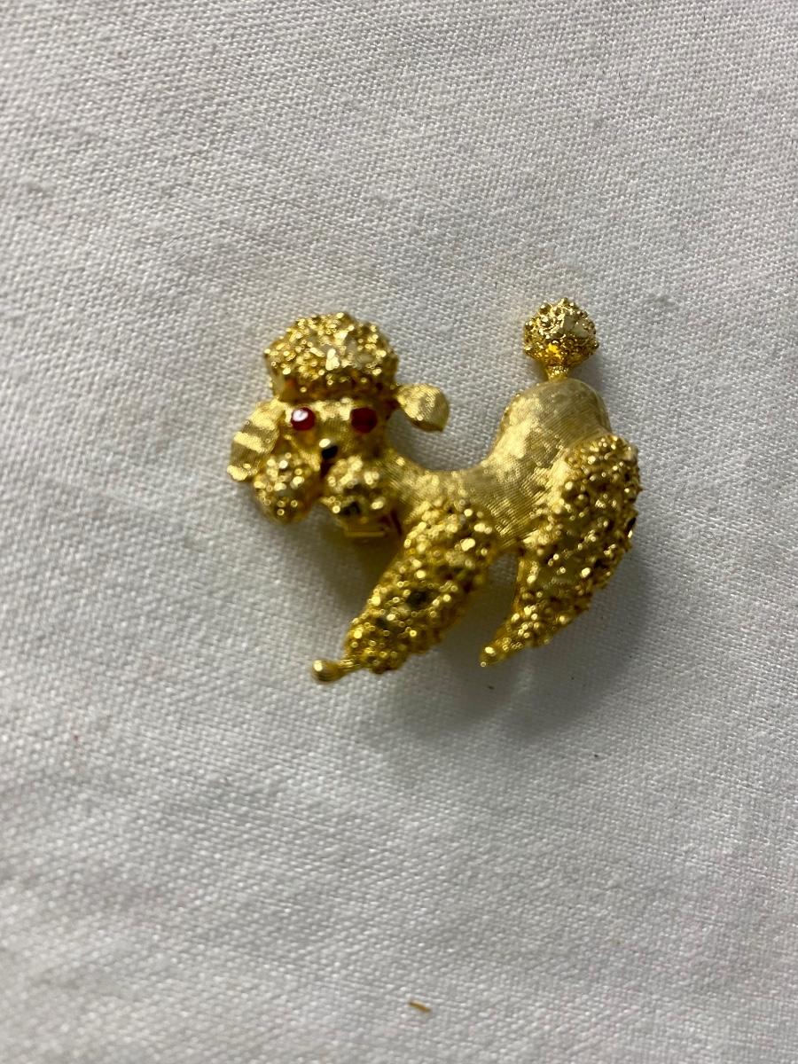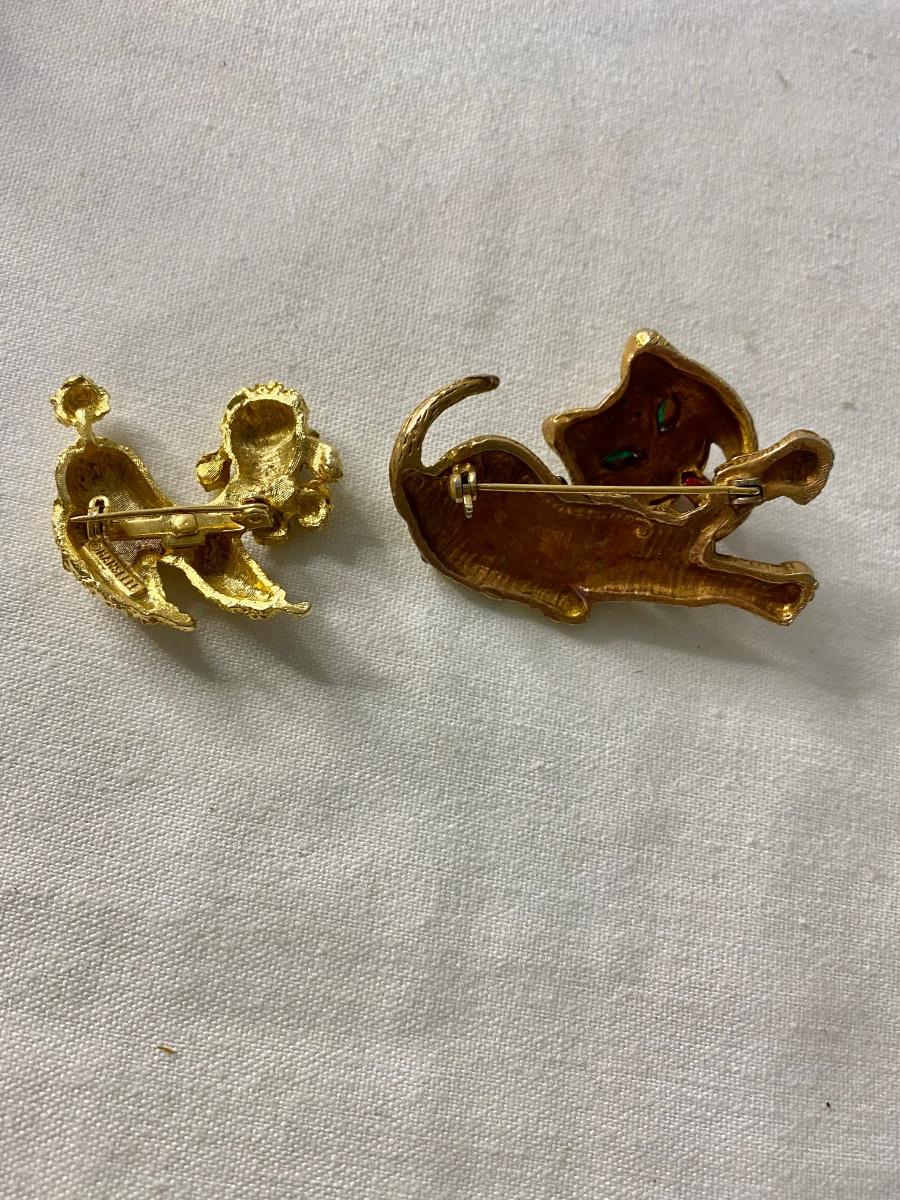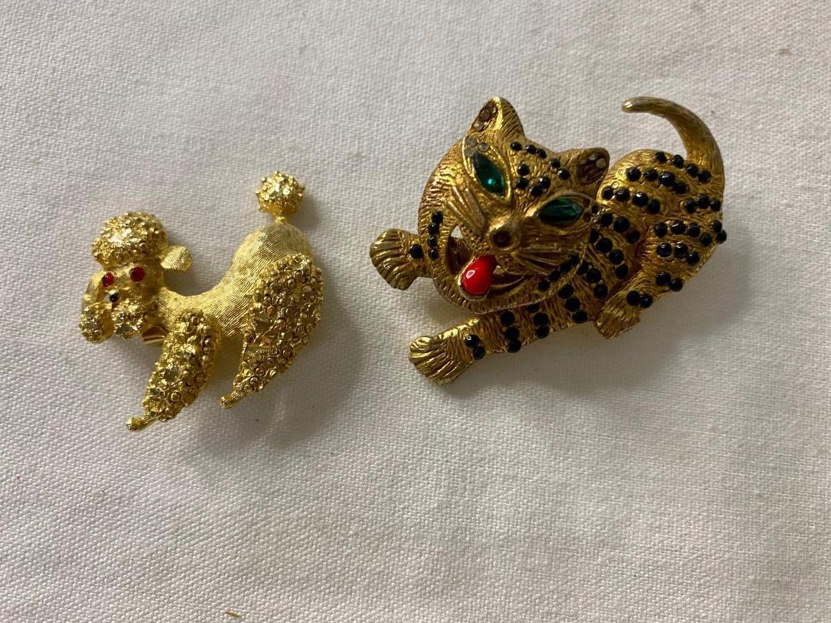 Set of 2 brooches. 1 1960’s Poodle brooch 1’X1’ and 1 Tiger Cat with Black, red and Emerald green stones. 2 1/2’ X 1 1/2’.