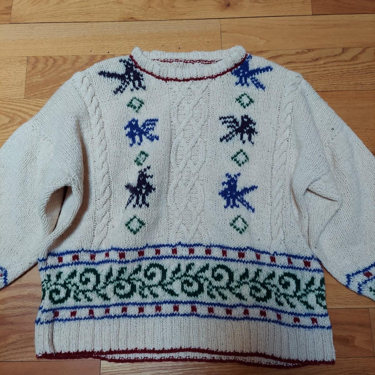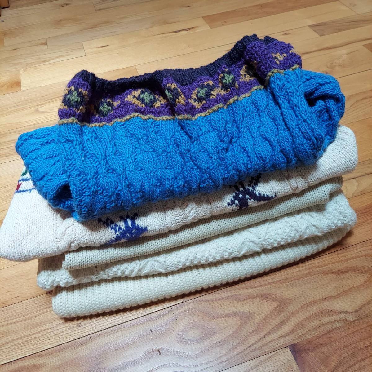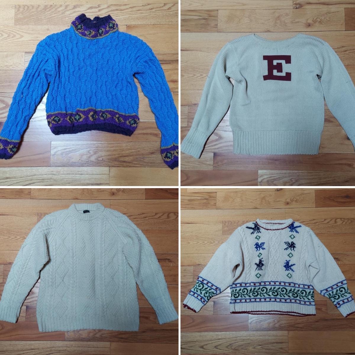Lot includes five Sweaters that appear to be wool. Two sweaters are handmade and do not have tags. Sweaters are in varying sizes. Please see photos for details. Shipping available