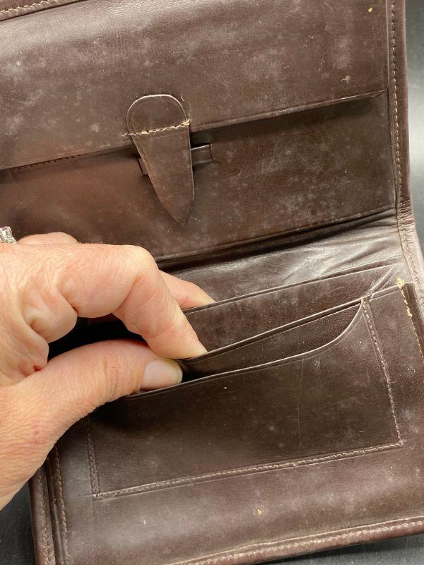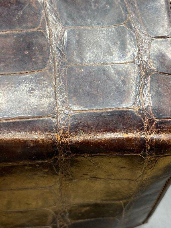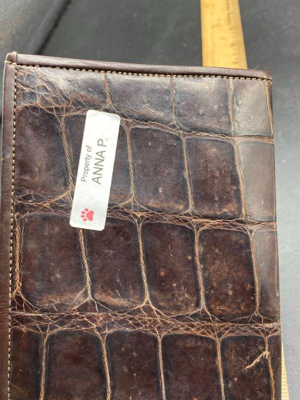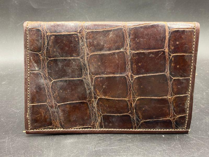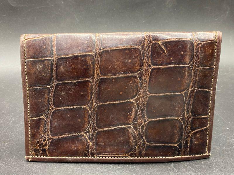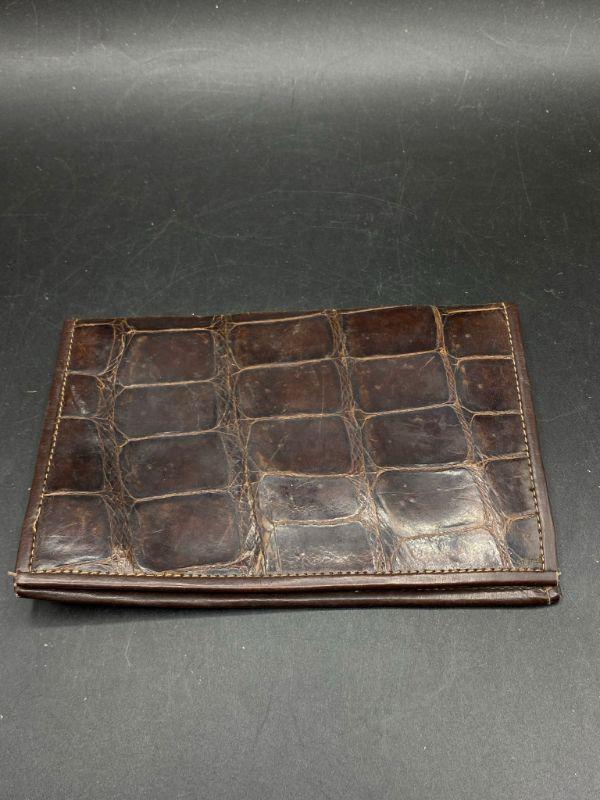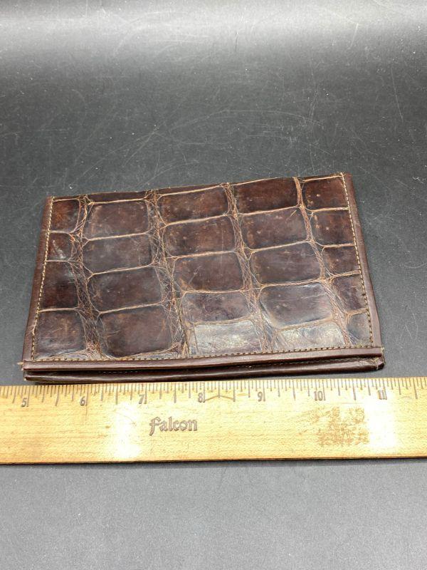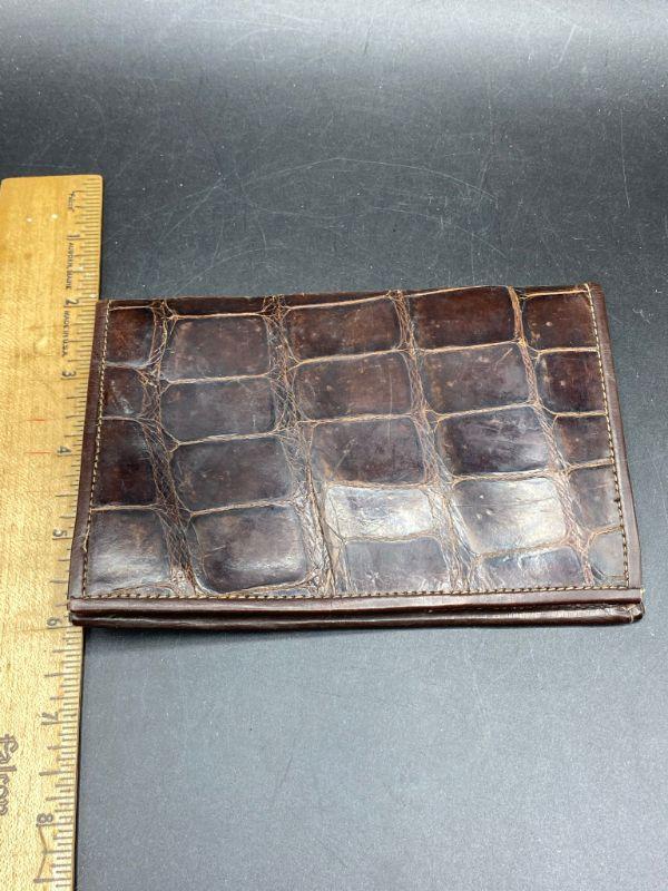 Vintage brown alligator wallet. No markings or maker. Feels real, but not sure. Has signs of age and discoloration from storage. About 6" wide.