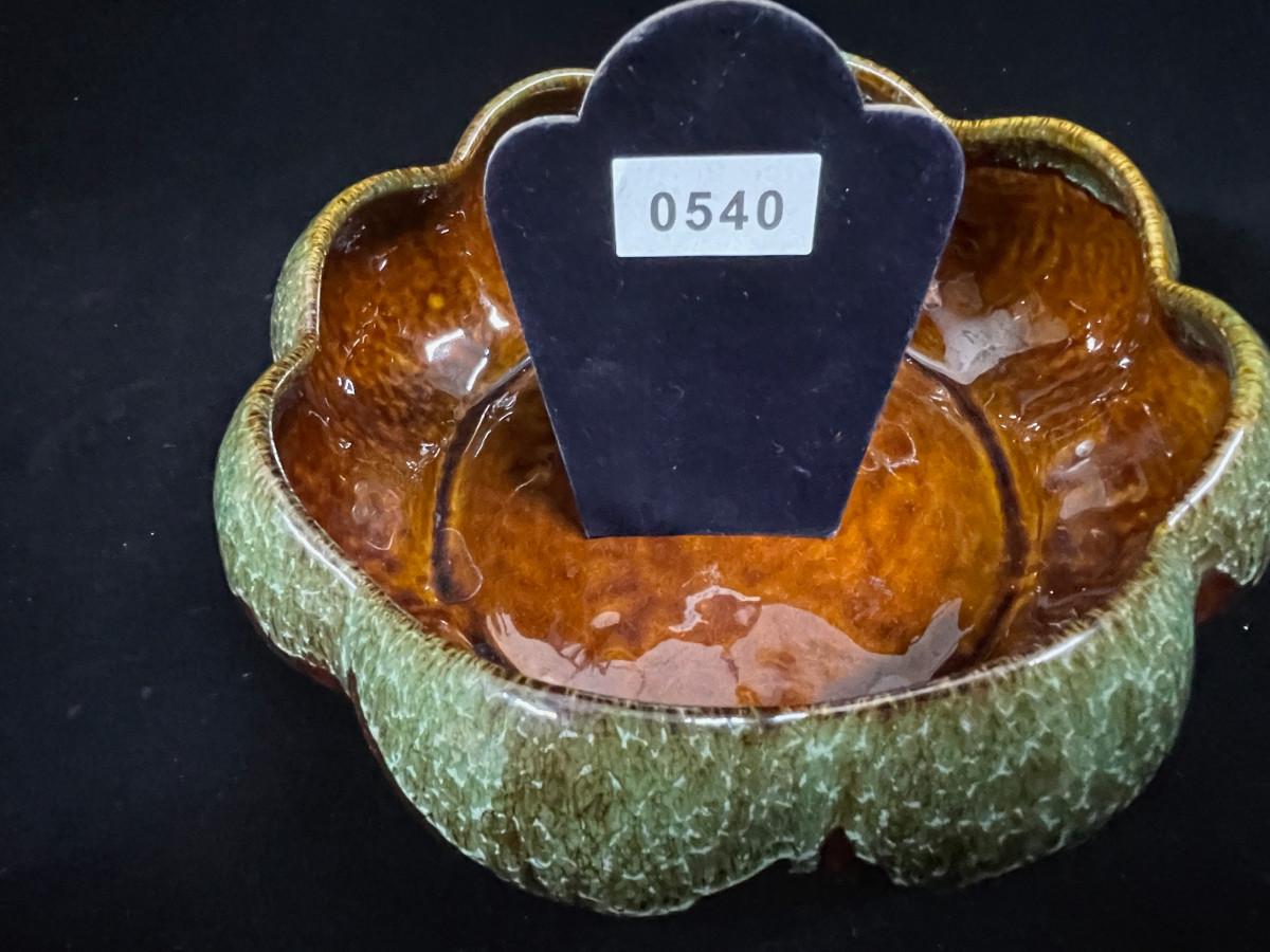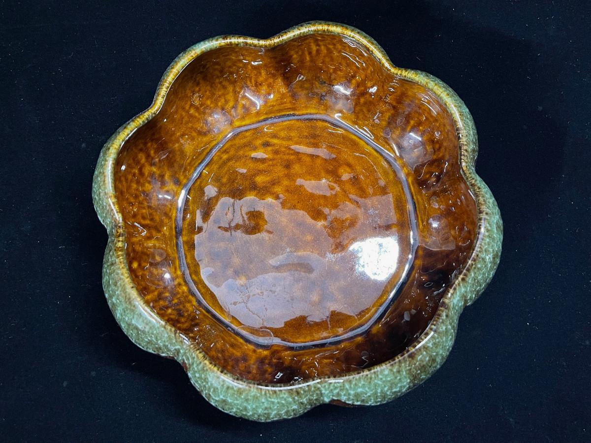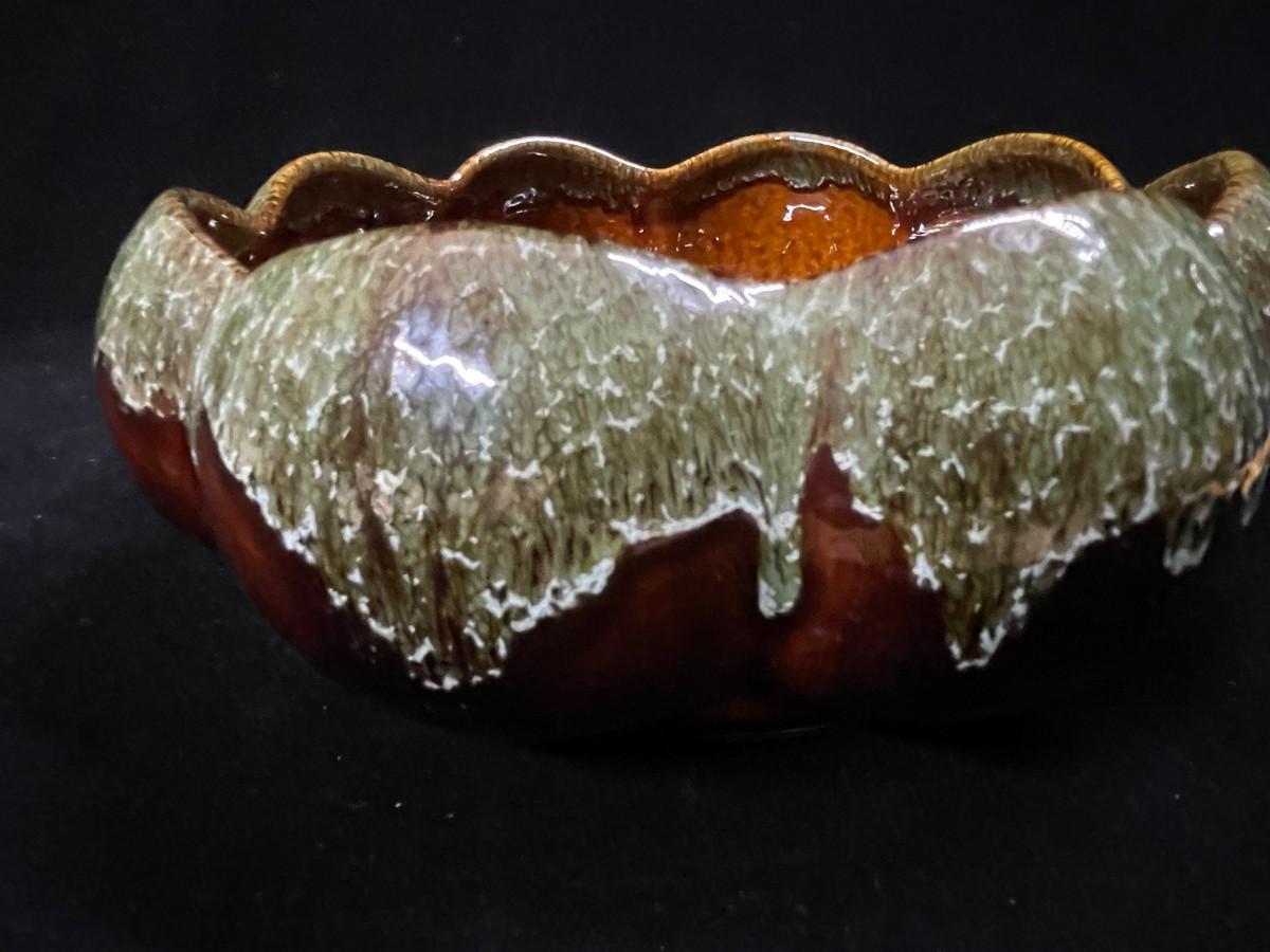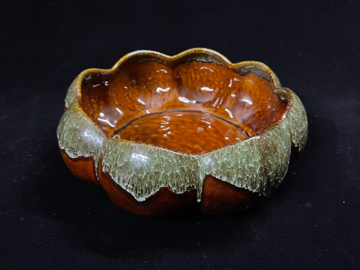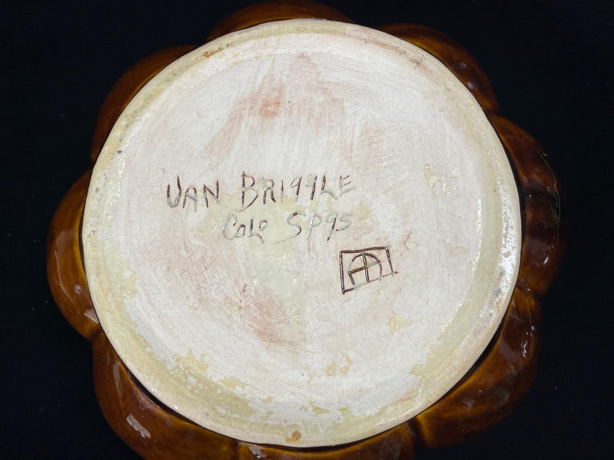 DESCRIPTION: This lot is a vintage floral-form bowl incise-marked “Van Briggle, Colo. Spr” and includes the company chop mark. The lobed floral form is glazed brown to green and has been overgrazed with a lava type pour around the shoulder. Unique shape!