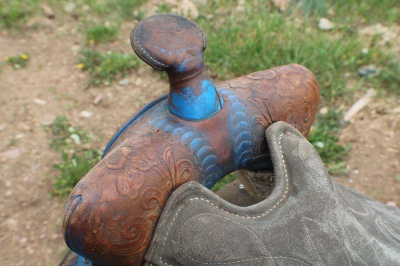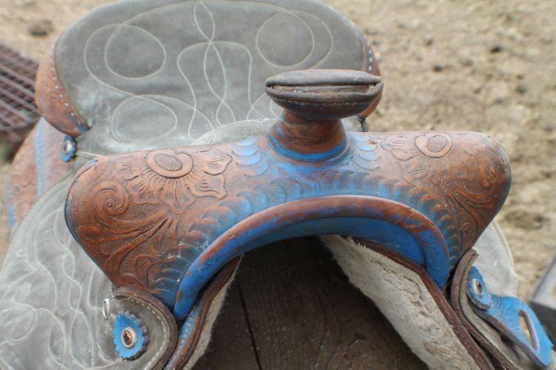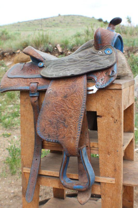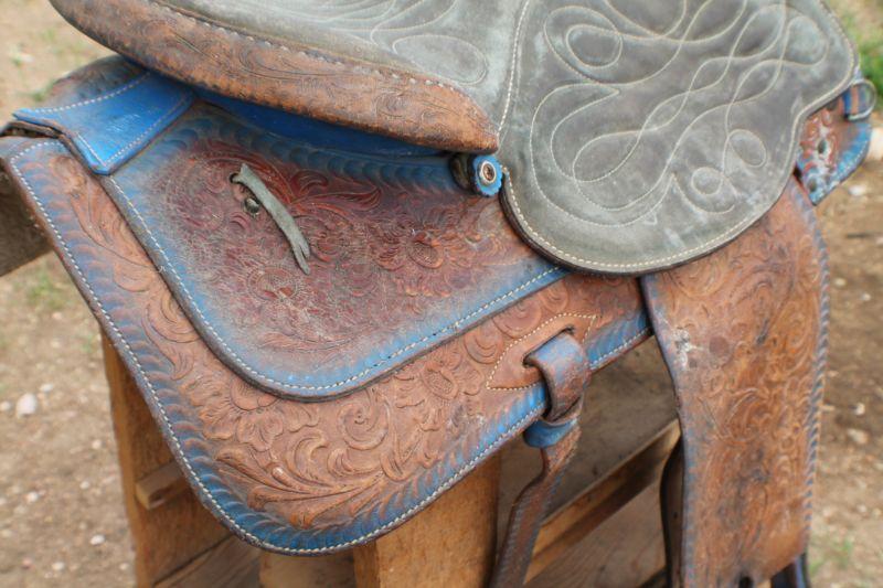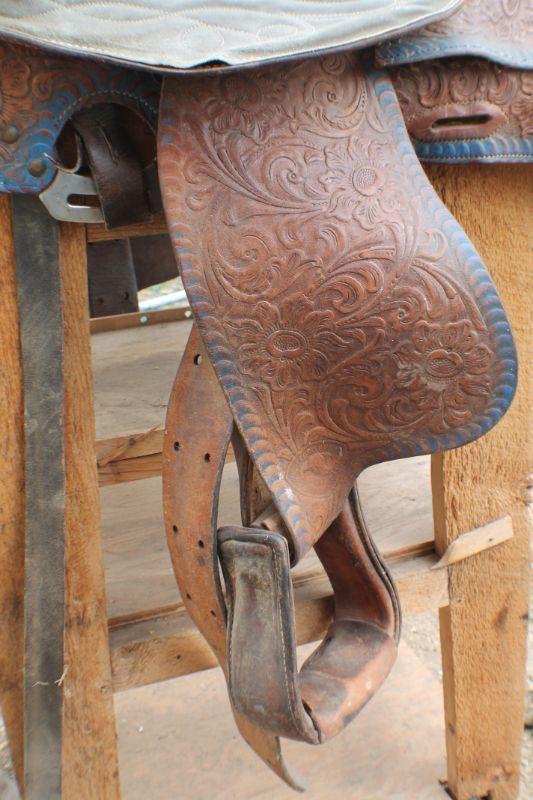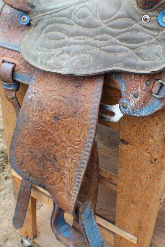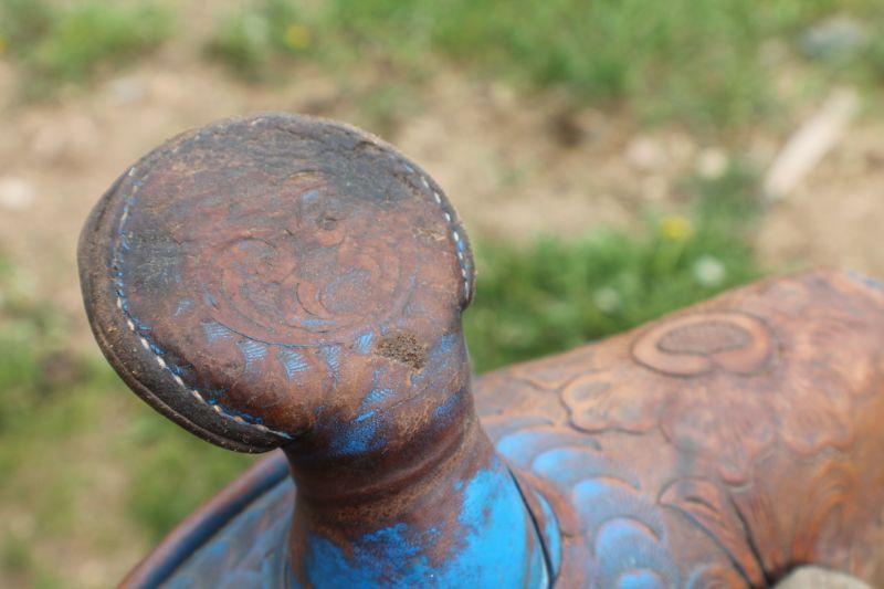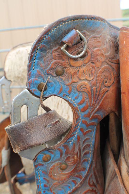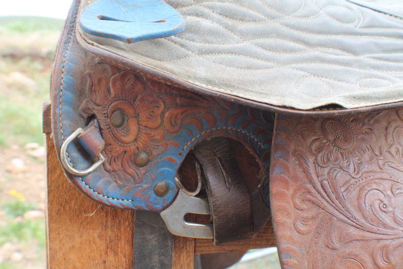 Lot #8: Vintage Brown Leather Hand Tooled w/ Blue Accents Horse Saddle