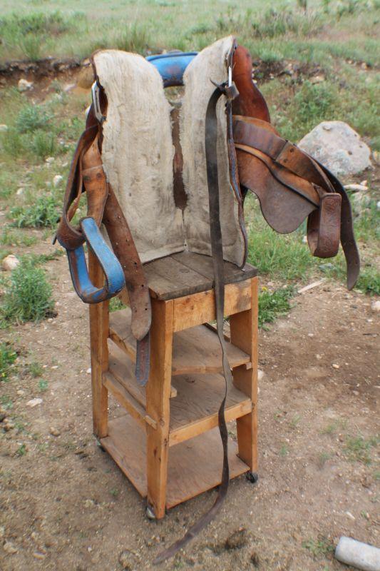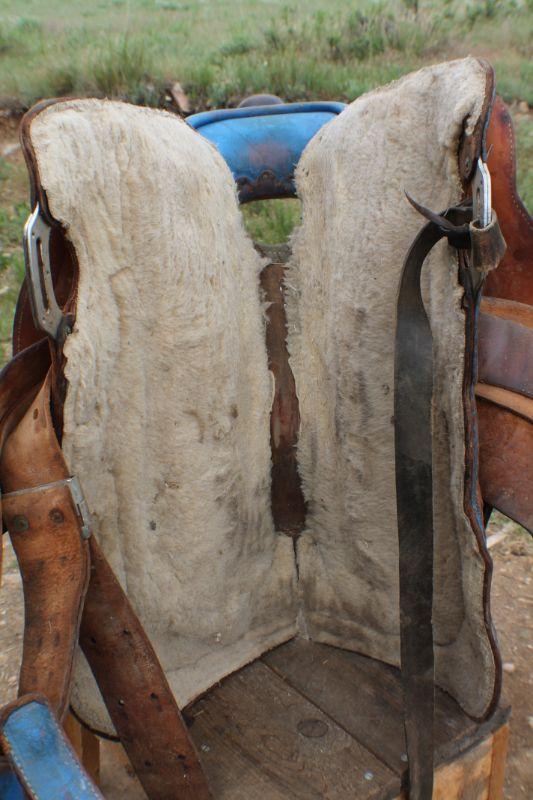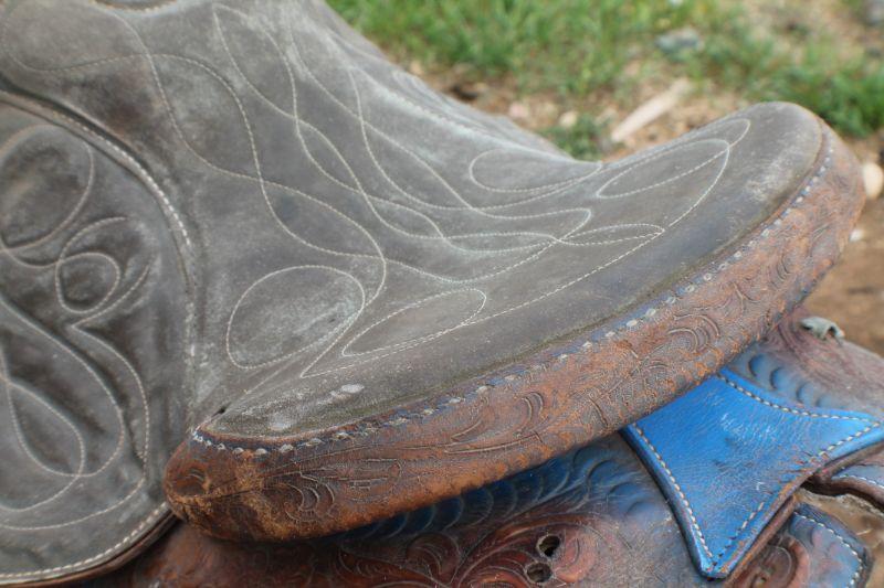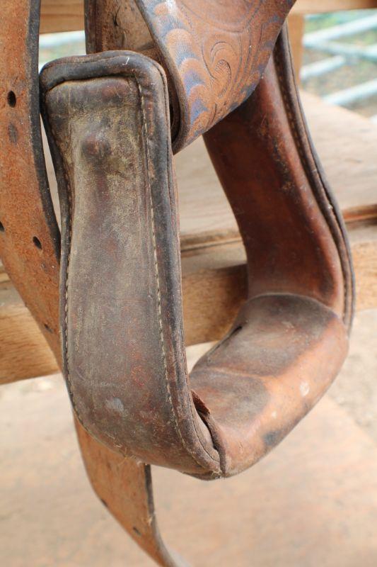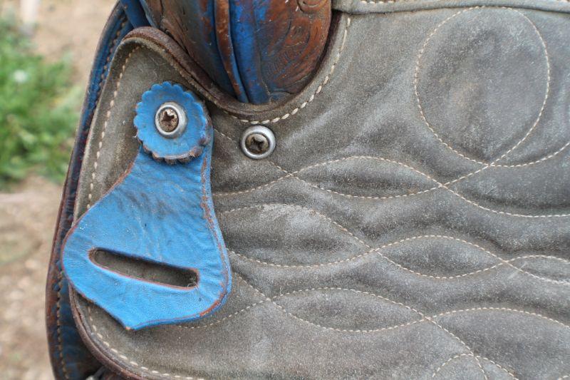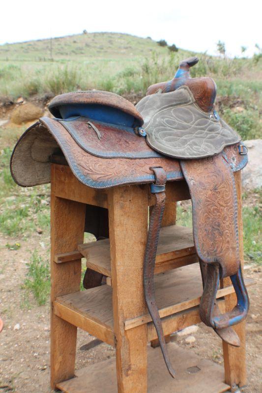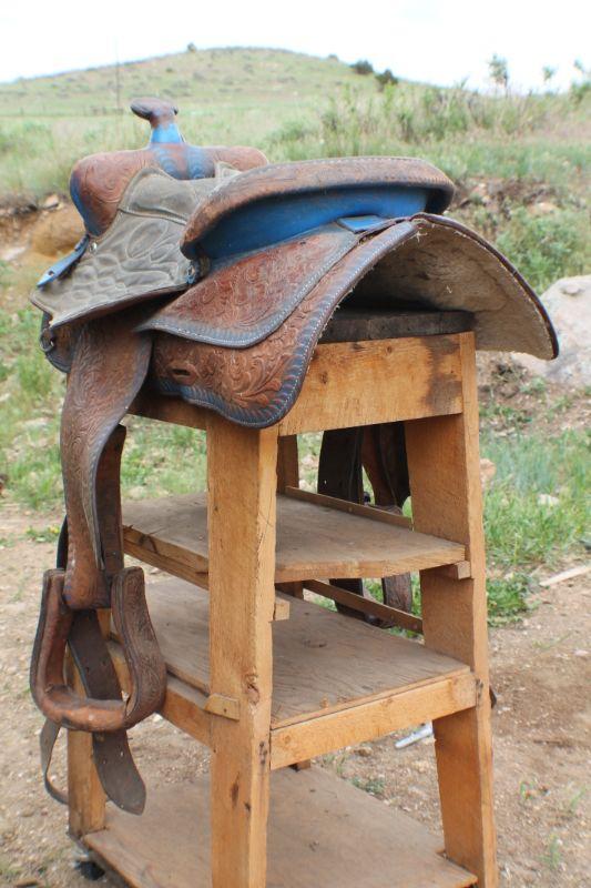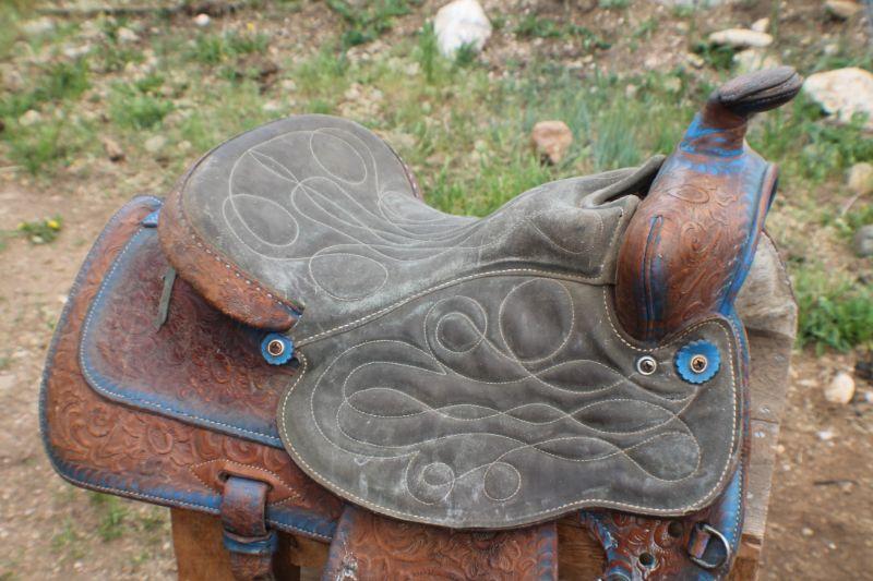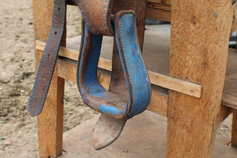 Lot #8: Vintage Brown Leather Hand Tooled w/ Blue Accents Horse Saddle