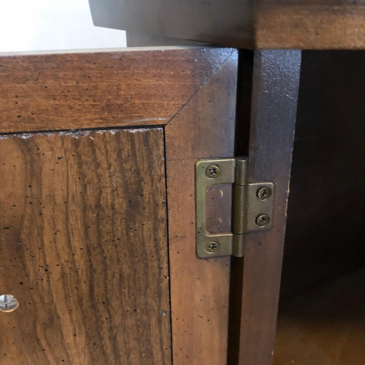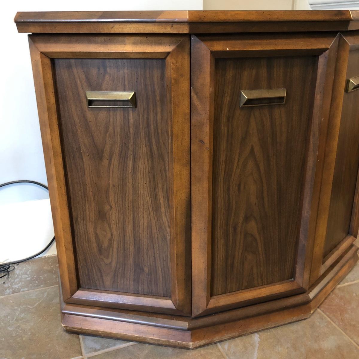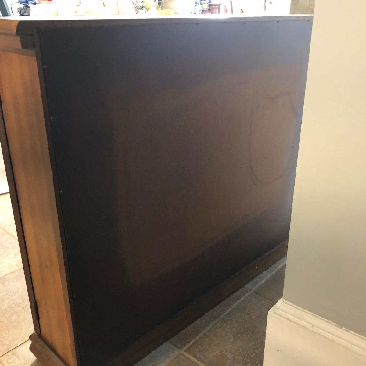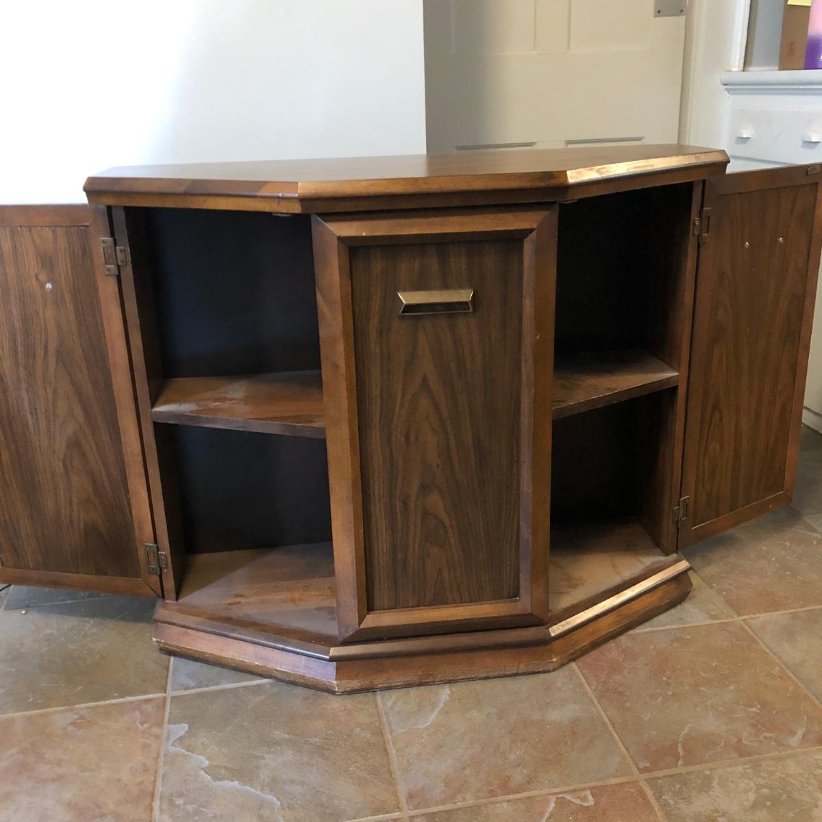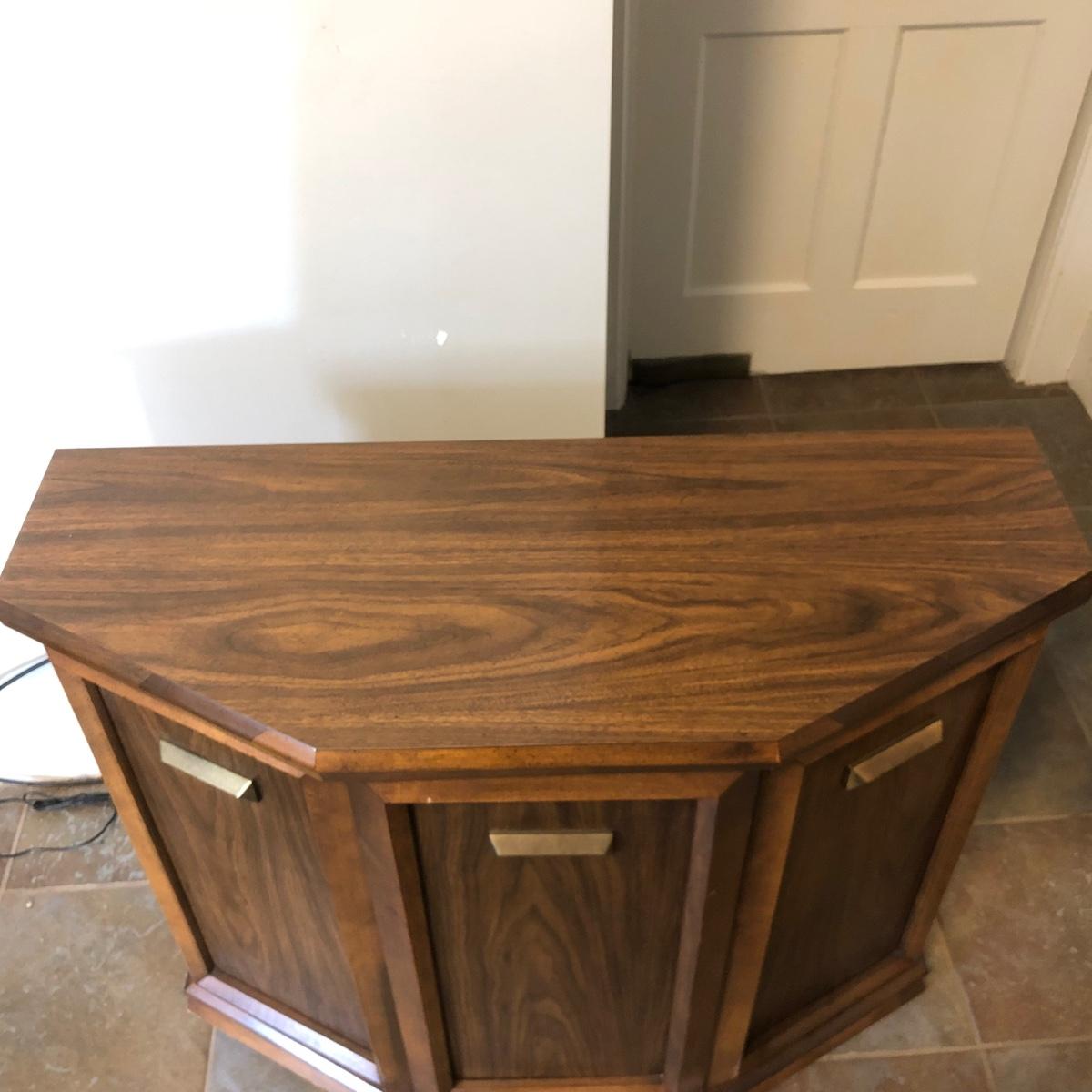This vintage short brown cupboard has 2 opening doors with shelf storage inside. It measures 35" x 14" x 29.5" and is made of particle board with veneer. Local pickup only.