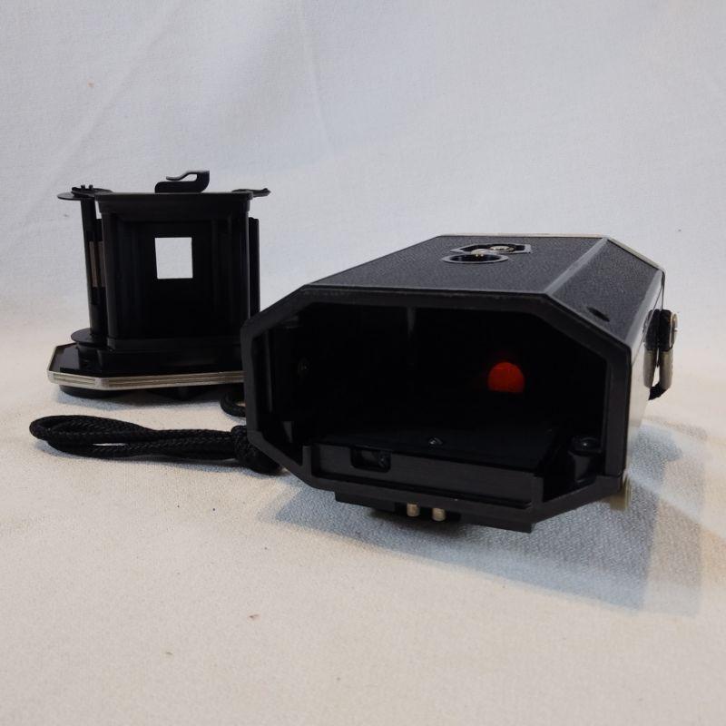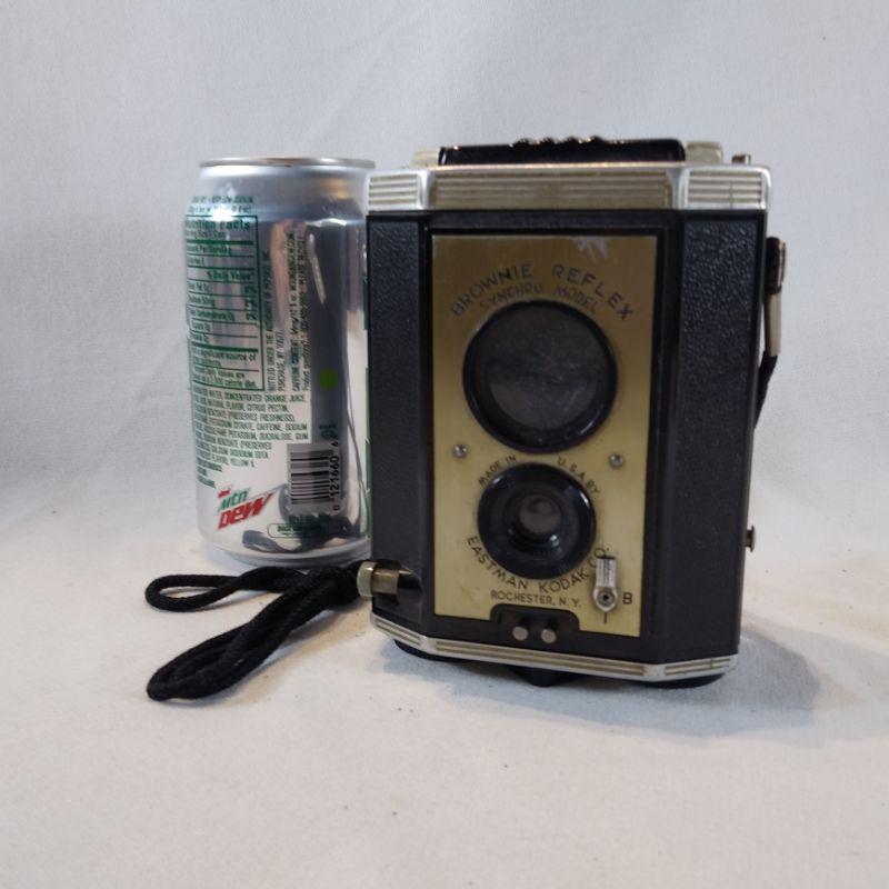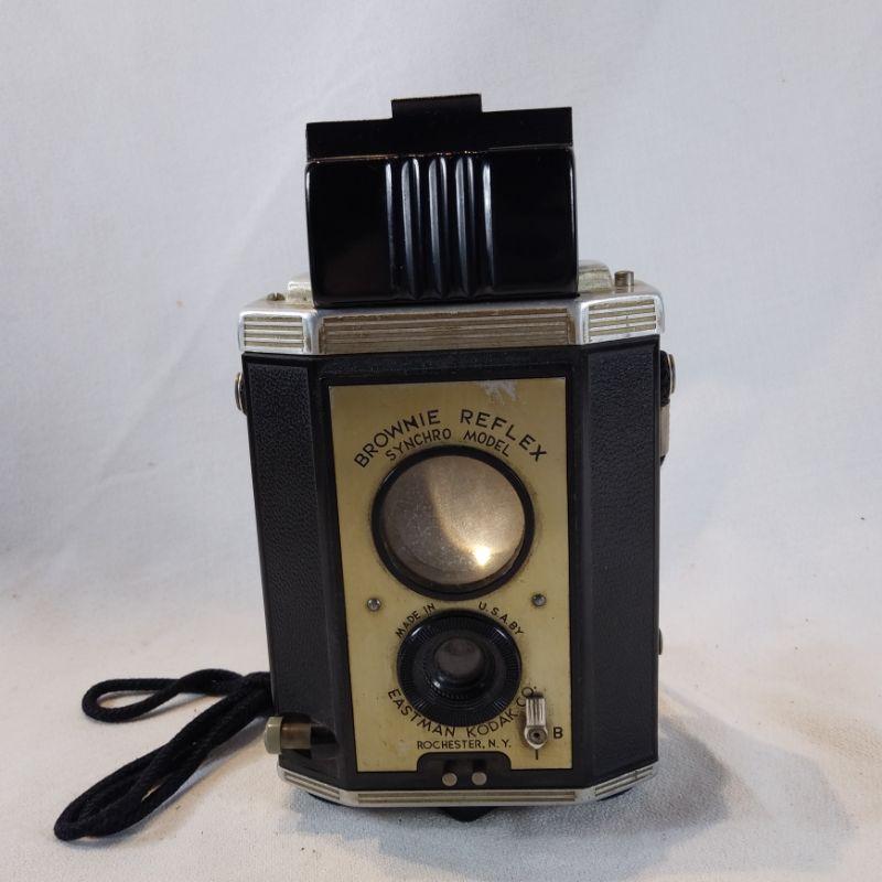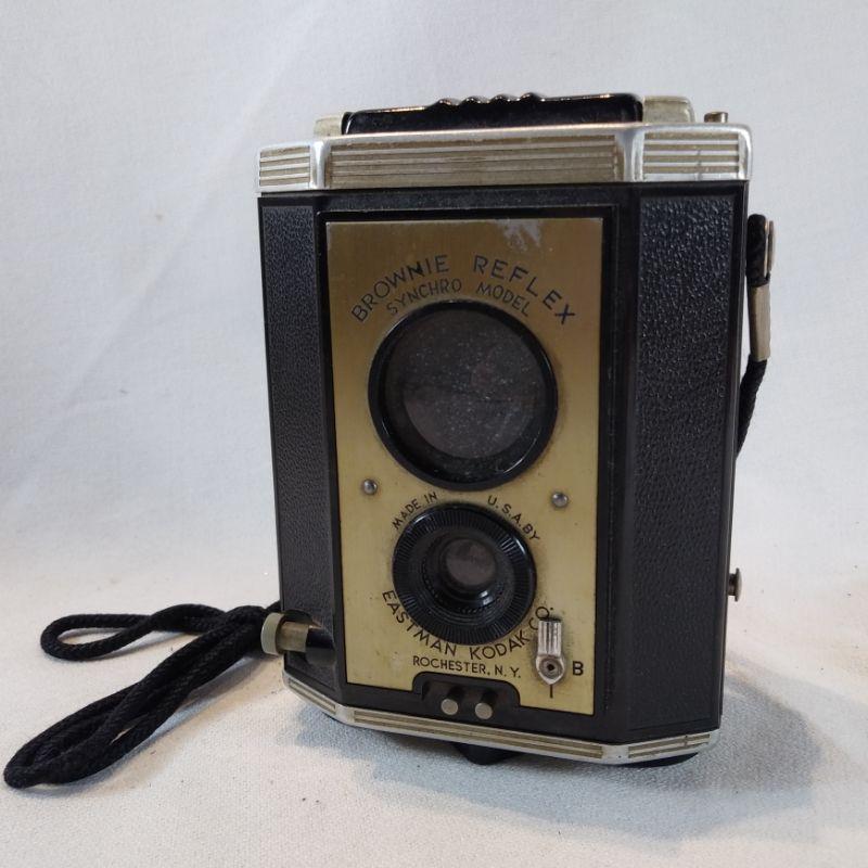 A vintage Brownie Reflex Synchro Model - made in USA by Eastman Kodak Co., Rochester, NY. Looks like all the parts are there and working. It is 5-inches tall. It's a nice old camera even if you just want to own it to sit on a shelf and look pretty.