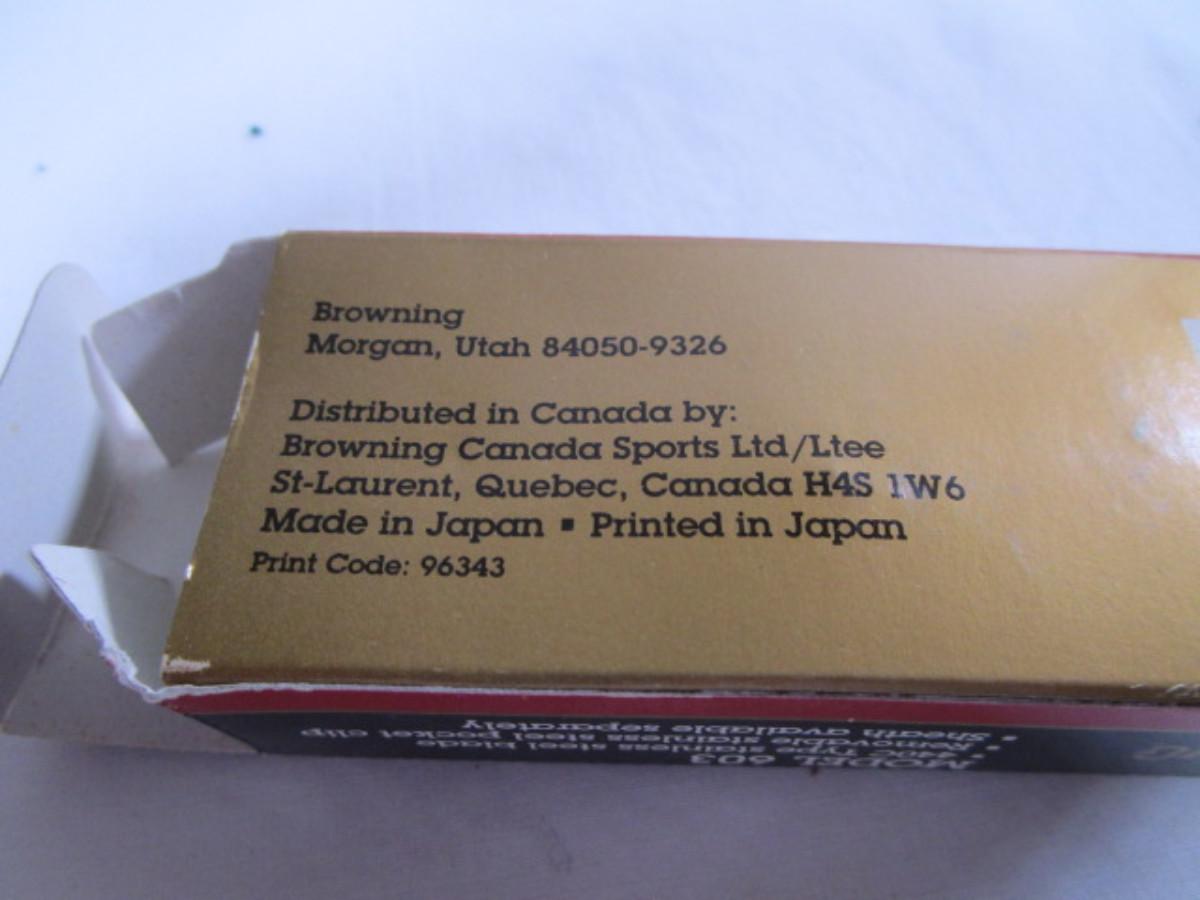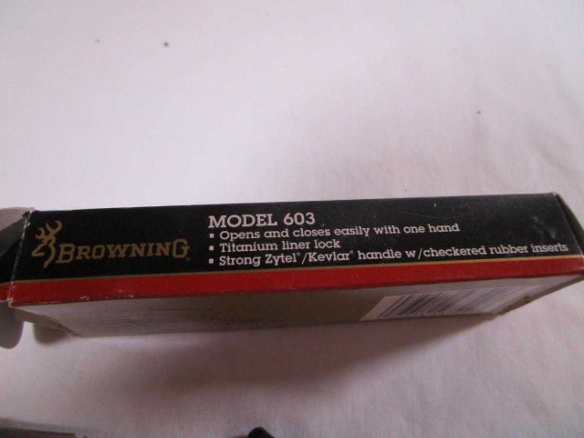 Model 603, new in box, blade is 3-1/2" long, overall length is 8", knife folds & 4-1/2" when closed.