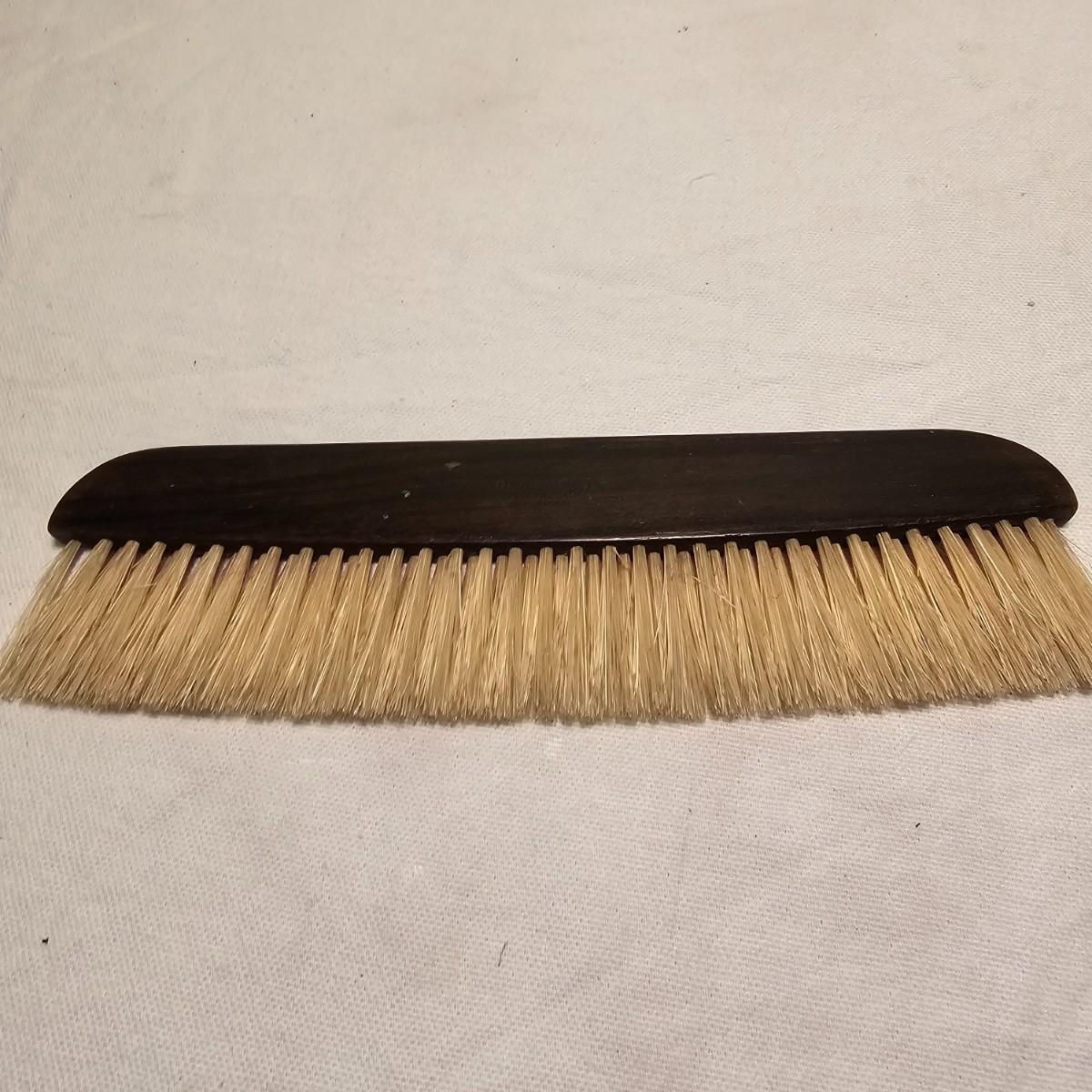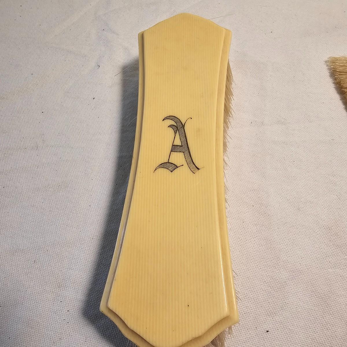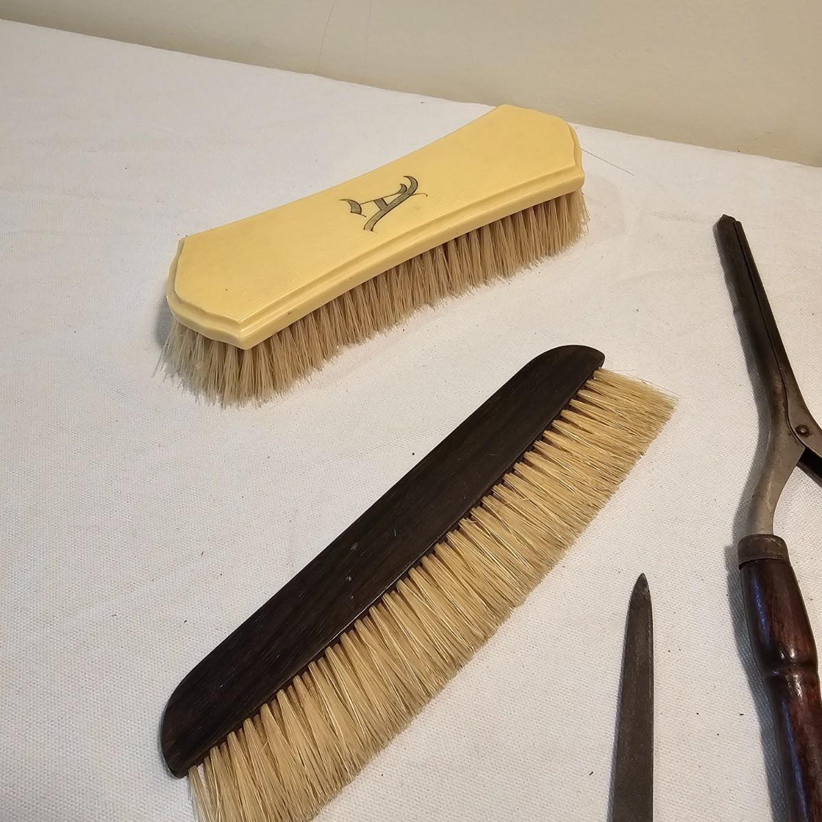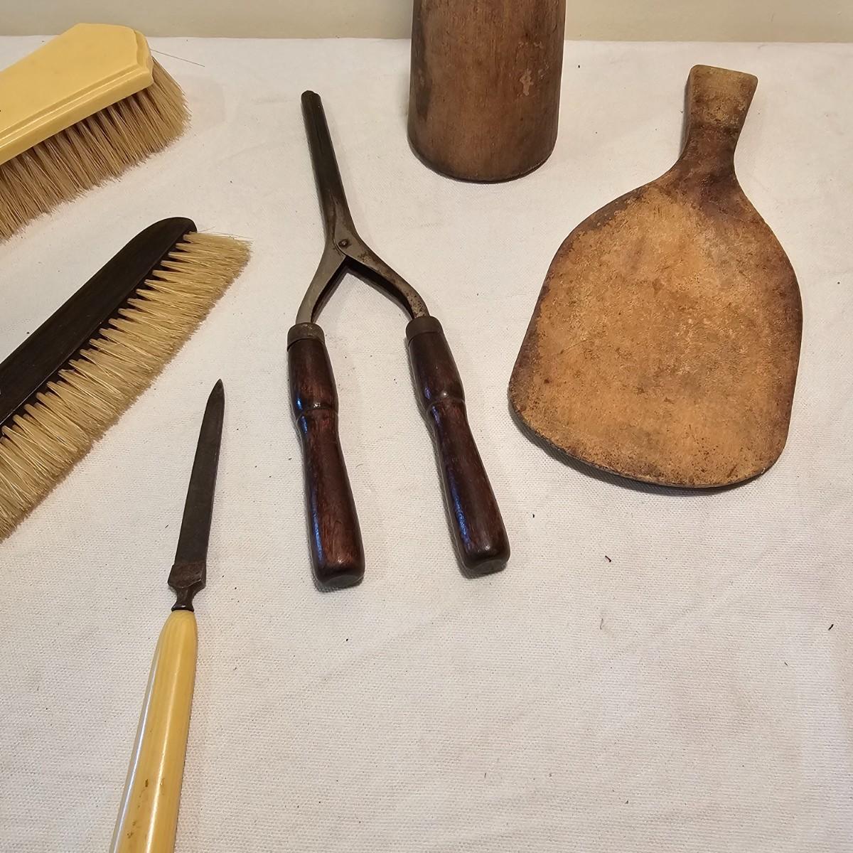 Some individual vintage items. A pair of clothes brushes. The larger item with the initial 'A' appears to have a celluloid back. The flat brush is 7.5" x 2", is marked "real ebony, sterilized, Japan". Nail file is 7" long. Also includes a curling iron, potato masher, and butter ladle. The leather item is a corn shucker worn on the hand for protection. See photos for details. Shipping available.