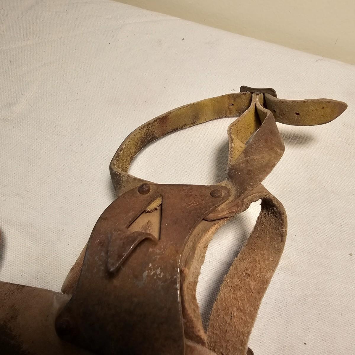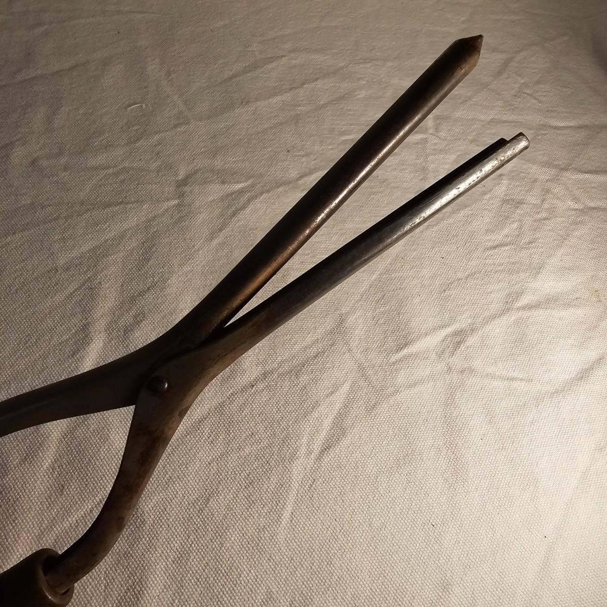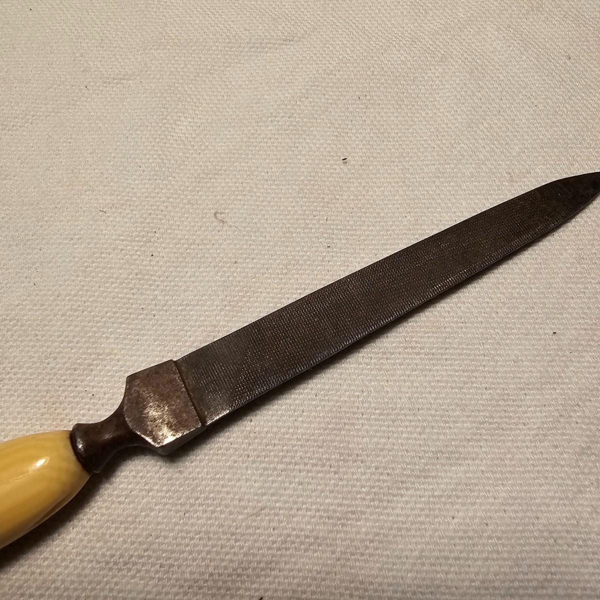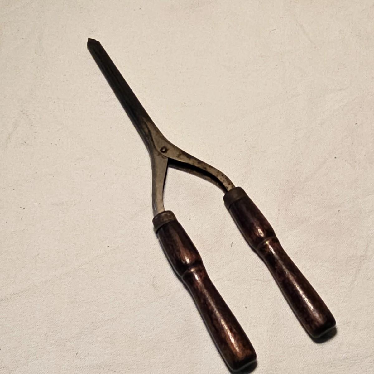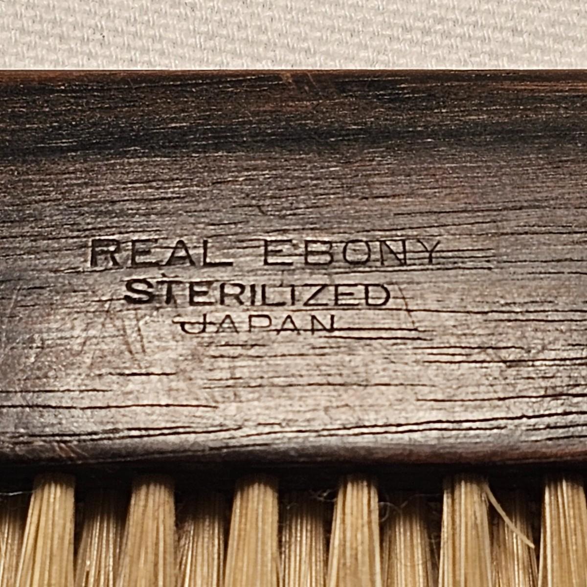 Some individual vintage items. A pair of clothes brushes. The larger item with the initial 'A' appears to have a celluloid back. The flat brush is 7.5" x 2", is marked "real ebony, sterilized, Japan". Nail file is 7" long. Also includes a curling iron, potato masher, and butter ladle. The leather item is a corn shucker worn on the hand for protection. See photos for details. Shipping available.