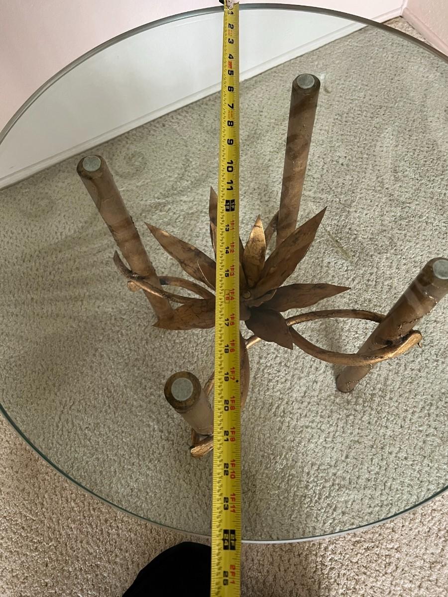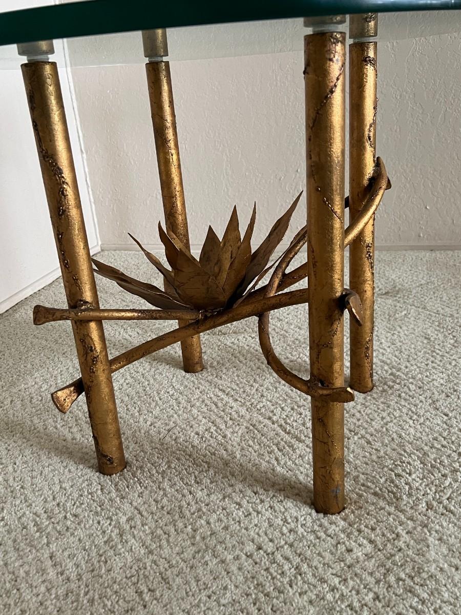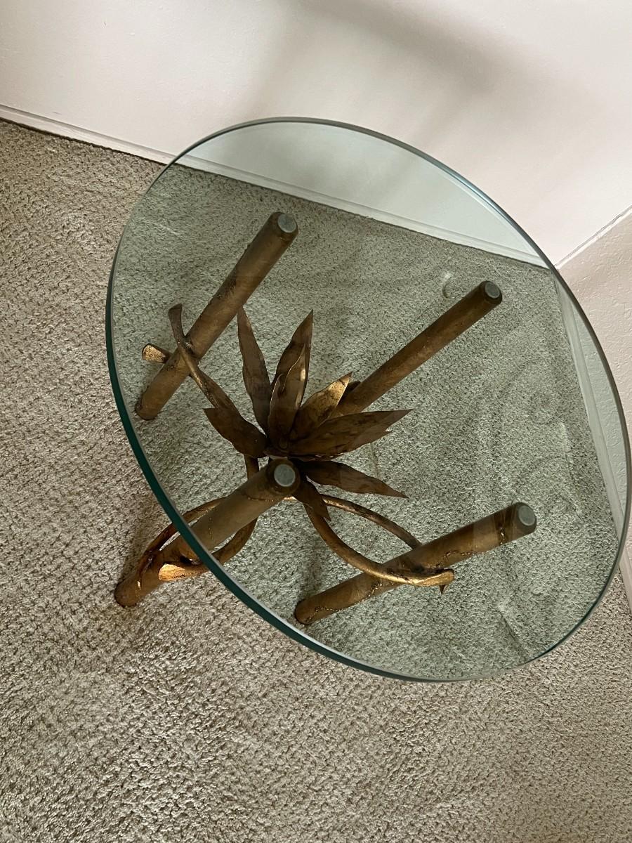 Vintage Brutalist Hollywood Regency MCM Silas Seandel Lotus End Side Table. Gold gilt regency style with lotus flower center base, round glass table surface. In good vintage condition. About 24" diameter and 19" tall. Matching coffe table available in this auction.
