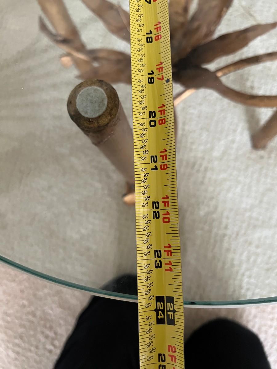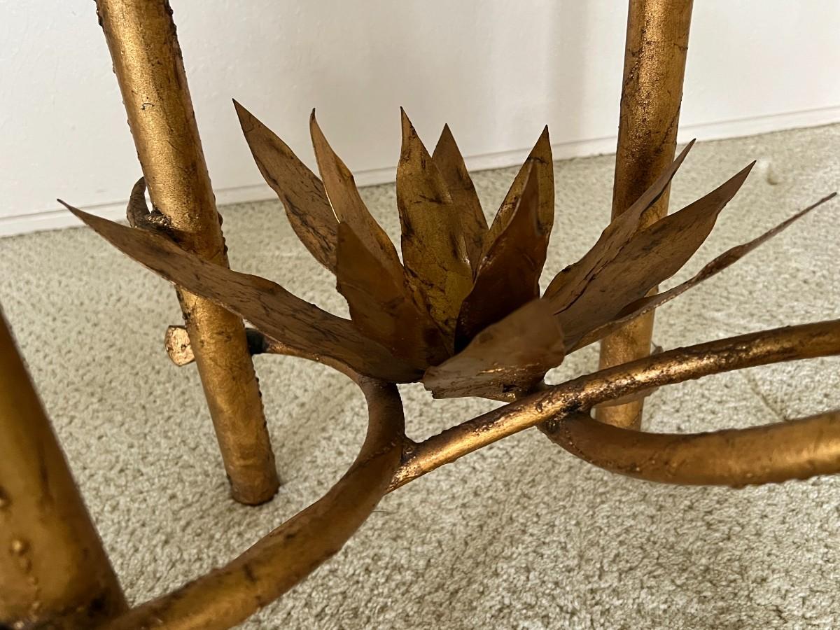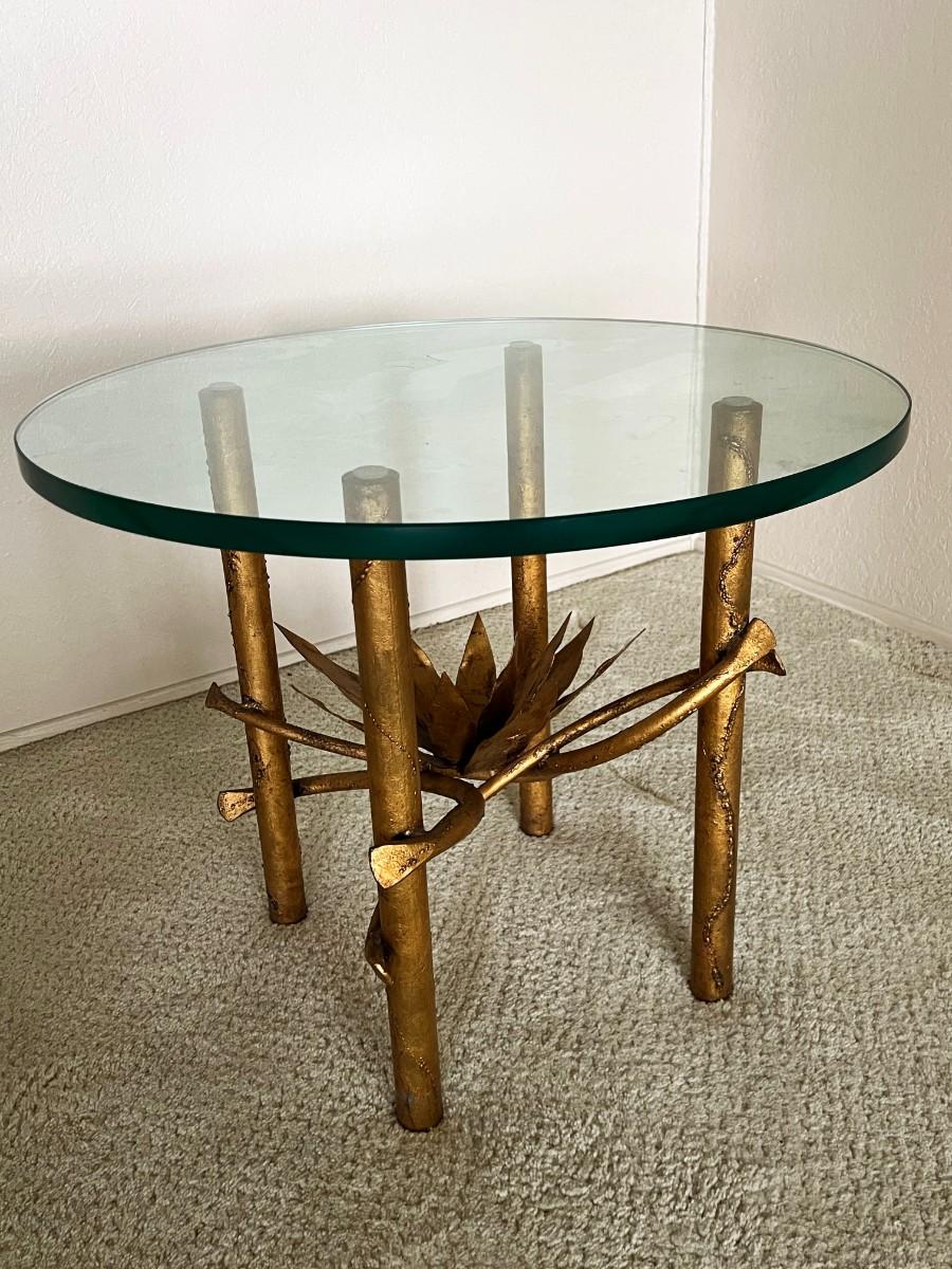 Vintage Brutalist Hollywood Regency MCM Silas Seandel Lotus End Side Table. Gold gilt regency style with lotus flower center base, round glass table surface. In good vintage condition. About 24" diameter and 19" tall. Matching coffe table available in this auction.