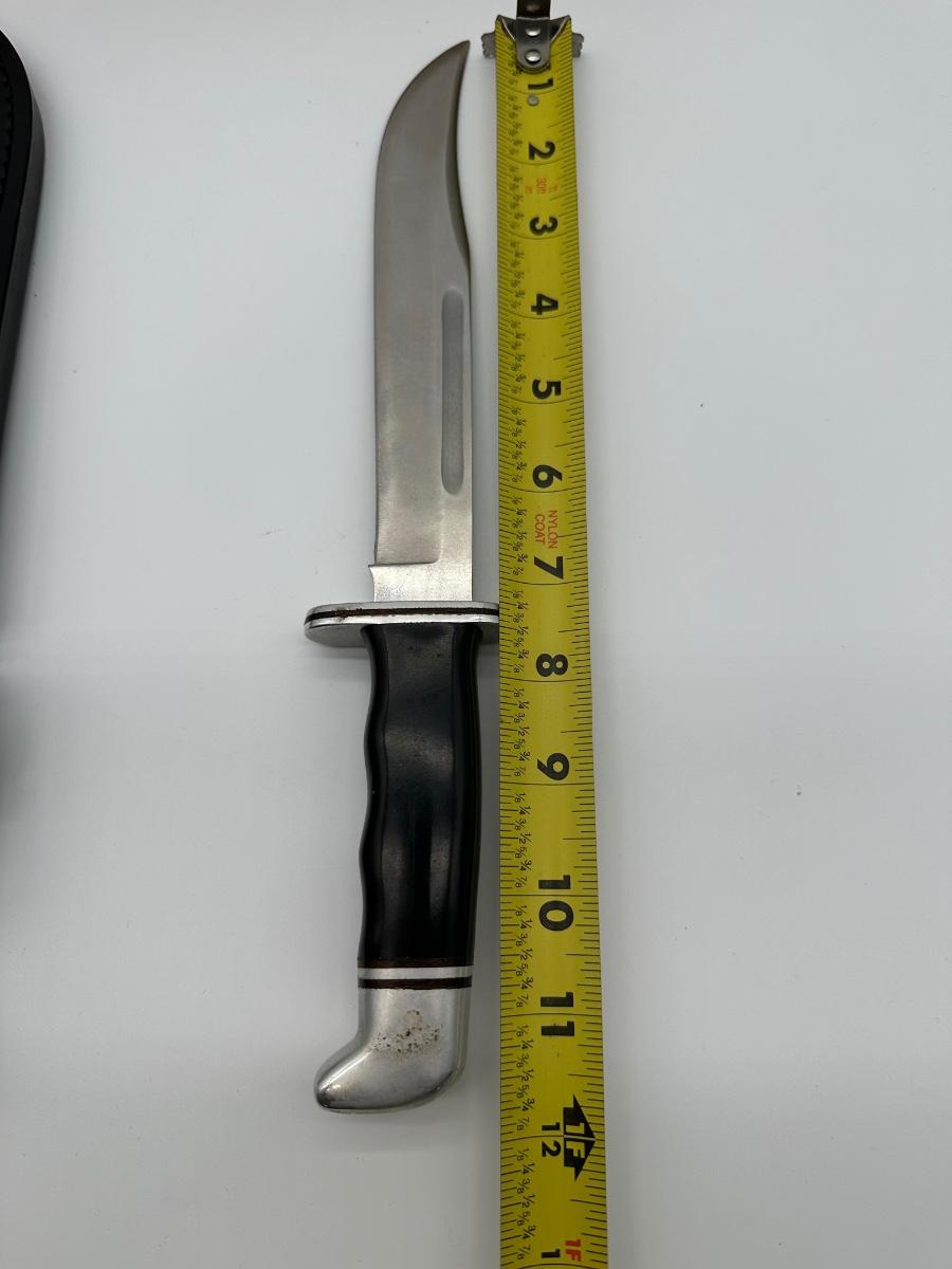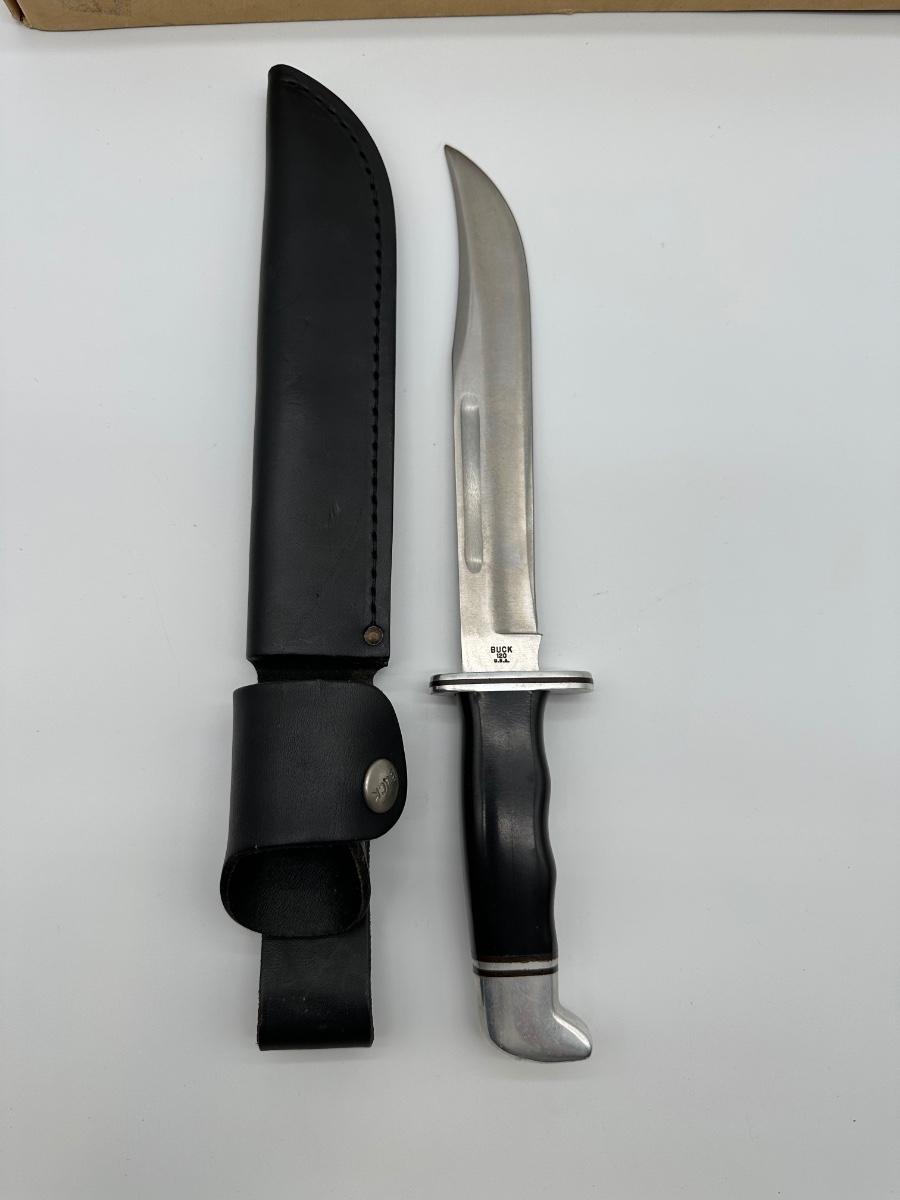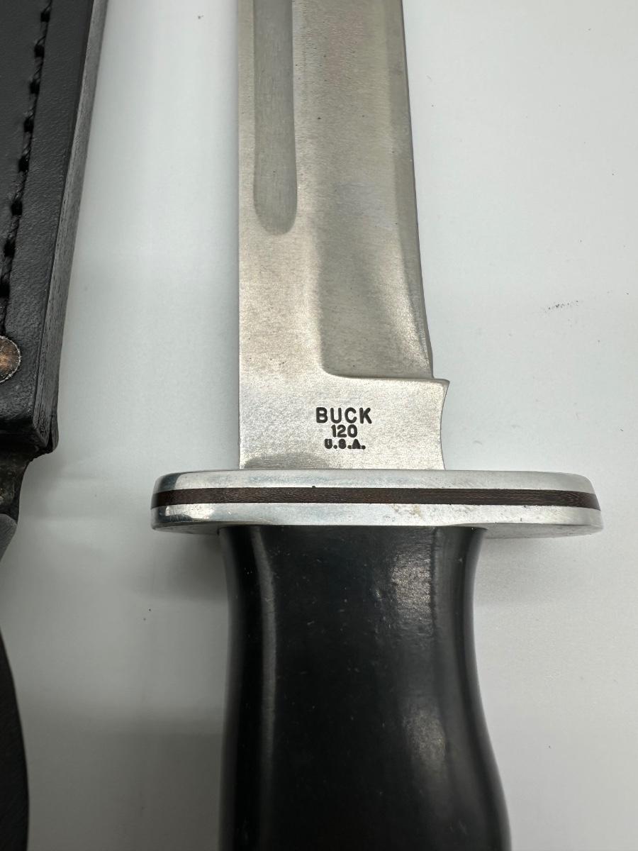 Authentic Buck 120 General fixed-blade knife, made in USA, with original black sheath and Buck box. Classic clip-point blade with fuller, aluminum guard and pommel, black handle. A legendary Buck hunting/utility knife—excellent collector or field piece.