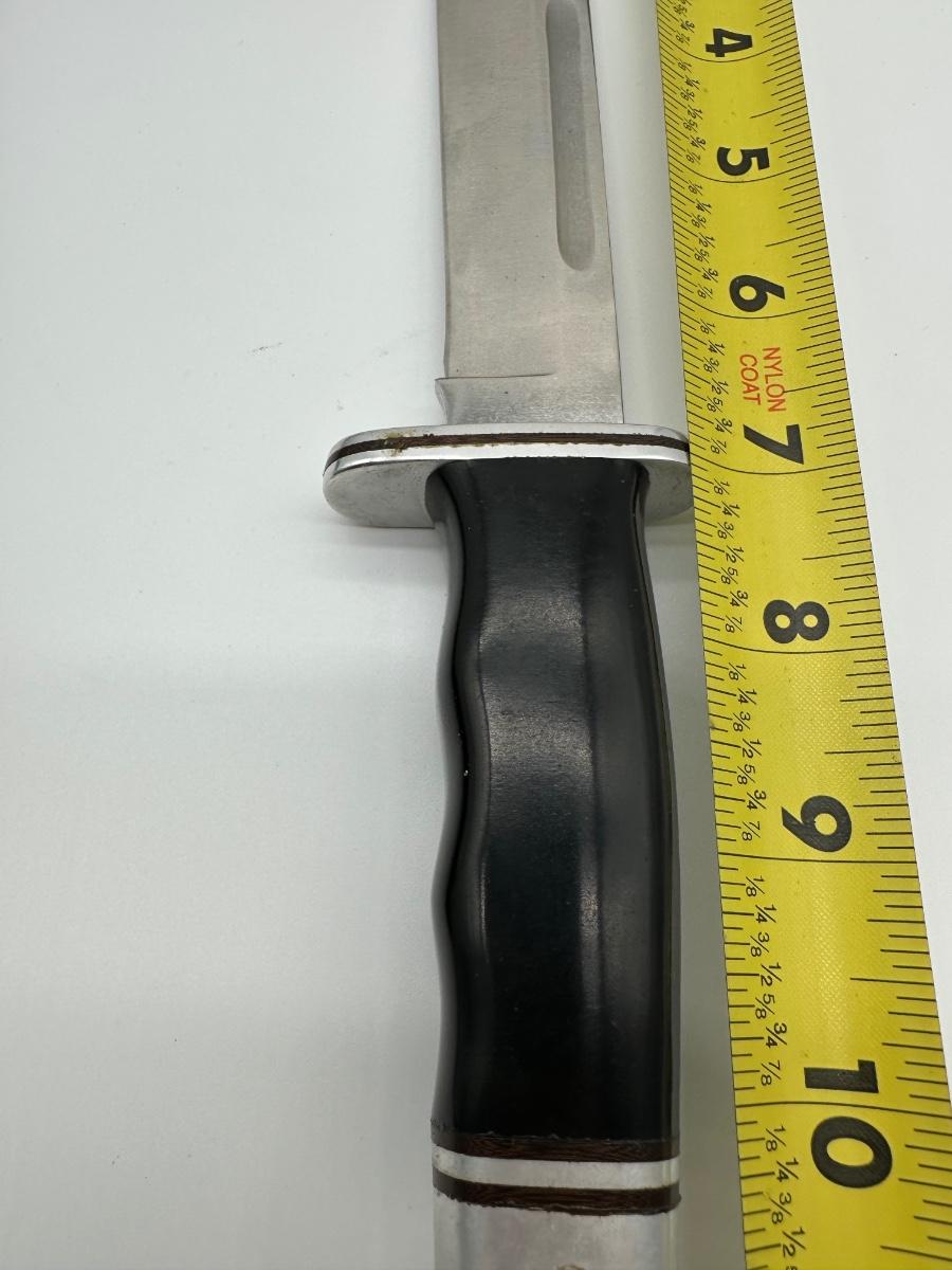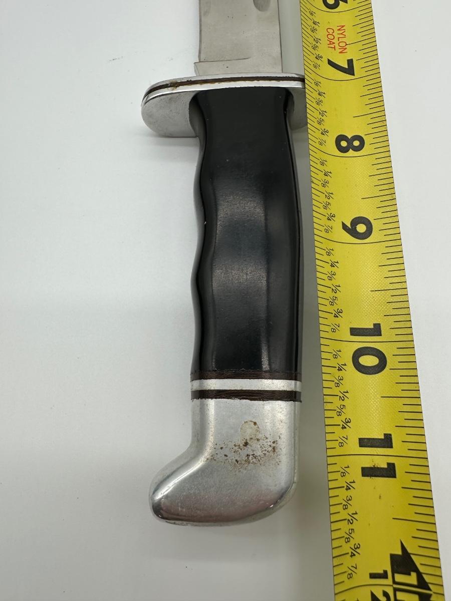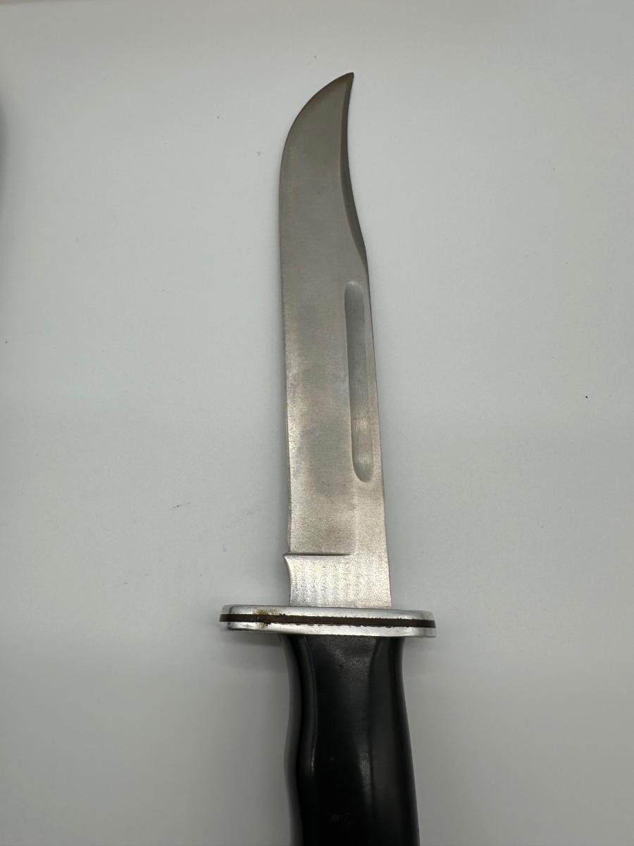 Authentic Buck 120 General fixed-blade knife, made in USA, with original black sheath and Buck box. Classic clip-point blade with fuller, aluminum guard and pommel, black handle. A legendary Buck hunting/utility knife—excellent collector or field piece.