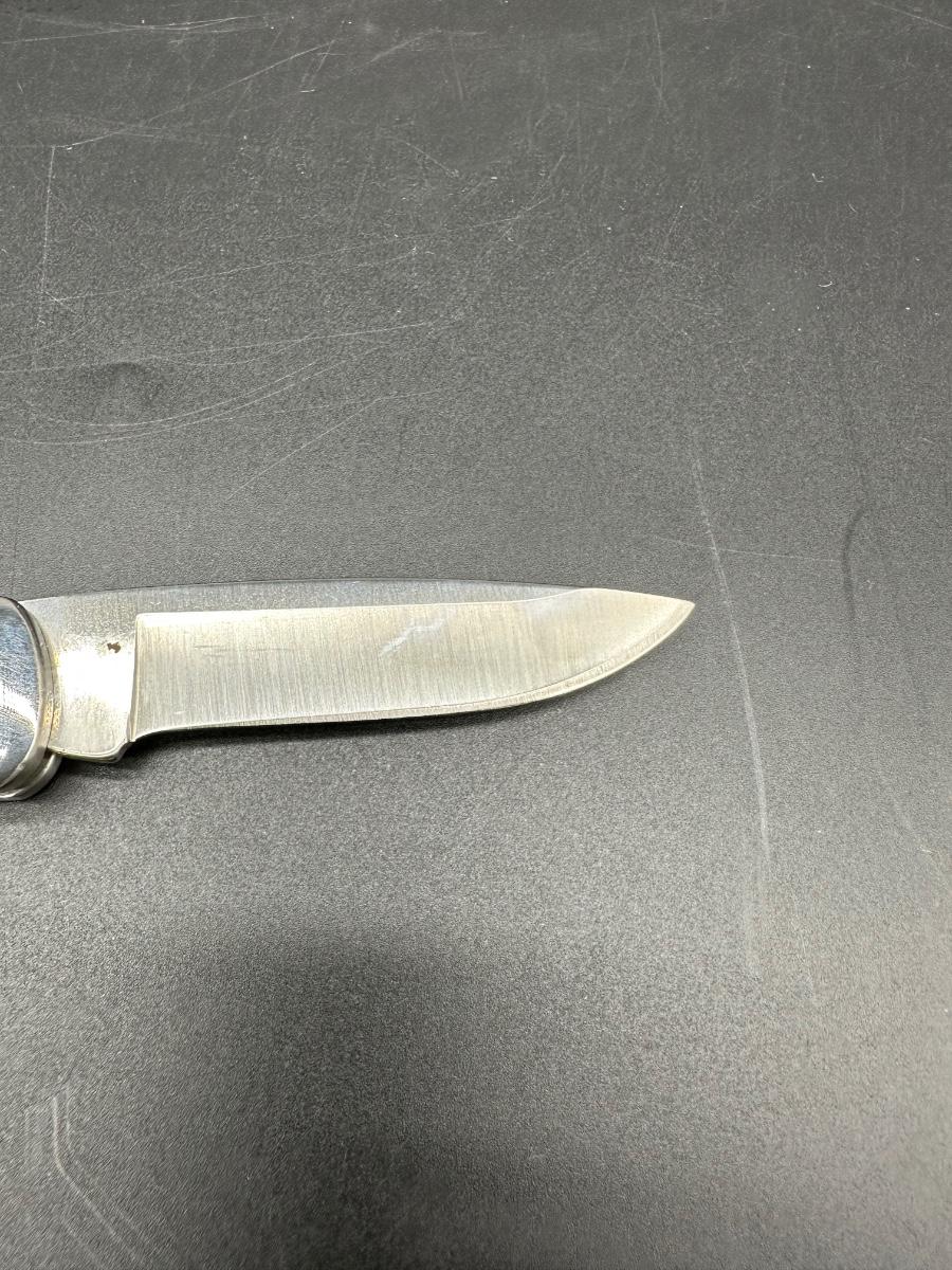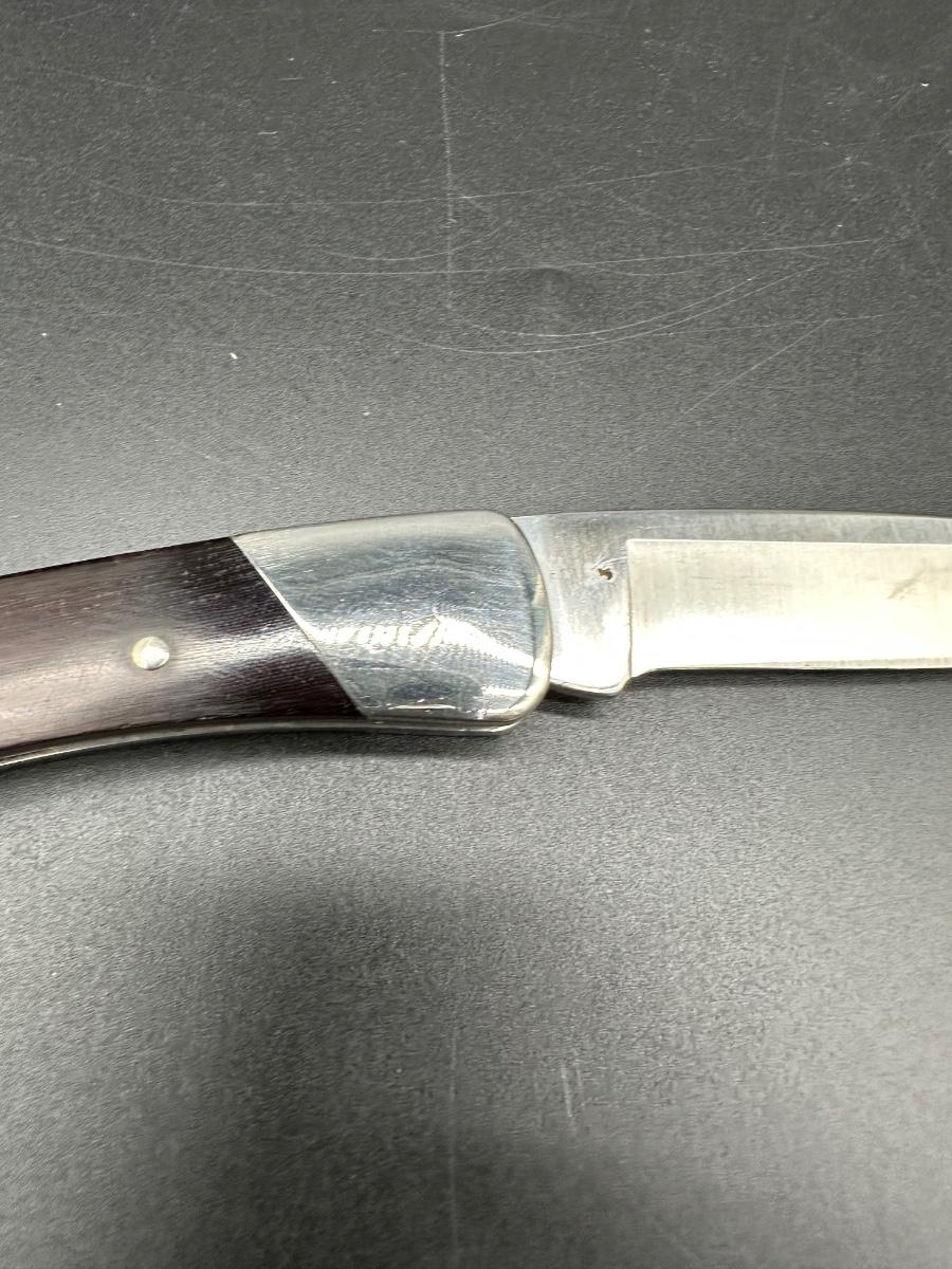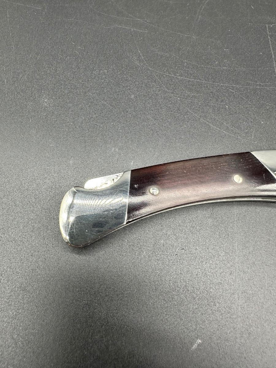 Pre-owned estate knife. Blade is clean with light surface marks from handling/storage. No visible cracks in handle scales. Lock functions properly. Bolsters show normal light scratching consistent with age. Overall very nice example.