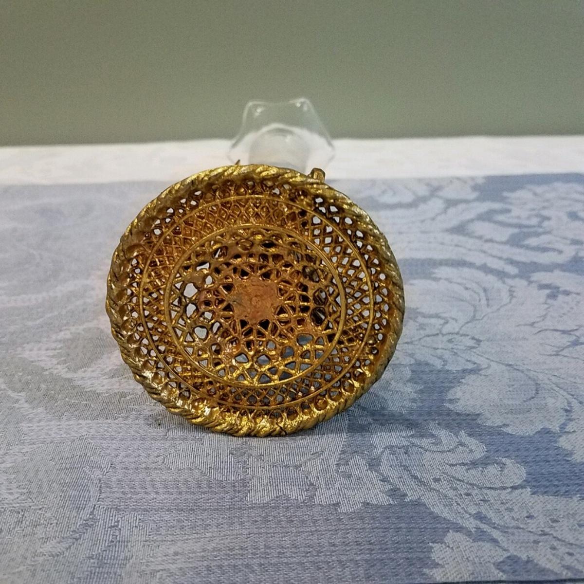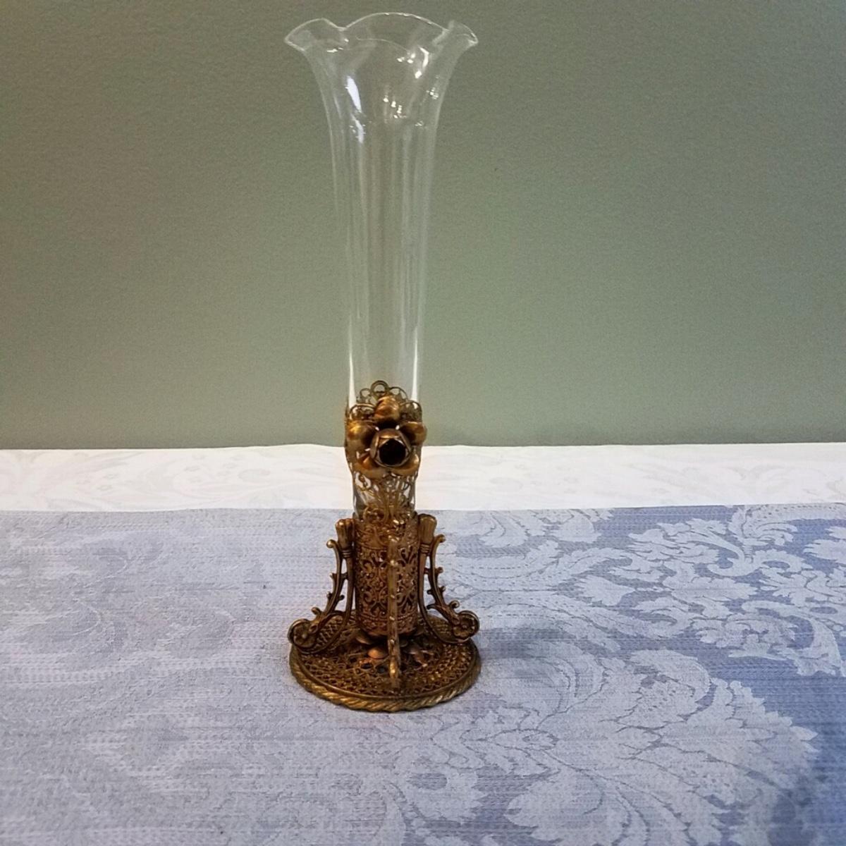 Vintage bud vase with Filagree gold stand. Clear glass removable insert. Excellent condition.