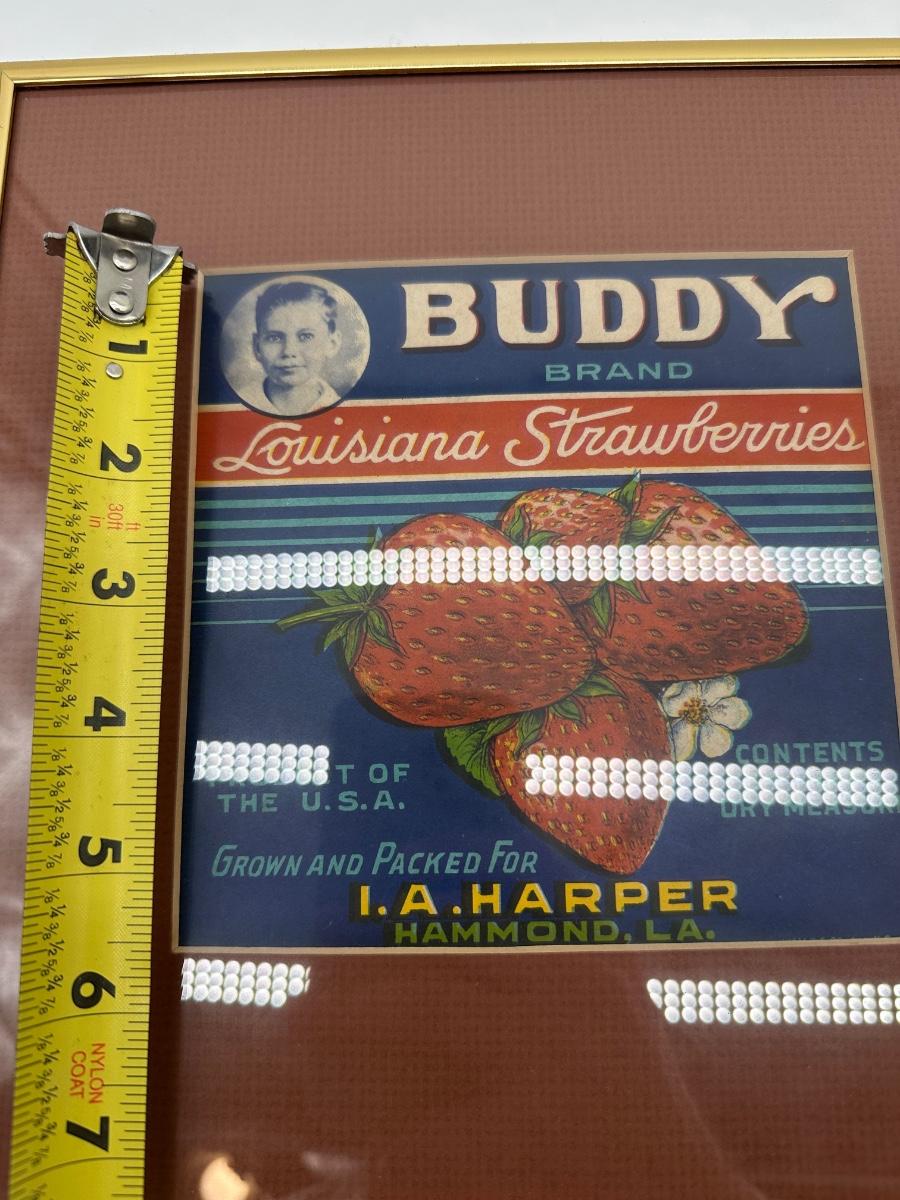 Original Buddy Brand – Louisiana Strawberries produce crate/basket label from a local Hammond, Louisiana strawberry farm, professionally framed under glass. Bright colors with classic fruit crate artwork featuring strawberries and grower I.A. Harper, Hammond, LA. Great piece of Louisiana history, farm décor, or kitchen wall art. Frame included as shown.