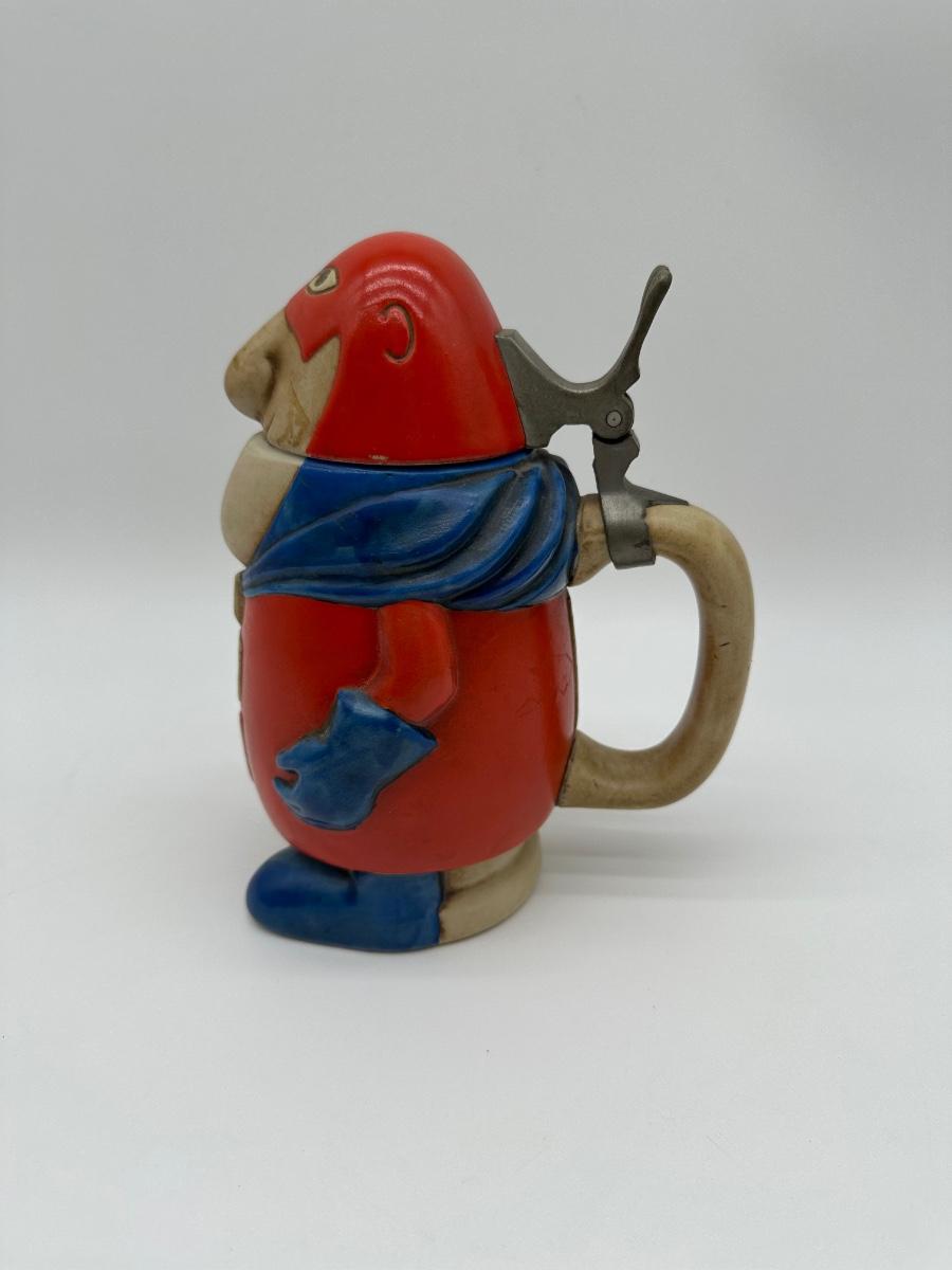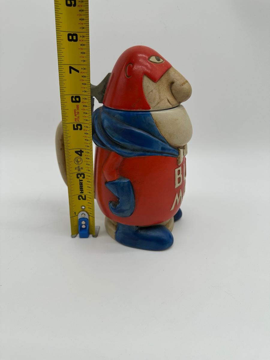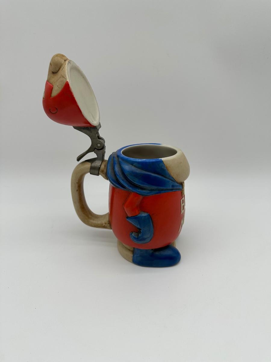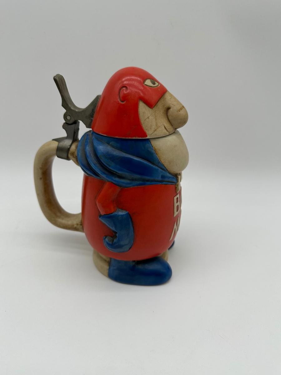 Vintage Budweiser “Bud Man” ceramic beer stein featuring the classic Bud Man character in red and blue with hinged metal lid. Produced for Anheuser-Busch as a promotional collectible. Great display piece for a bar, man cave, or beer memorabilia collection.