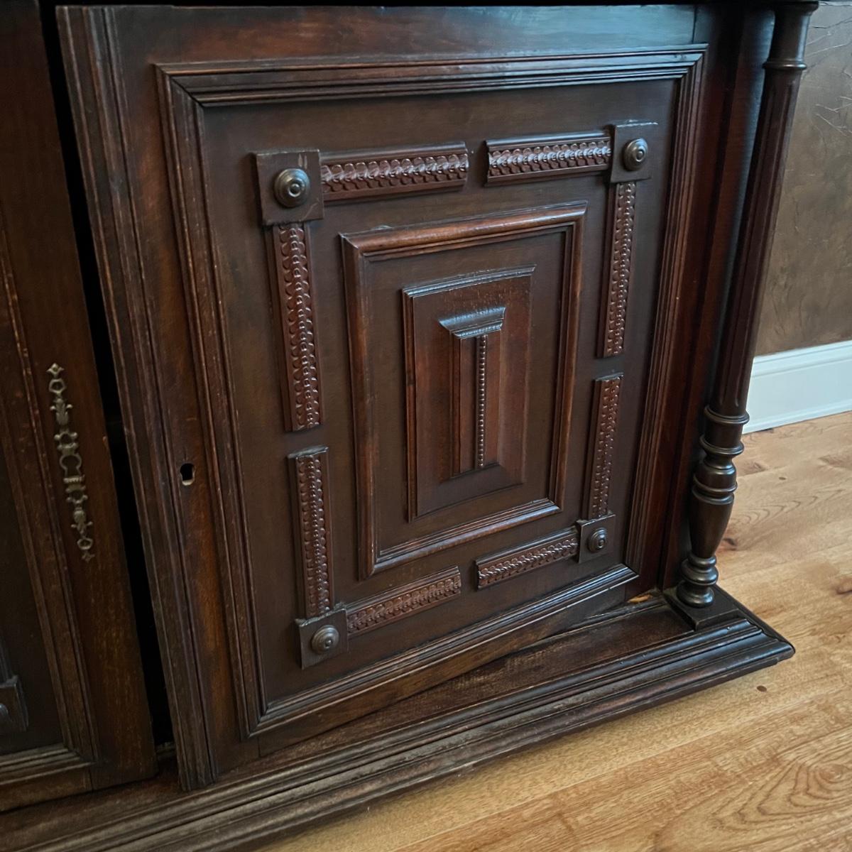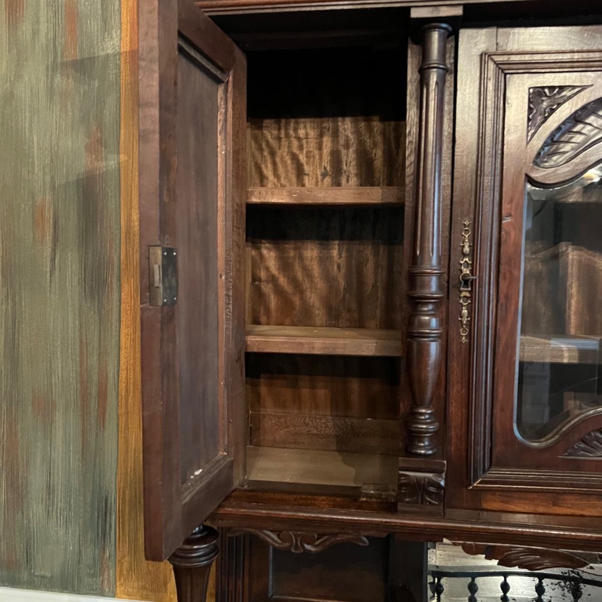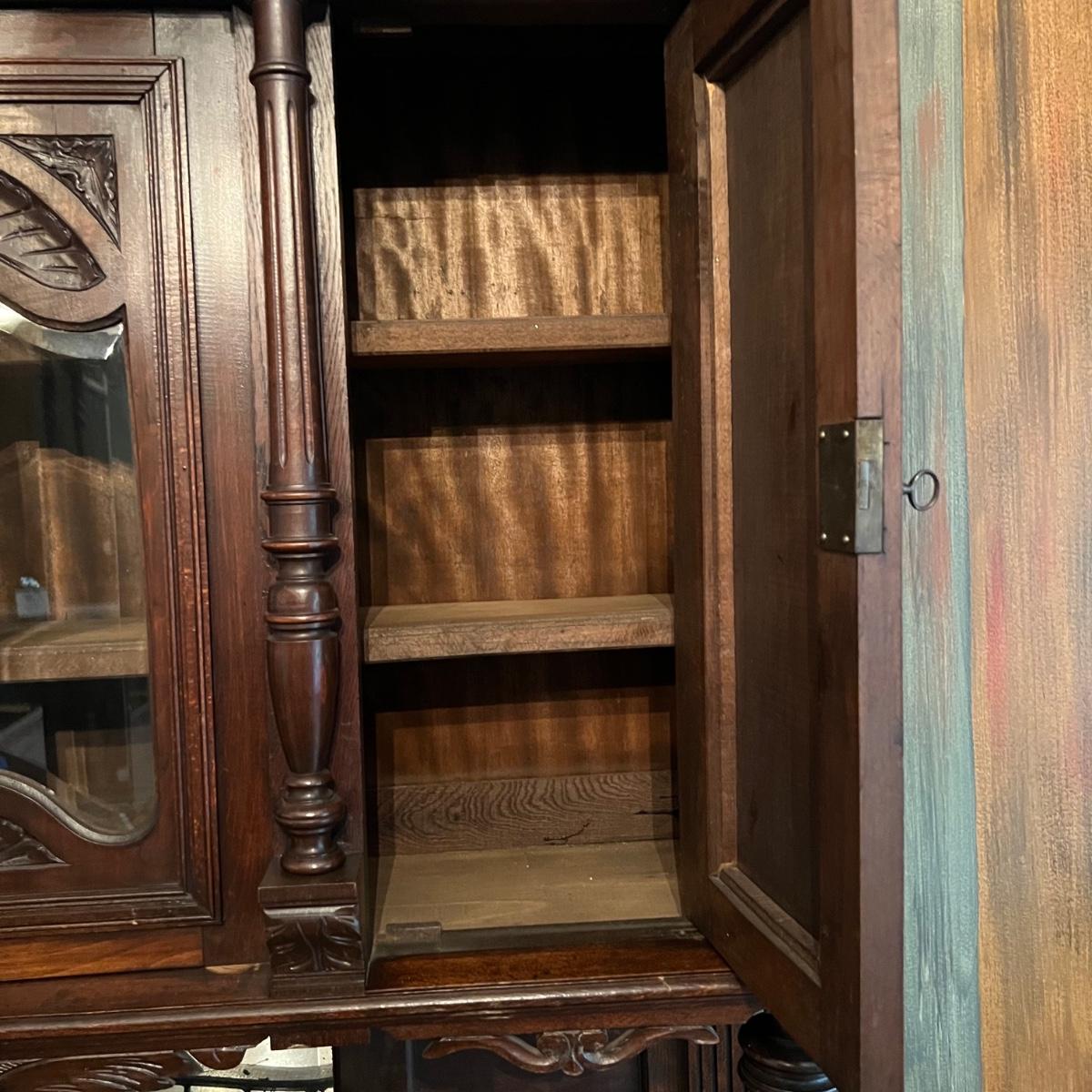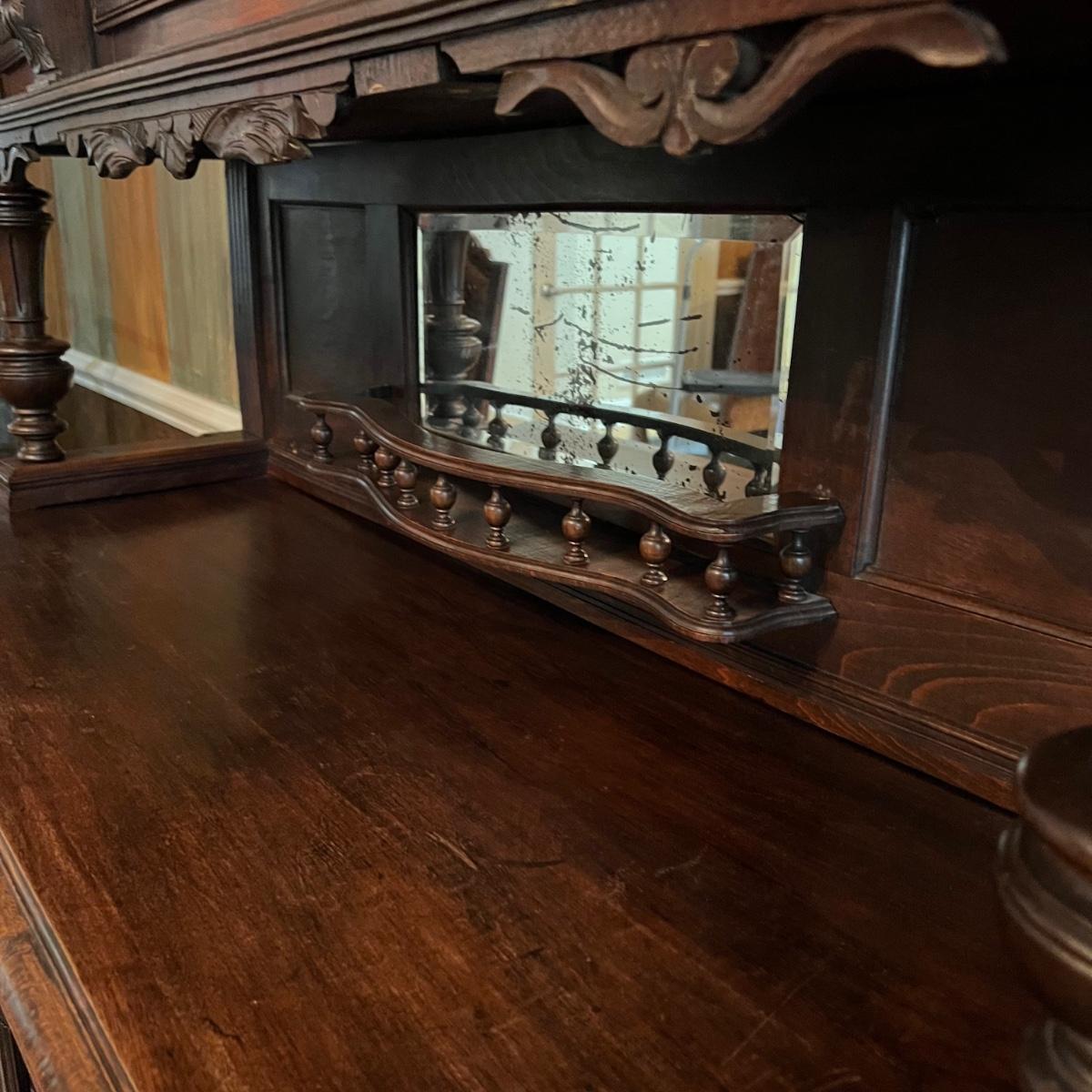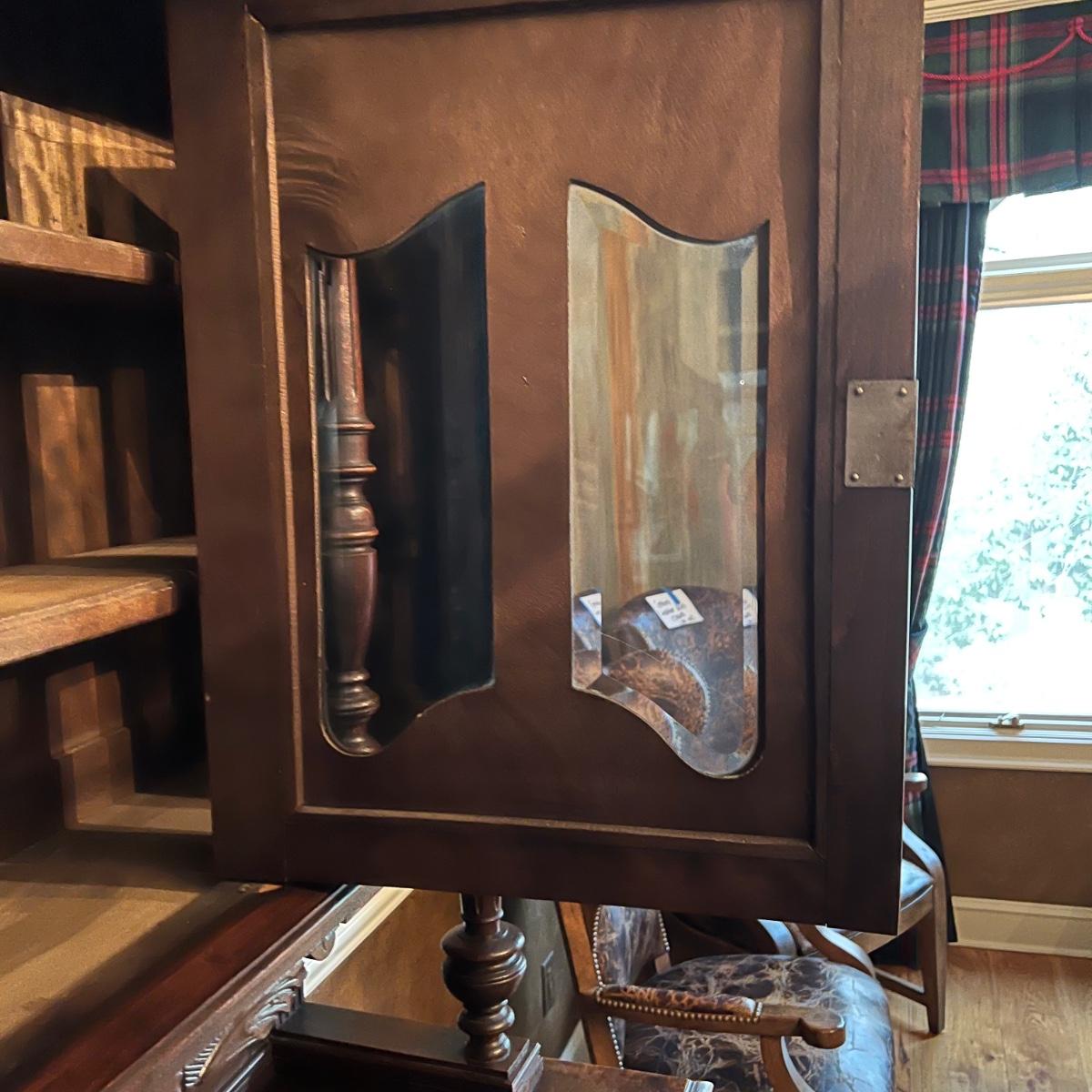 Lend a stately air to any home with this elegant vintage wood buffet. The piece has two covered cabinets up top, a mirrored display rack in the middle and two drawers central as well as two cabinets beneath. The piece measures 54” x 21” x 85”H. There are four key holes with locks attached. Two keys come with this piece. While they turn in the keyhole they do not seem to lock. The top piece has two shelves that do not appear to be adjustable. The mirrored shelf in the center has obvious signs of distress/age. The two drawers have brass appearing hardware as poles, and the lower unit has one shelf that again does not appear to be adjustable.
