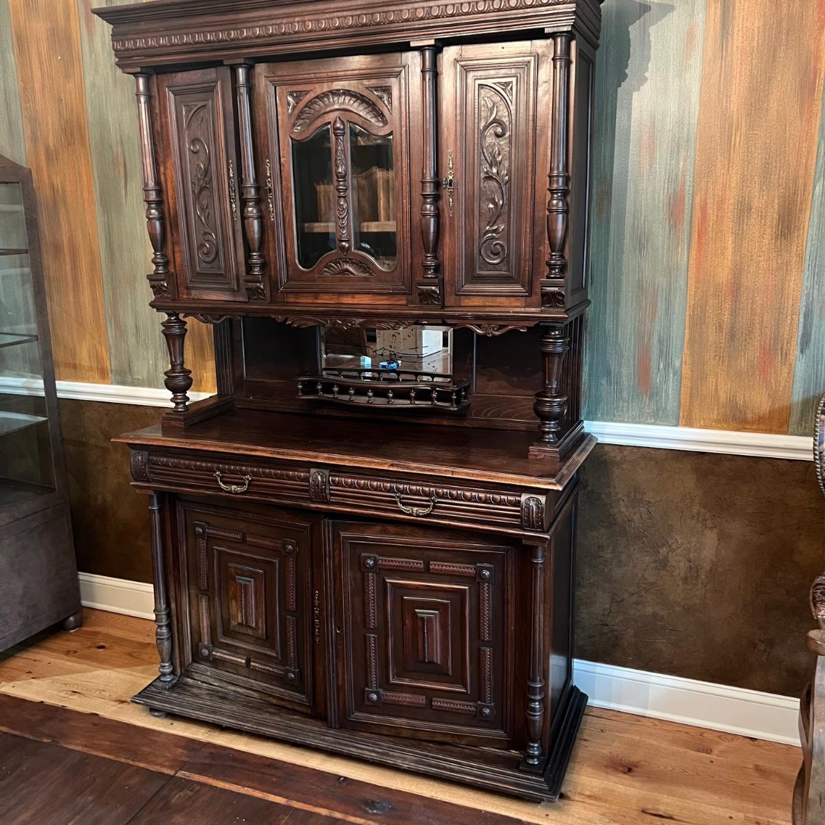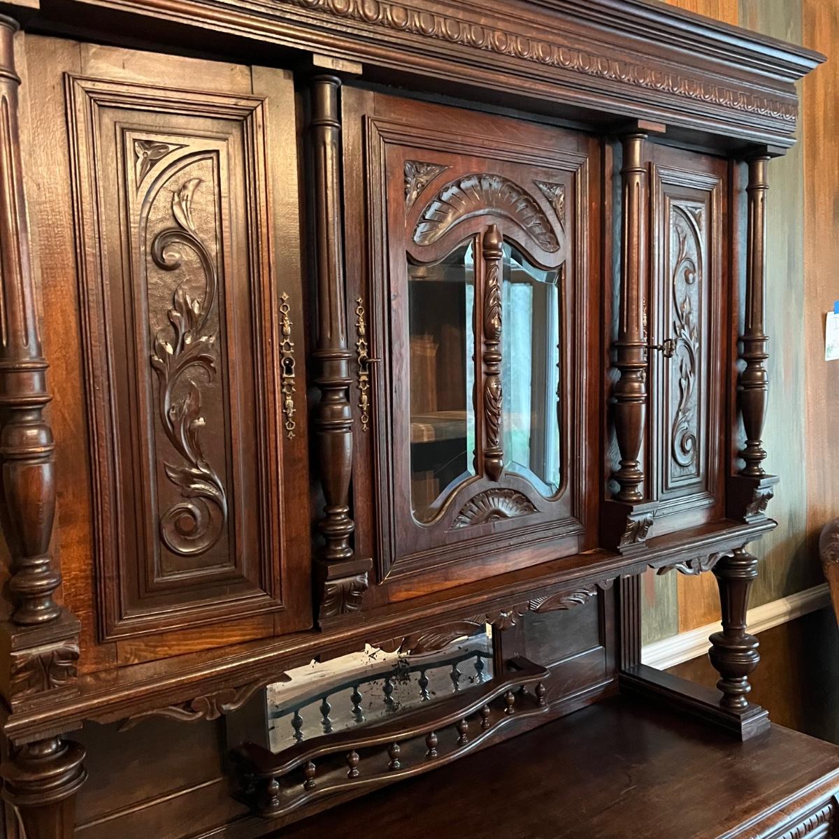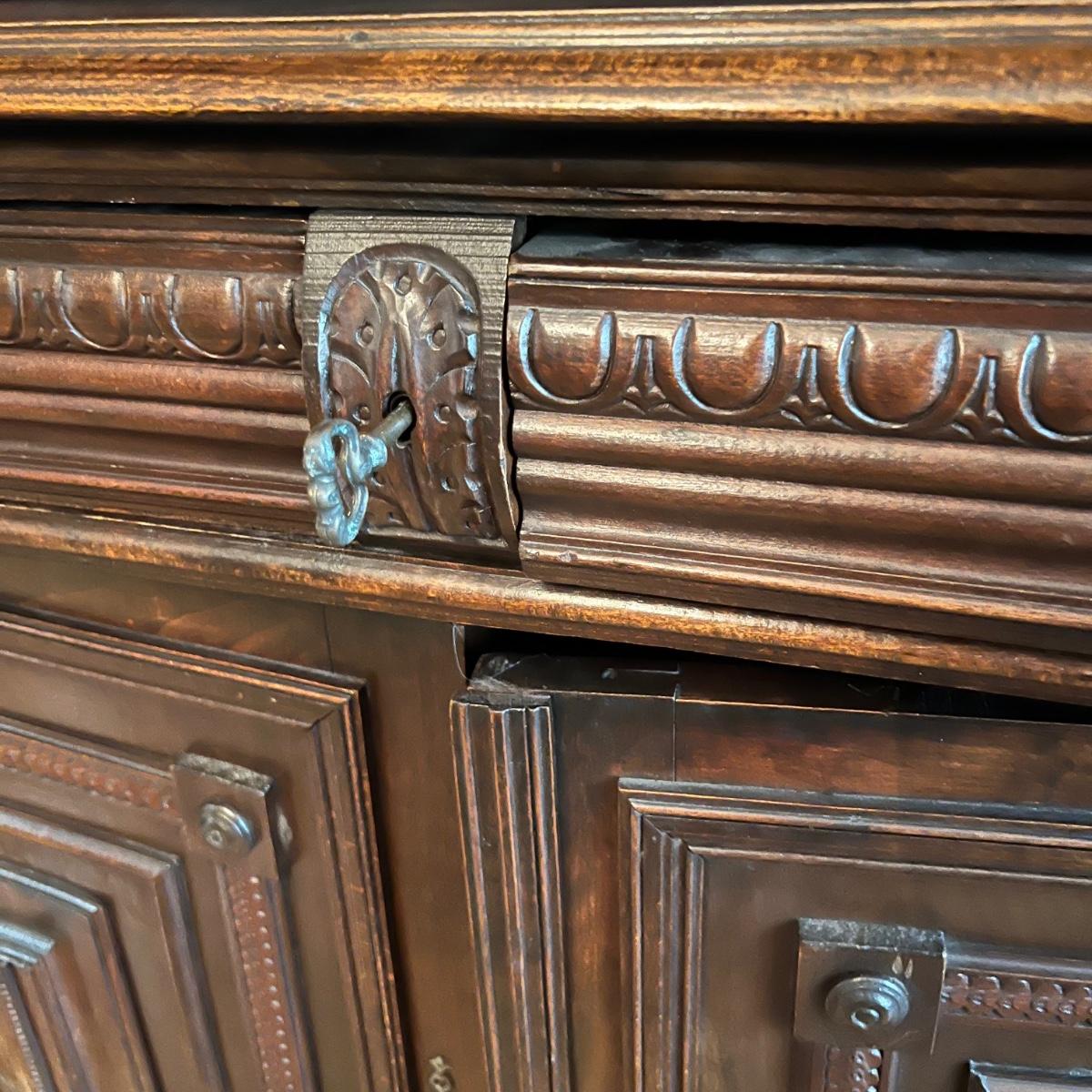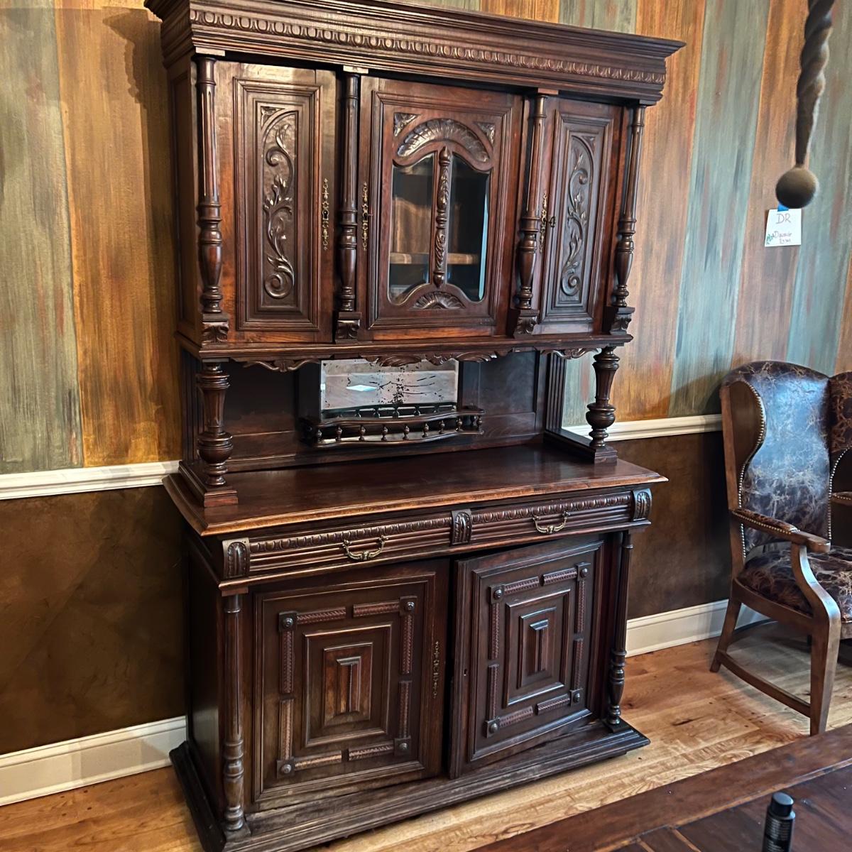 Lend a stately air to any home with this elegant vintage wood buffet. The piece has two covered cabinets up top, a mirrored display rack in the middle and two drawers central as well as two cabinets beneath. The piece measures 54” x 21” x 85”H. There are four key holes with locks attached. Two keys come with this piece. While they turn in the keyhole they do not seem to lock. The top piece has two shelves that do not appear to be adjustable. The mirrored shelf in the center has obvious signs of distress/age. The two drawers have brass appearing hardware as poles, and the lower unit has one shelf that again does not appear to be adjustable.