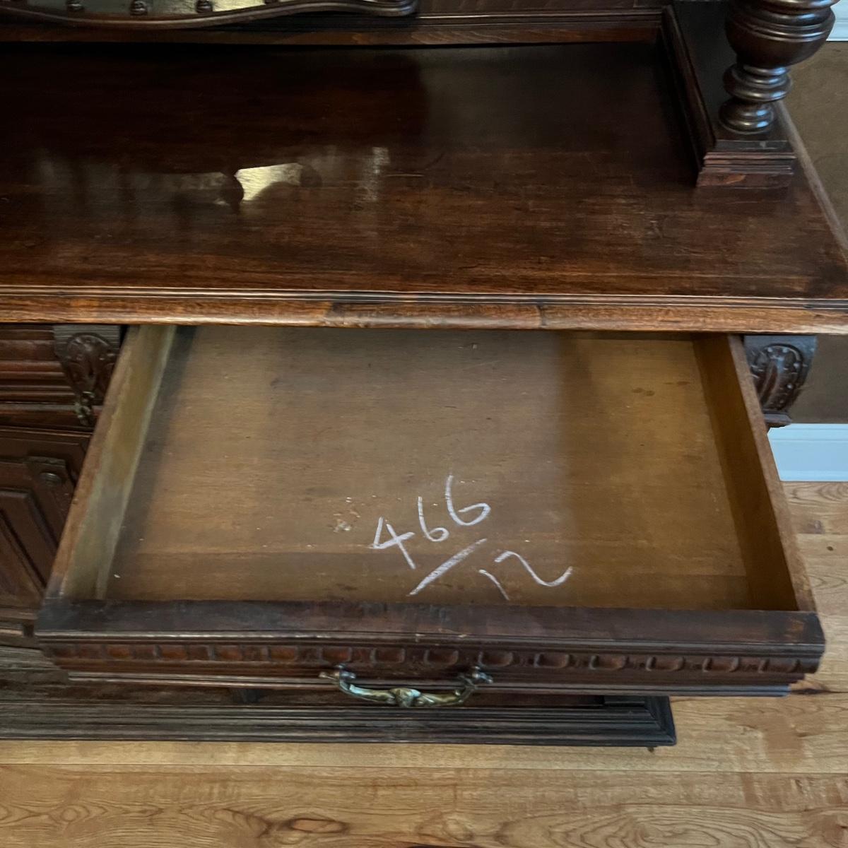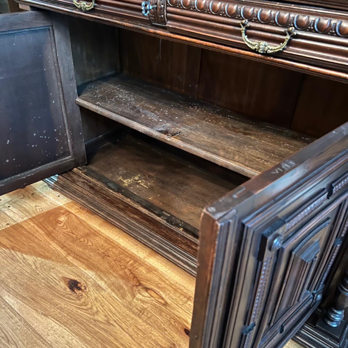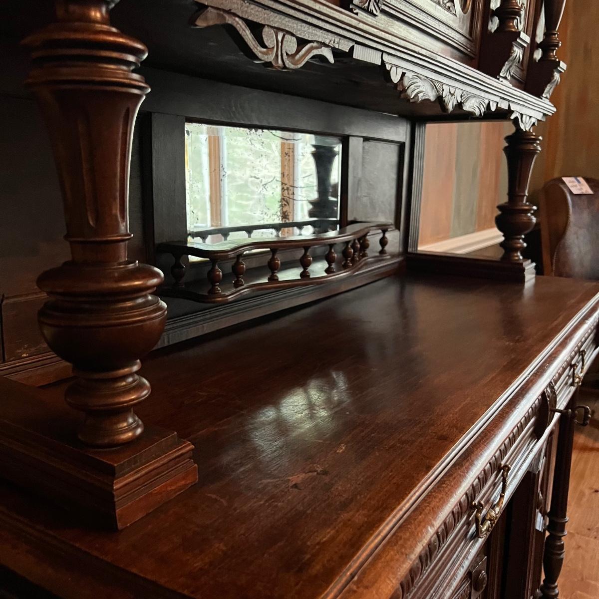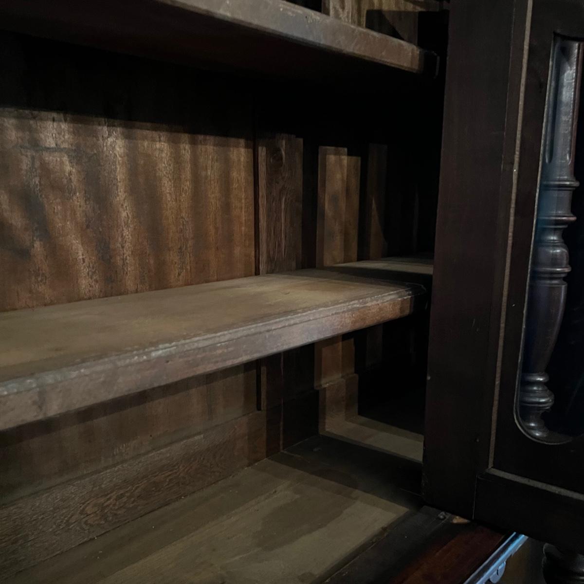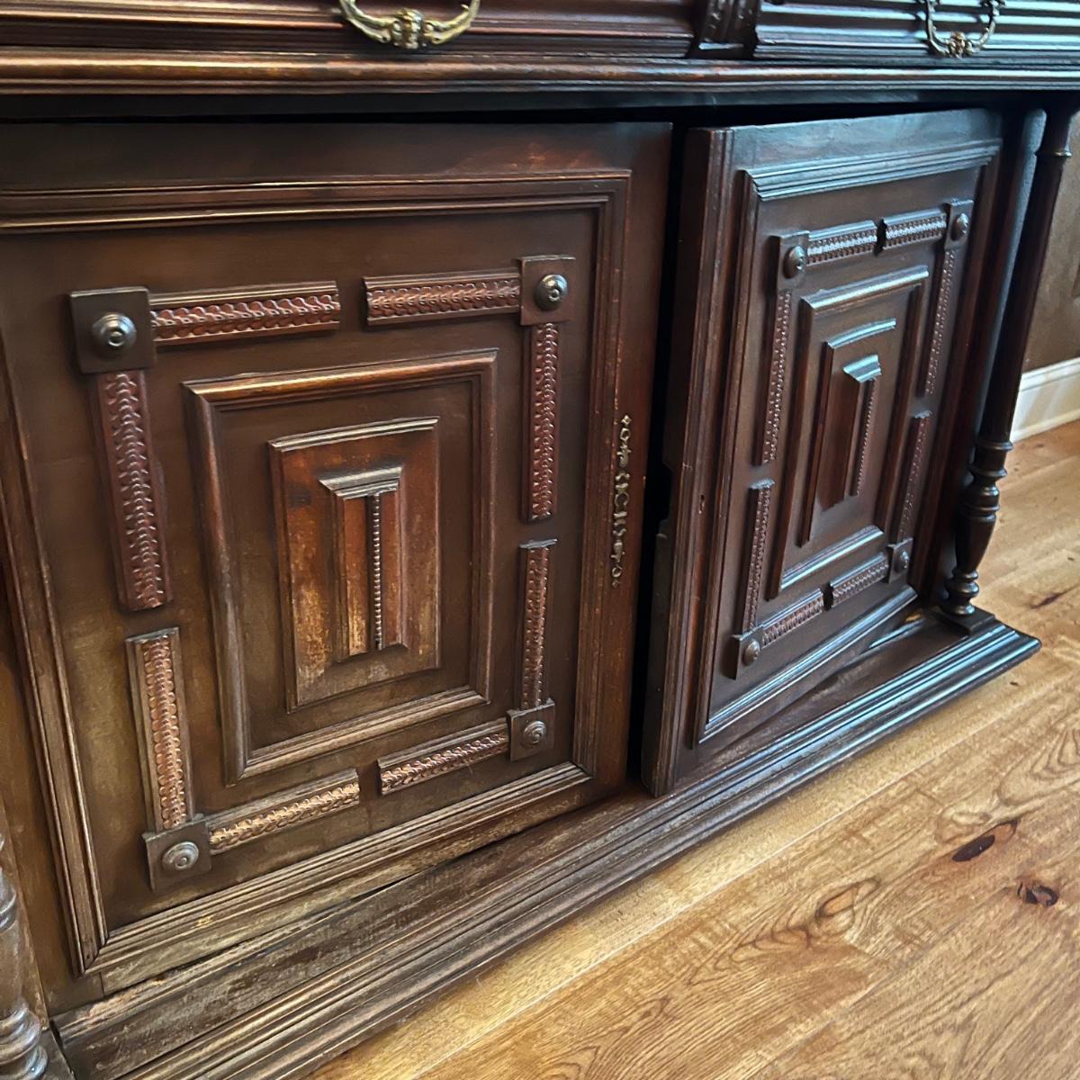Lend a stately air to any home with this elegant vintage wood buffet. The piece has two covered cabinets up top, a mirrored display rack in the middle and two drawers central as well as two cabinets beneath. The piece measures 54” x 21” x 85”H. There are four key holes with locks attached. Two keys come with this piece. While they turn in the keyhole they do not seem to lock. The top piece has two shelves that do not appear to be adjustable. The mirrored shelf in the center has obvious signs of distress/age. The two drawers have brass appearing hardware as poles, and the lower unit has one shelf that again does not appear to be adjustable.