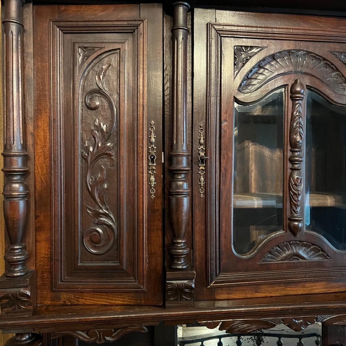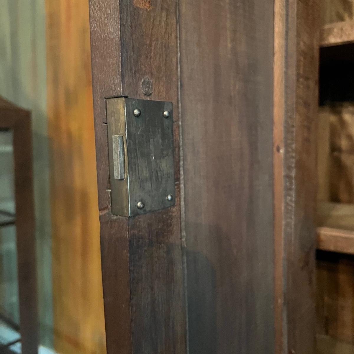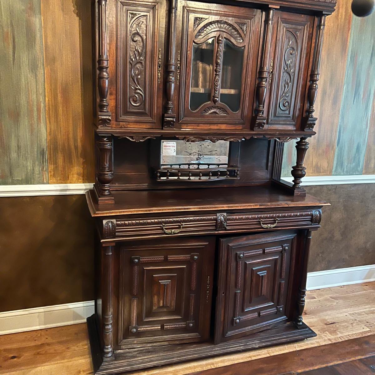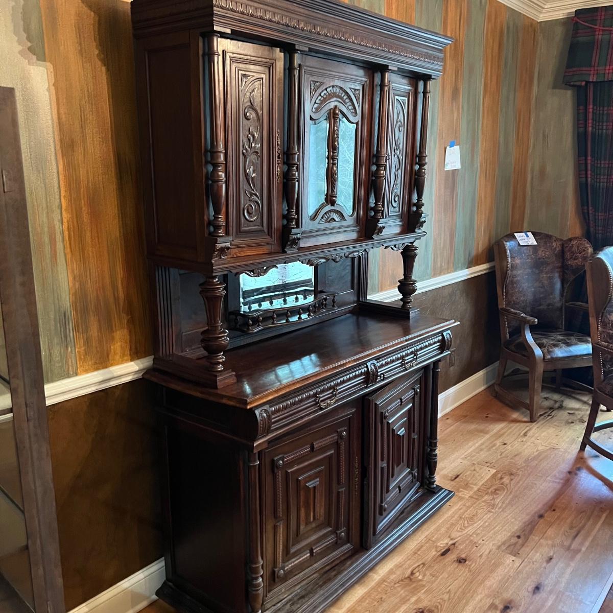 Lend a stately air to any home with this elegant vintage wood buffet. The piece has two covered cabinets up top, a mirrored display rack in the middle and two drawers central as well as two cabinets beneath. The piece measures 54” x 21” x 85”H. There are four key holes with locks attached. Two keys come with this piece. While they turn in the keyhole they do not seem to lock. The top piece has two shelves that do not appear to be adjustable. The mirrored shelf in the center has obvious signs of distress/age. The two drawers have brass appearing hardware as poles, and the lower unit has one shelf that again does not appear to be adjustable.