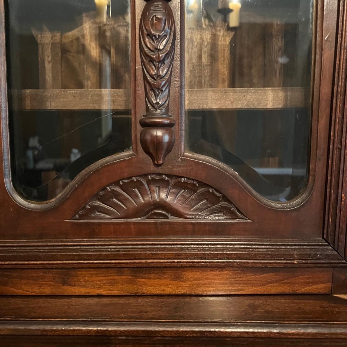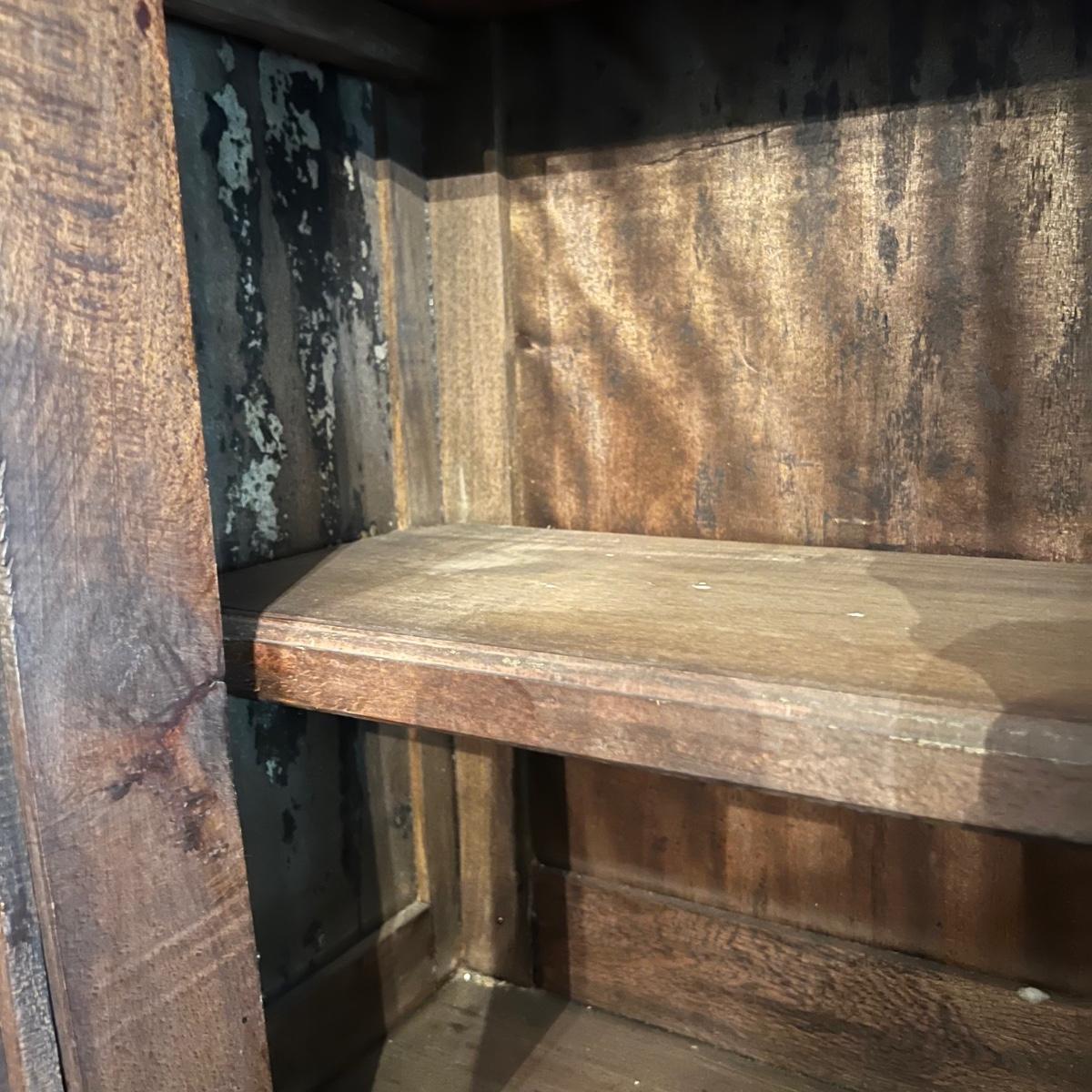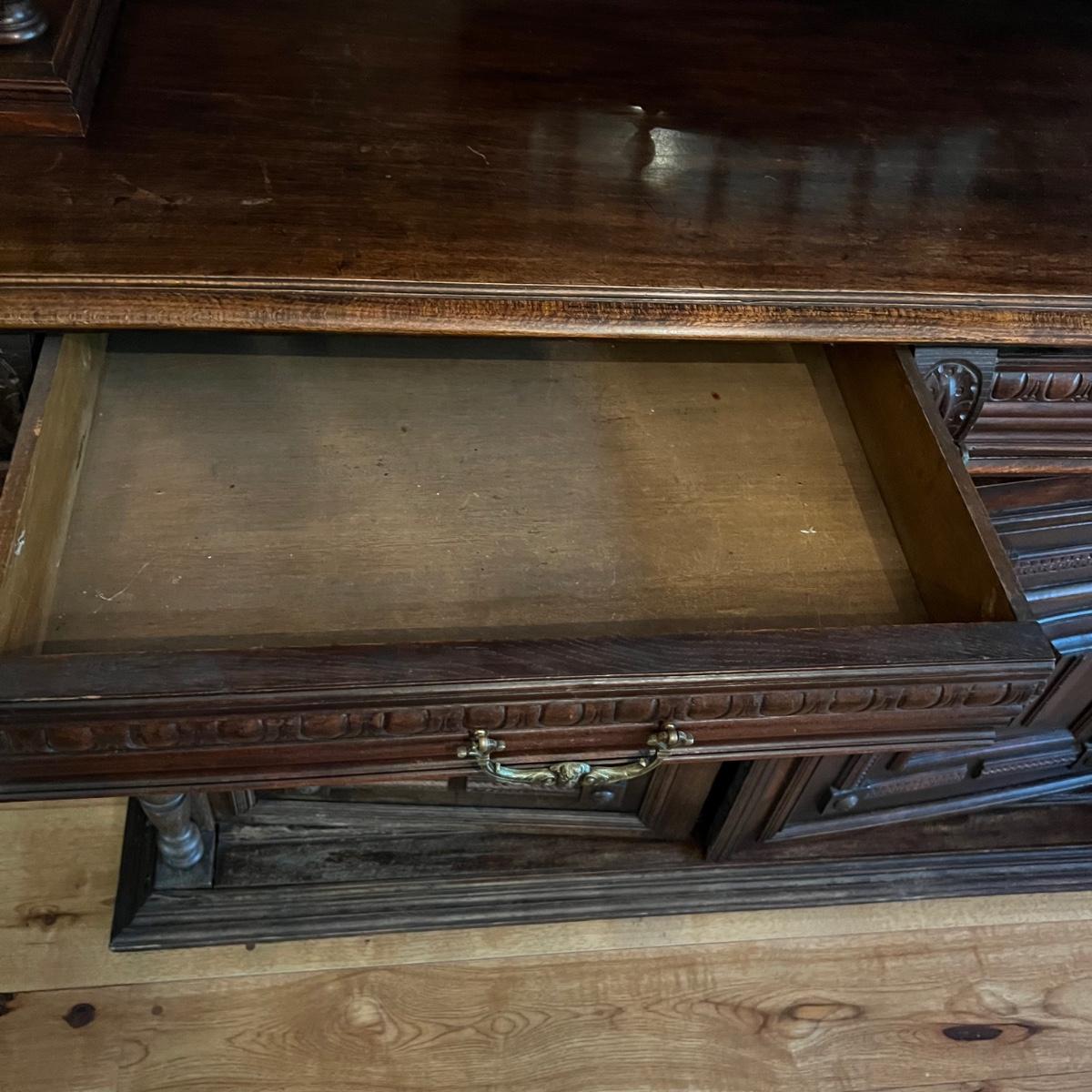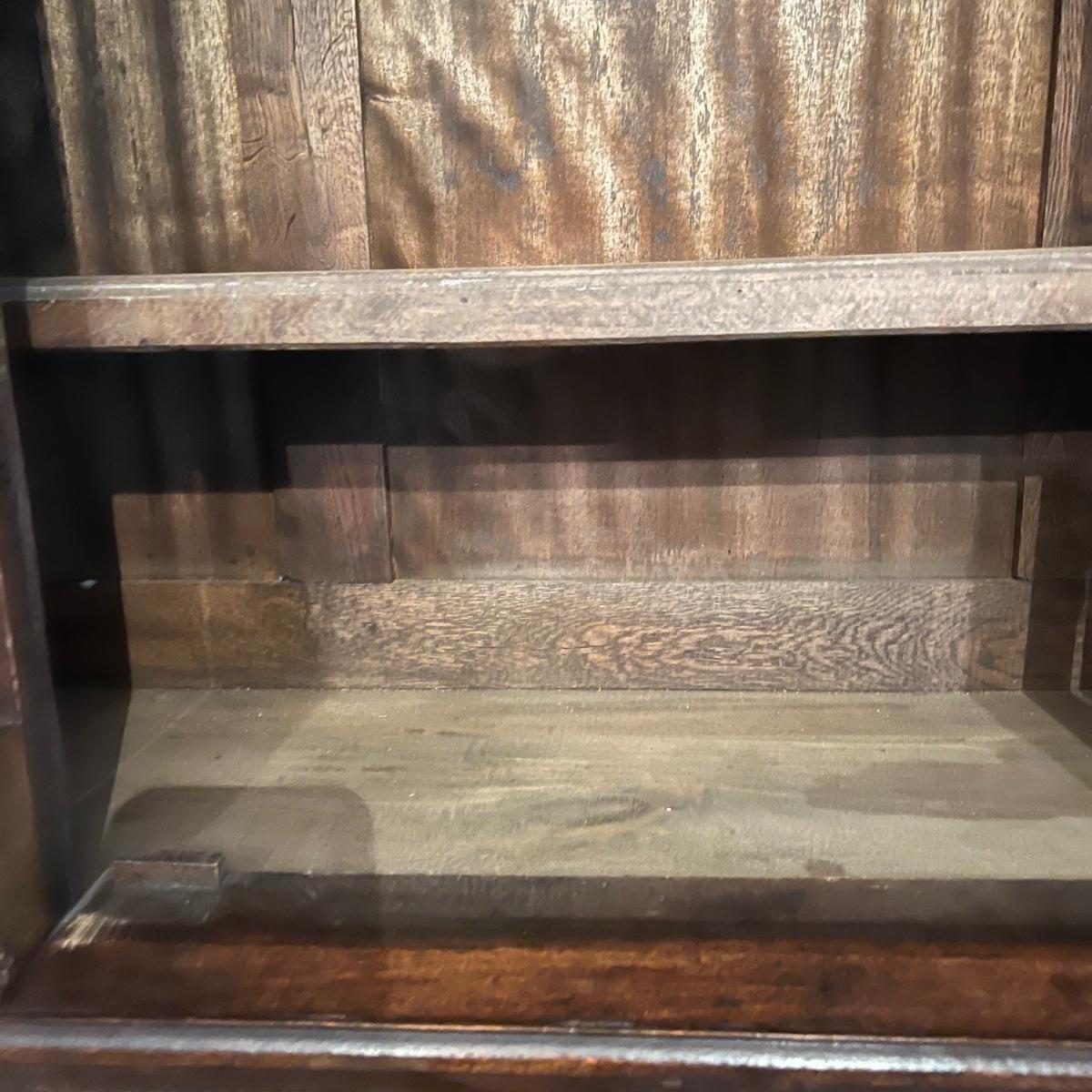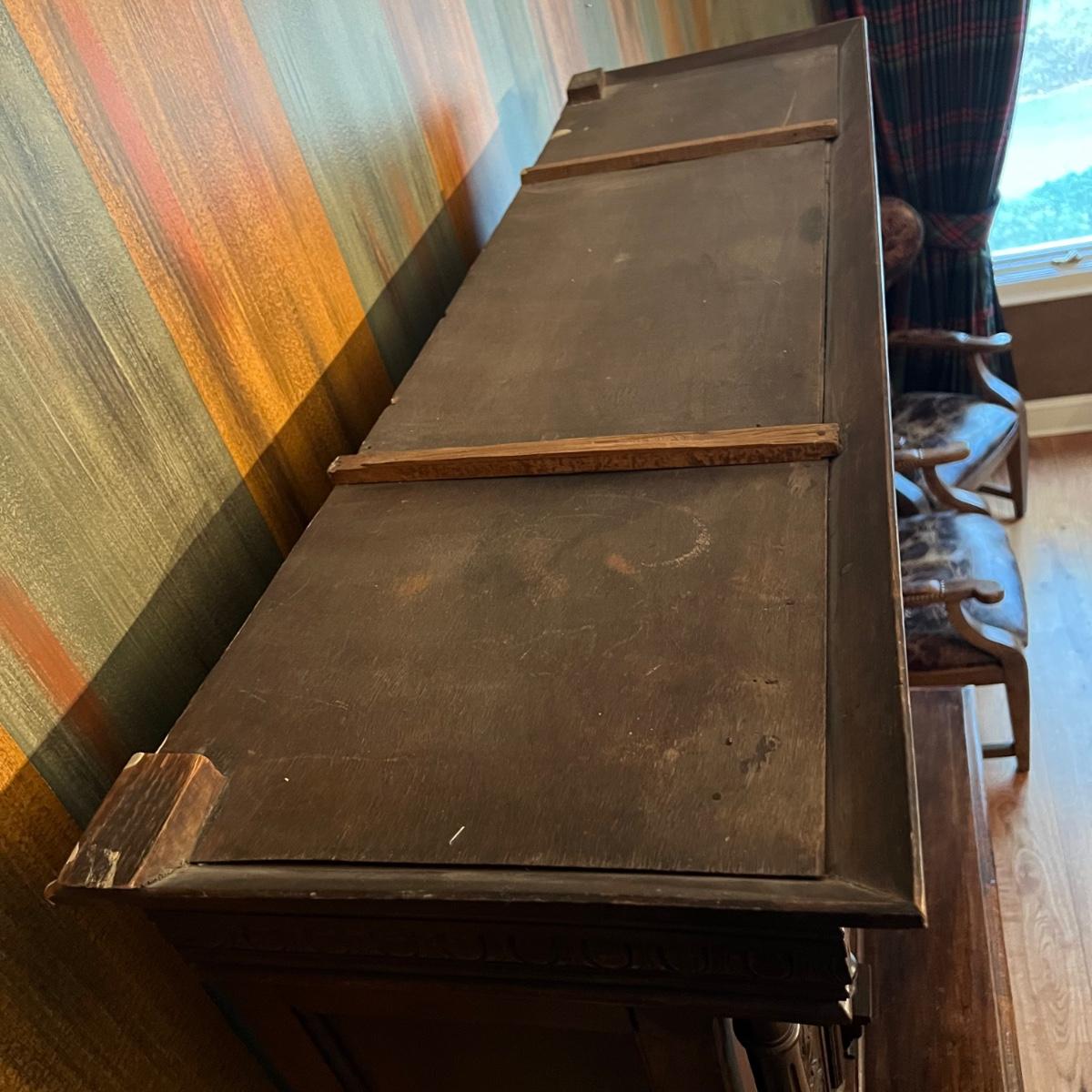 Lend a stately air to any home with this elegant vintage wood buffet. The piece has two covered cabinets up top, a mirrored display rack in the middle and two drawers central as well as two cabinets beneath. The piece measures 54” x 21” x 85”H. There are four key holes with locks attached. Two keys come with this piece. While they turn in the keyhole they do not seem to lock. The top piece has two shelves that do not appear to be adjustable. The mirrored shelf in the center has obvious signs of distress/age. The two drawers have brass appearing hardware as poles, and the lower unit has one shelf that again does not appear to be adjustable.