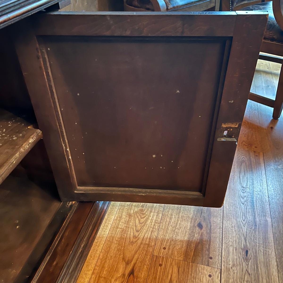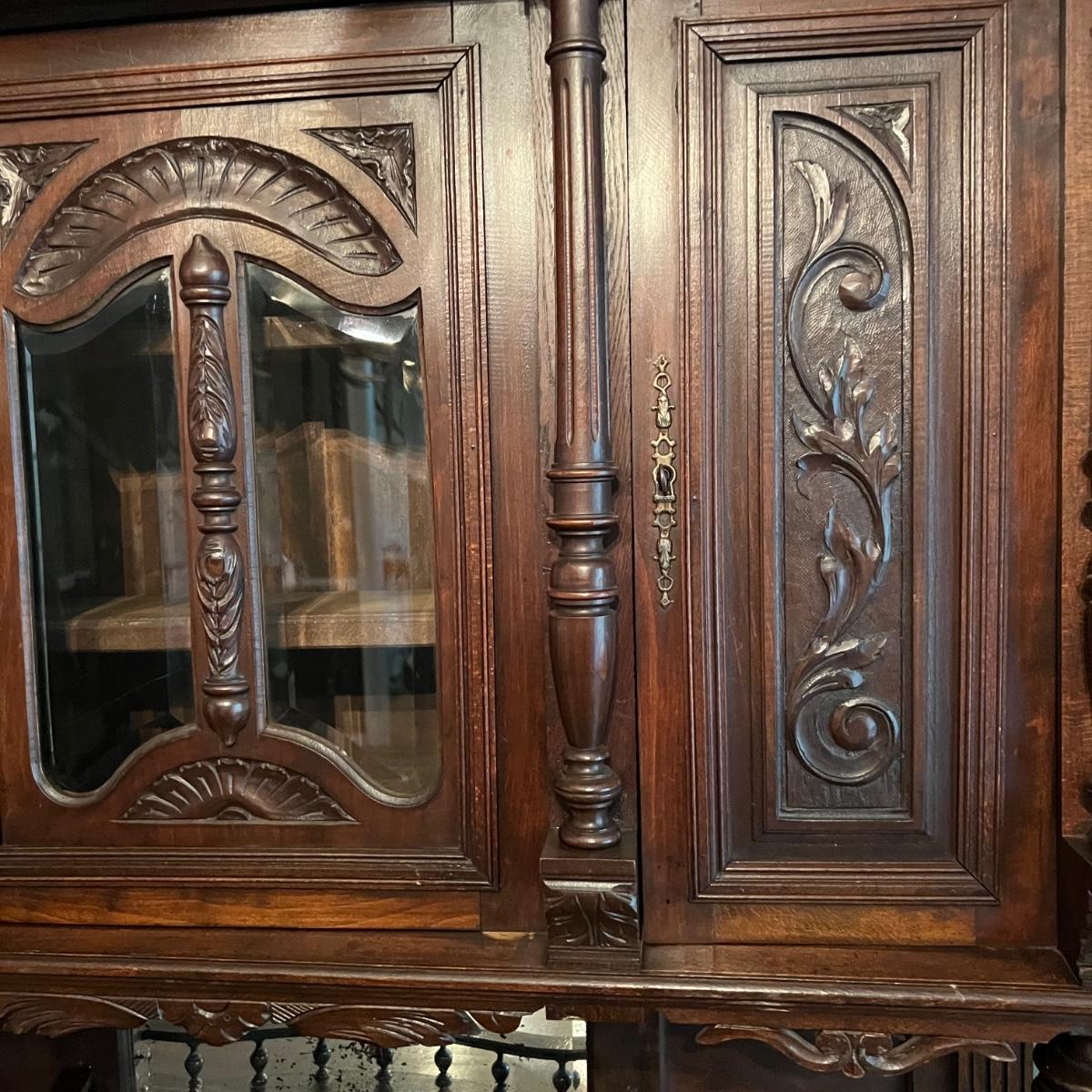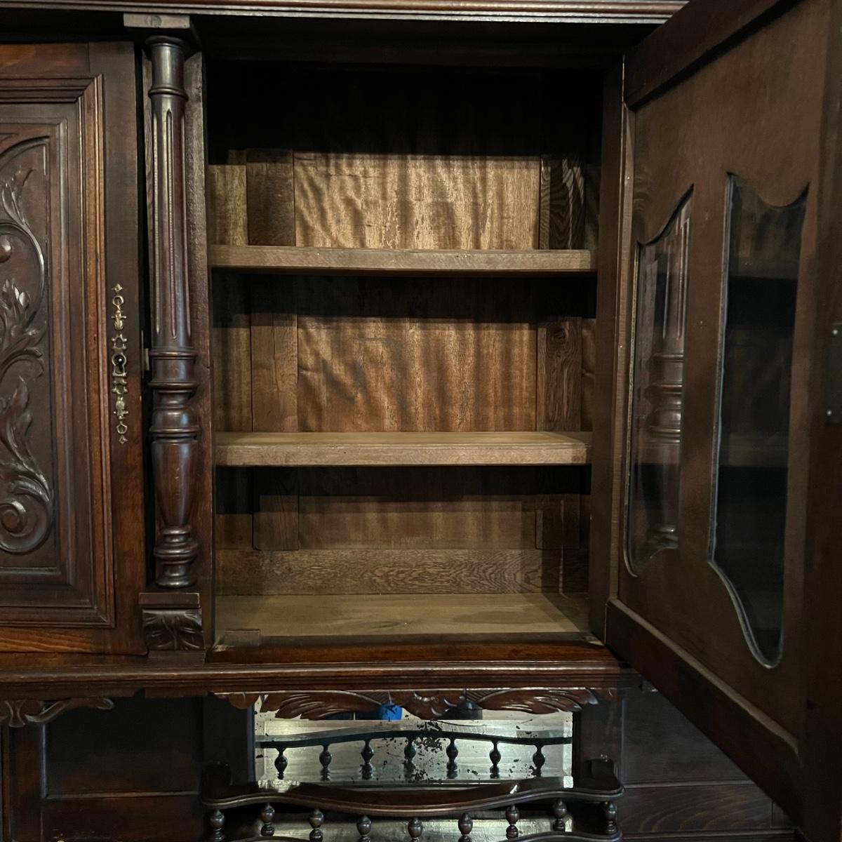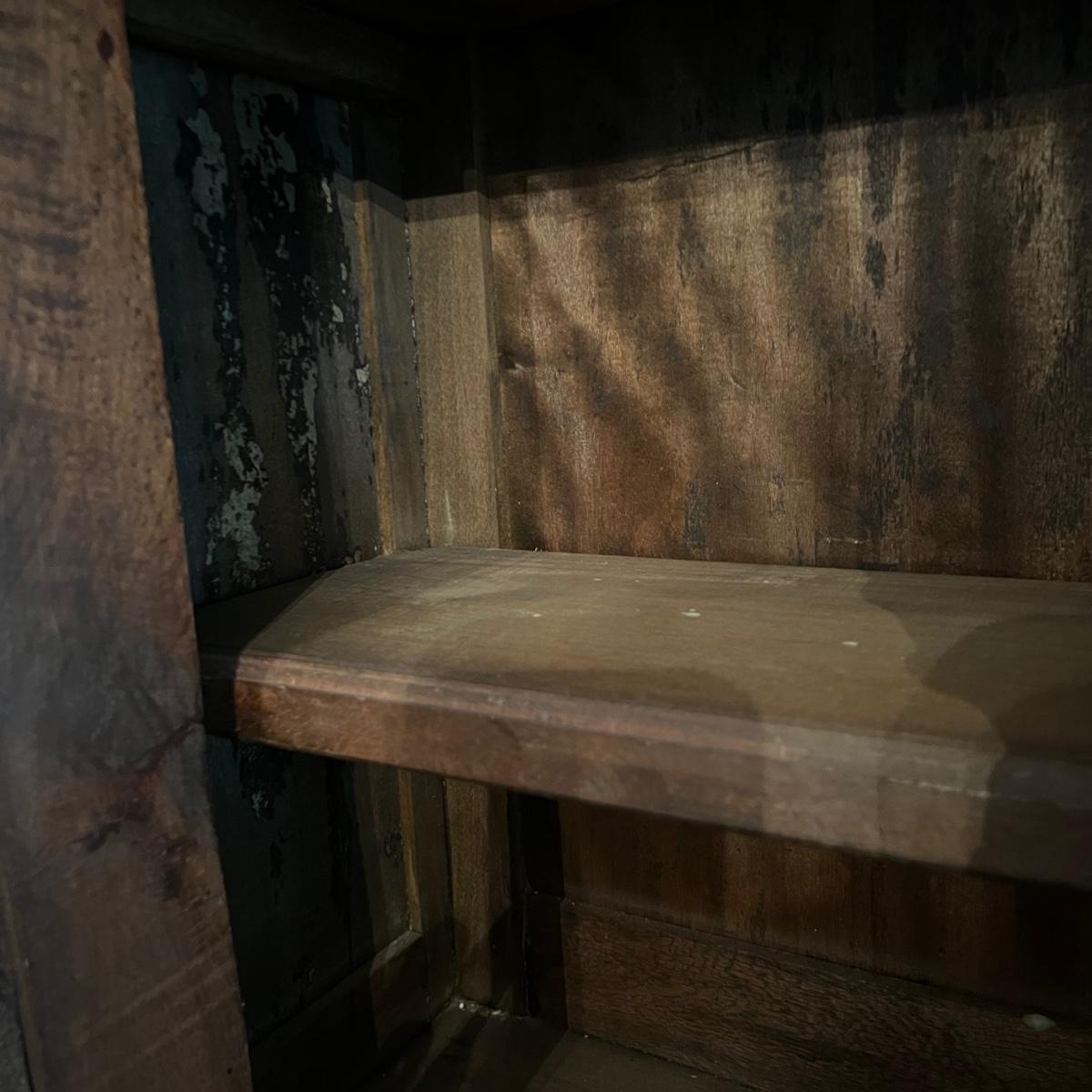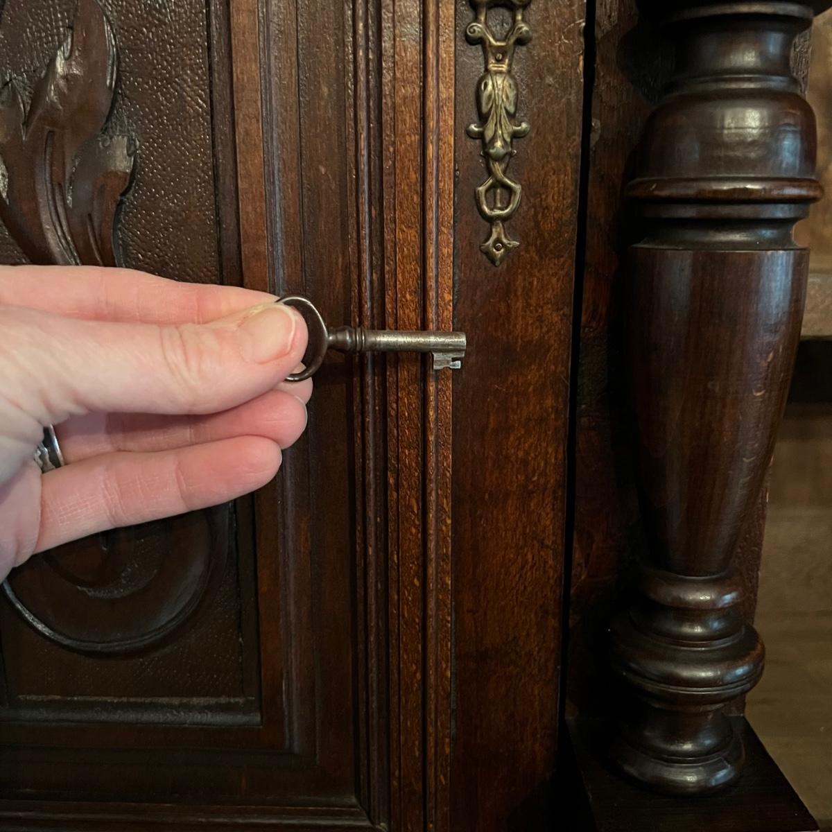 Lend a stately air to any home with this elegant vintage wood buffet. The piece has two covered cabinets up top, a mirrored display rack in the middle and two drawers central as well as two cabinets beneath. The piece measures 54” x 21” x 85”H. There are four key holes with locks attached. Two keys come with this piece. While they turn in the keyhole they do not seem to lock. The top piece has two shelves that do not appear to be adjustable. The mirrored shelf in the center has obvious signs of distress/age. The two drawers have brass appearing hardware as poles, and the lower unit has one shelf that again does not appear to be adjustable.