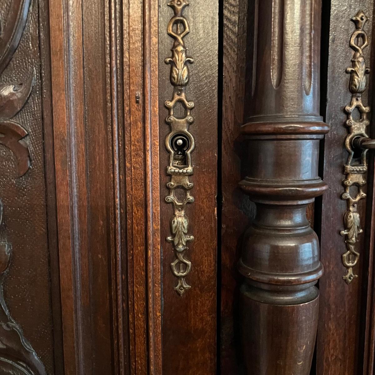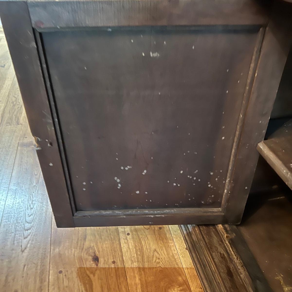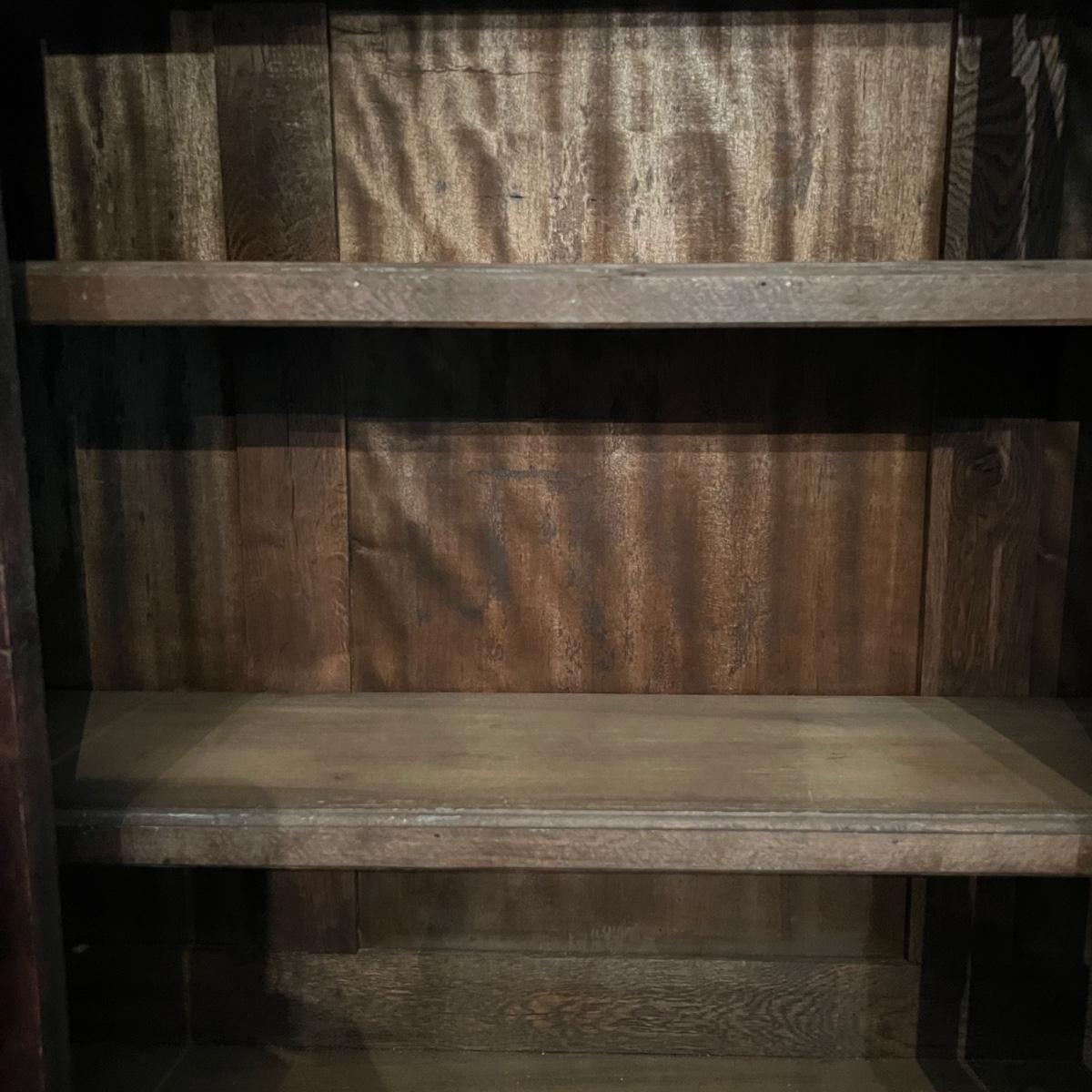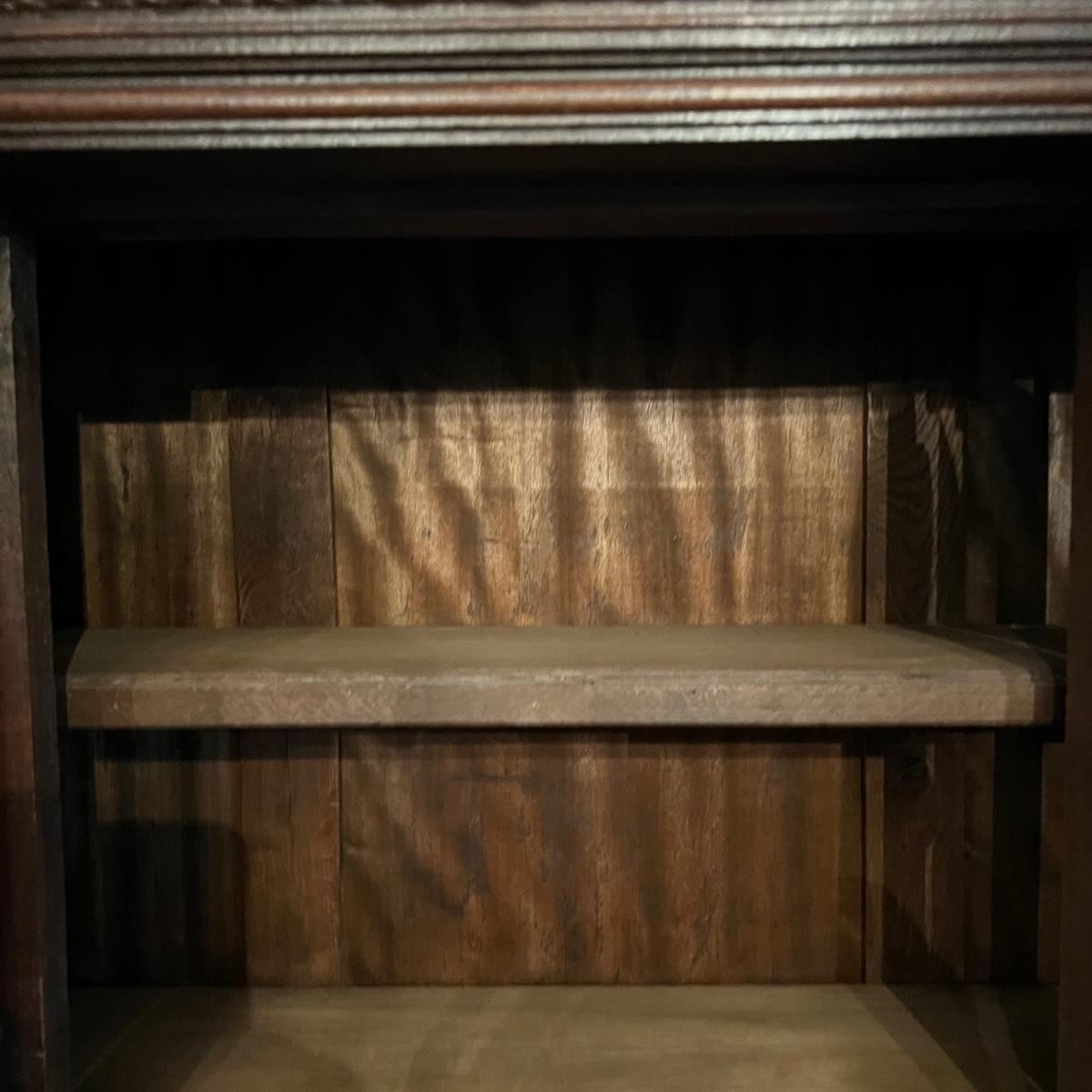 Lend a stately air to any home with this elegant vintage wood buffet. The piece has two covered cabinets up top, a mirrored display rack in the middle and two drawers central as well as two cabinets beneath. The piece measures 54” x 21” x 85”H. There are four key holes with locks attached. Two keys come with this piece. While they turn in the keyhole they do not seem to lock. The top piece has two shelves that do not appear to be adjustable. The mirrored shelf in the center has obvious signs of distress/age. The two drawers have brass appearing hardware as poles, and the lower unit has one shelf that again does not appear to be adjustable.