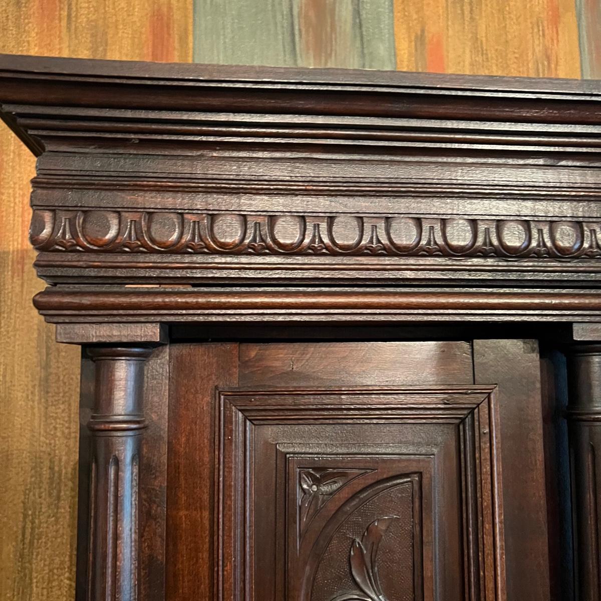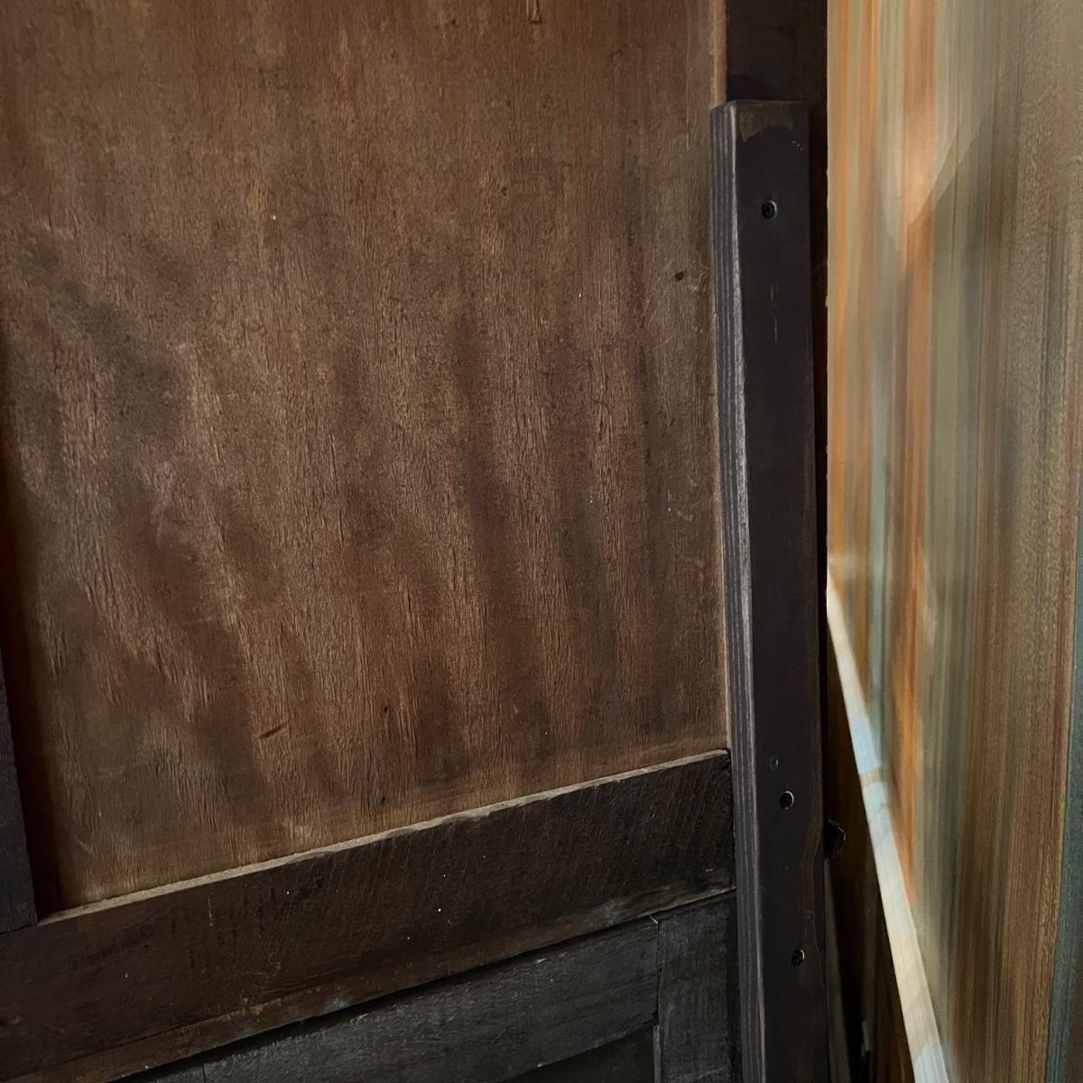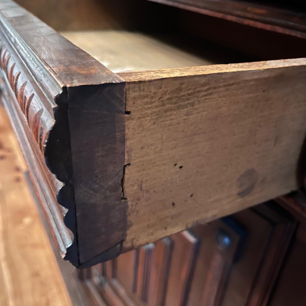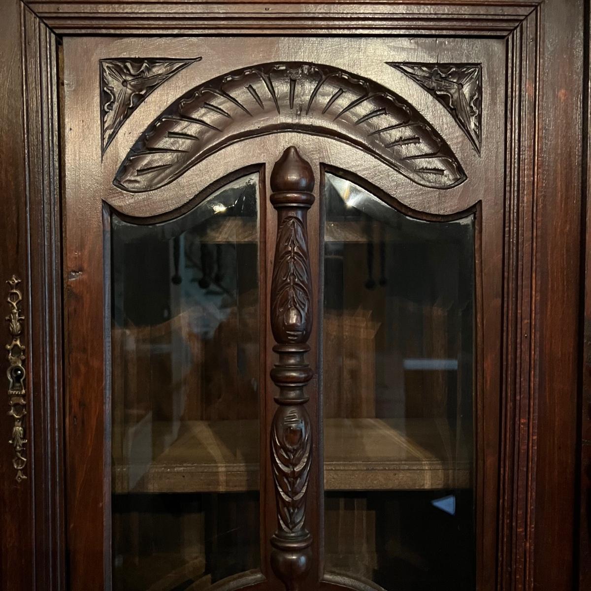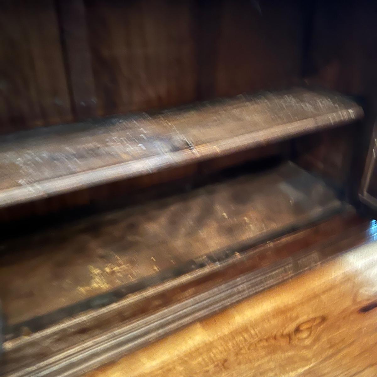 Lend a stately air to any home with this elegant vintage wood buffet. The piece has two covered cabinets up top, a mirrored display rack in the middle and two drawers central as well as two cabinets beneath. The piece measures 54” x 21” x 85”H. There are four key holes with locks attached. Two keys come with this piece. While they turn in the keyhole they do not seem to lock. The top piece has two shelves that do not appear to be adjustable. The mirrored shelf in the center has obvious signs of distress/age. The two drawers have brass appearing hardware as poles, and the lower unit has one shelf that again does not appear to be adjustable.