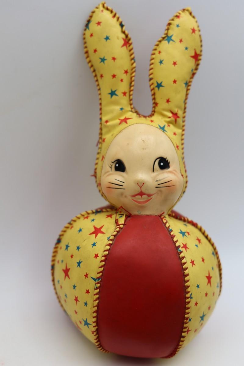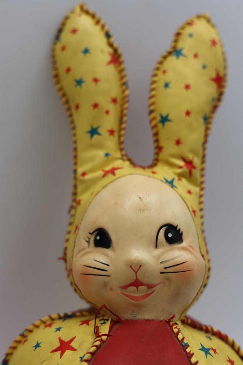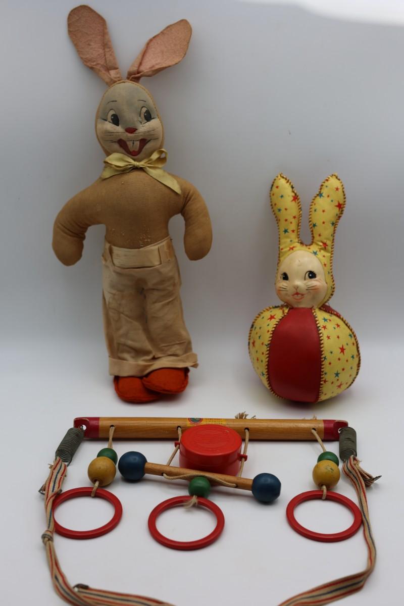 Early vintage baby toys! 1940s vintage bugs bunny, 1940s-1950s vinyl stuffed rabbit and a 1950s wooden crib musical mobile.