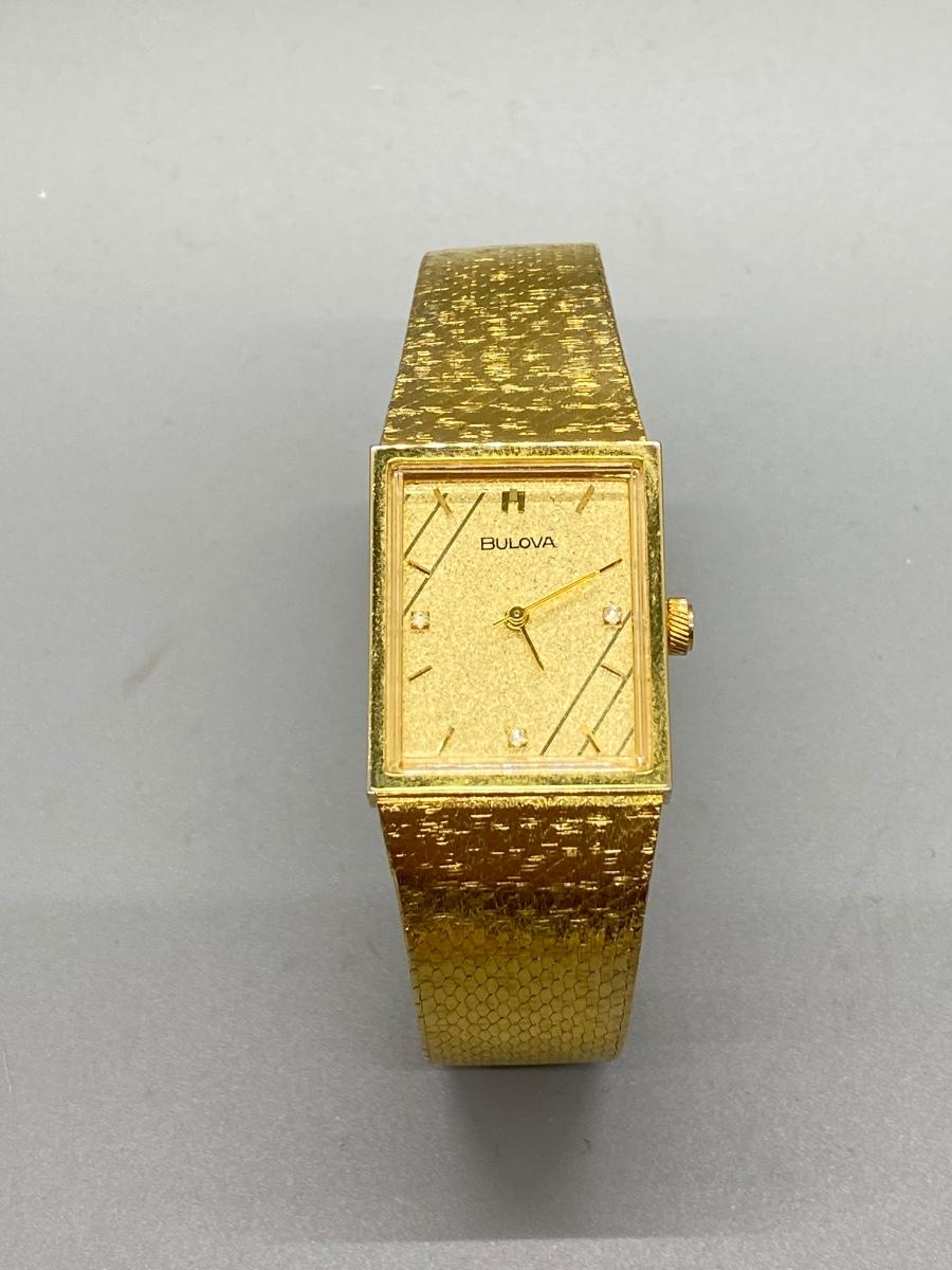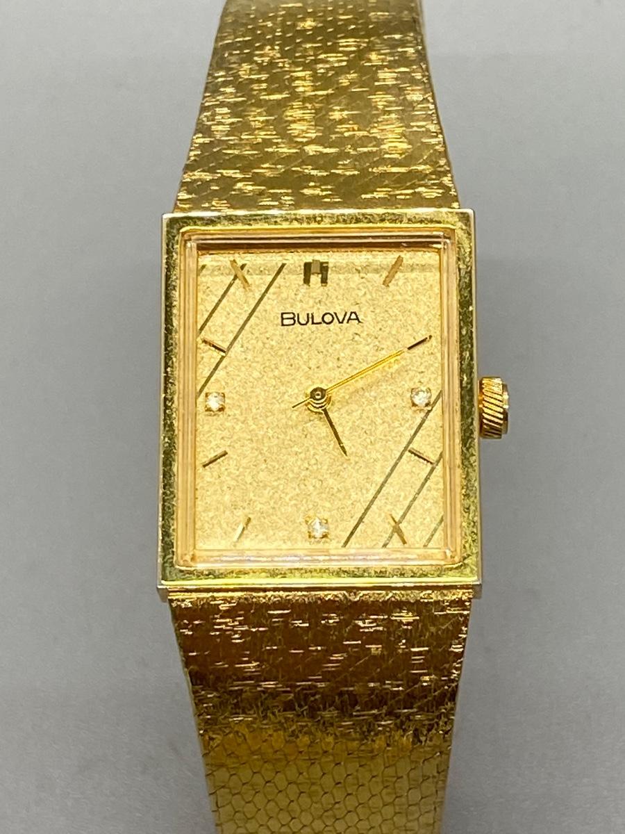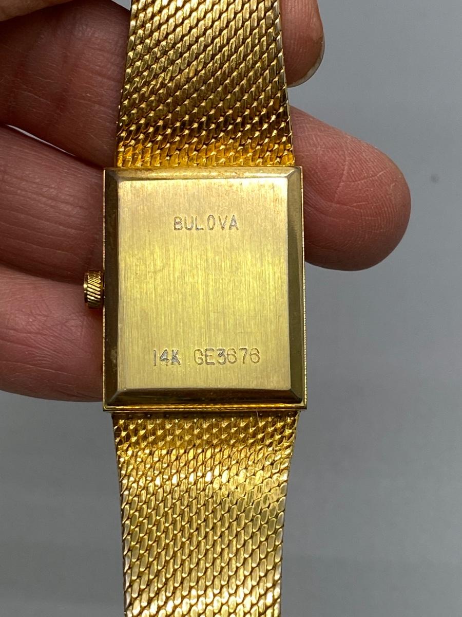 Vintage Bulova Wristwatch. 14k GE, Gold Electroplated. Currently not running, may need new battery. In good vintage condition. Adjustable solid band.