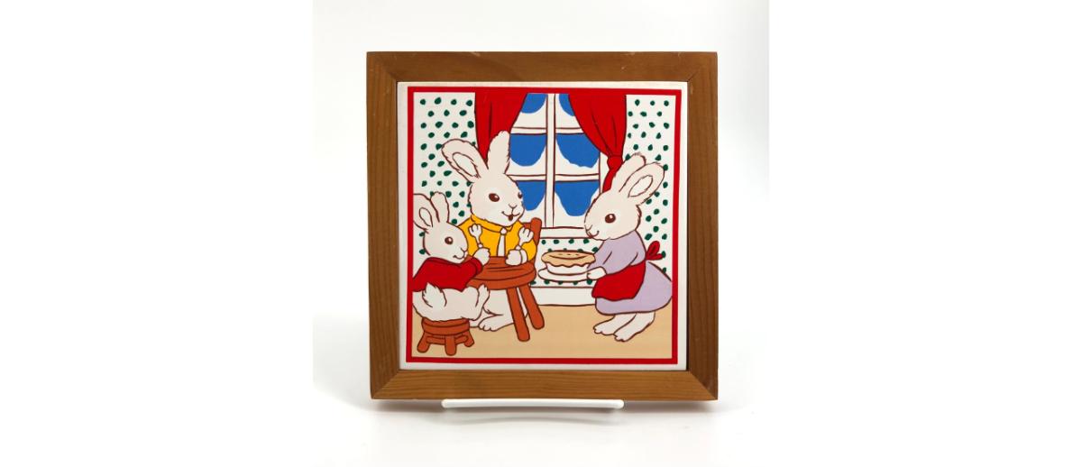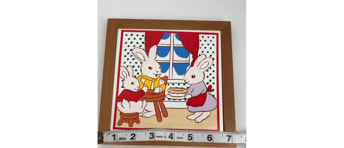 Super sweet vintage framed tile of a bunny rabbit family getting ready to eat pie. Measures approximately 7” x 7”. Stand not included.