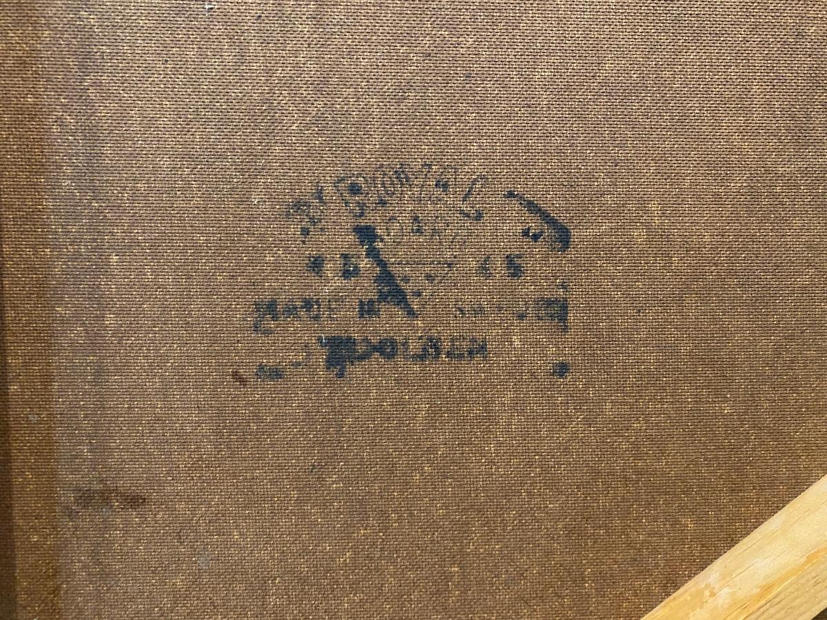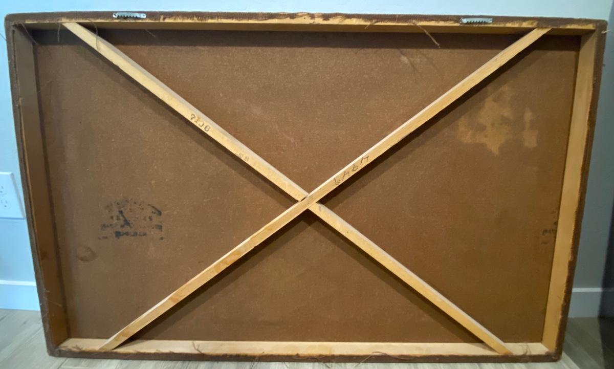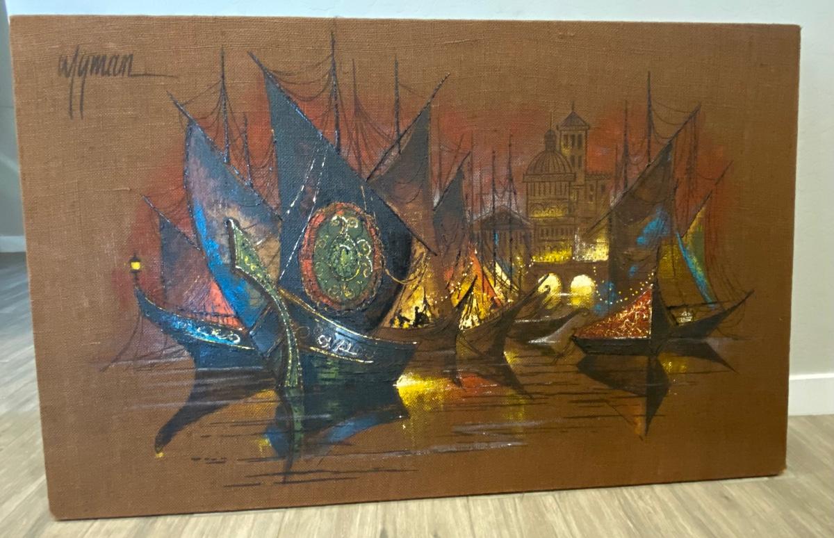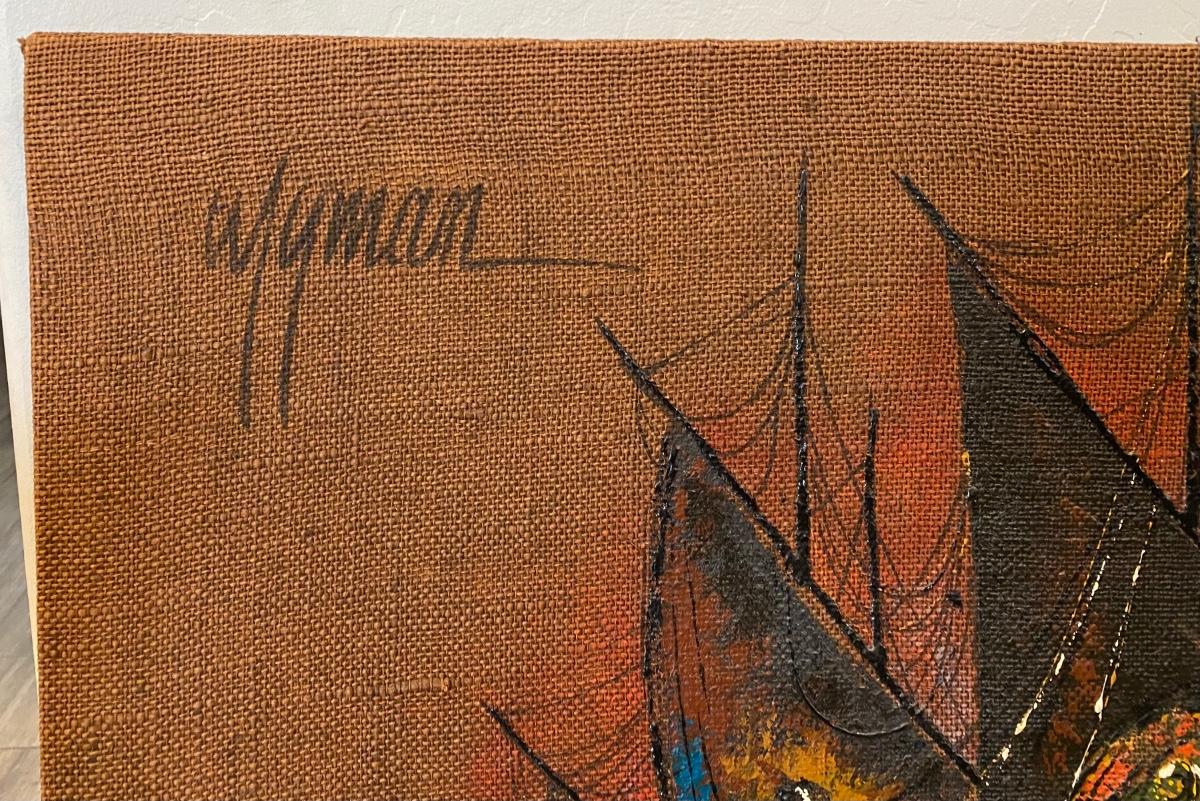 Mid Century Modern Large Wyman Ships Painting on Burlap Art