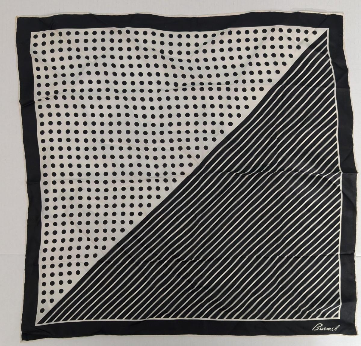 Burmel, vintage silk scarf, black and white scarf, polka dot scarf, striped scarf, geometric design, hand rolled hem, collectible scarf, retro fashion accessory, vintage designer scarf