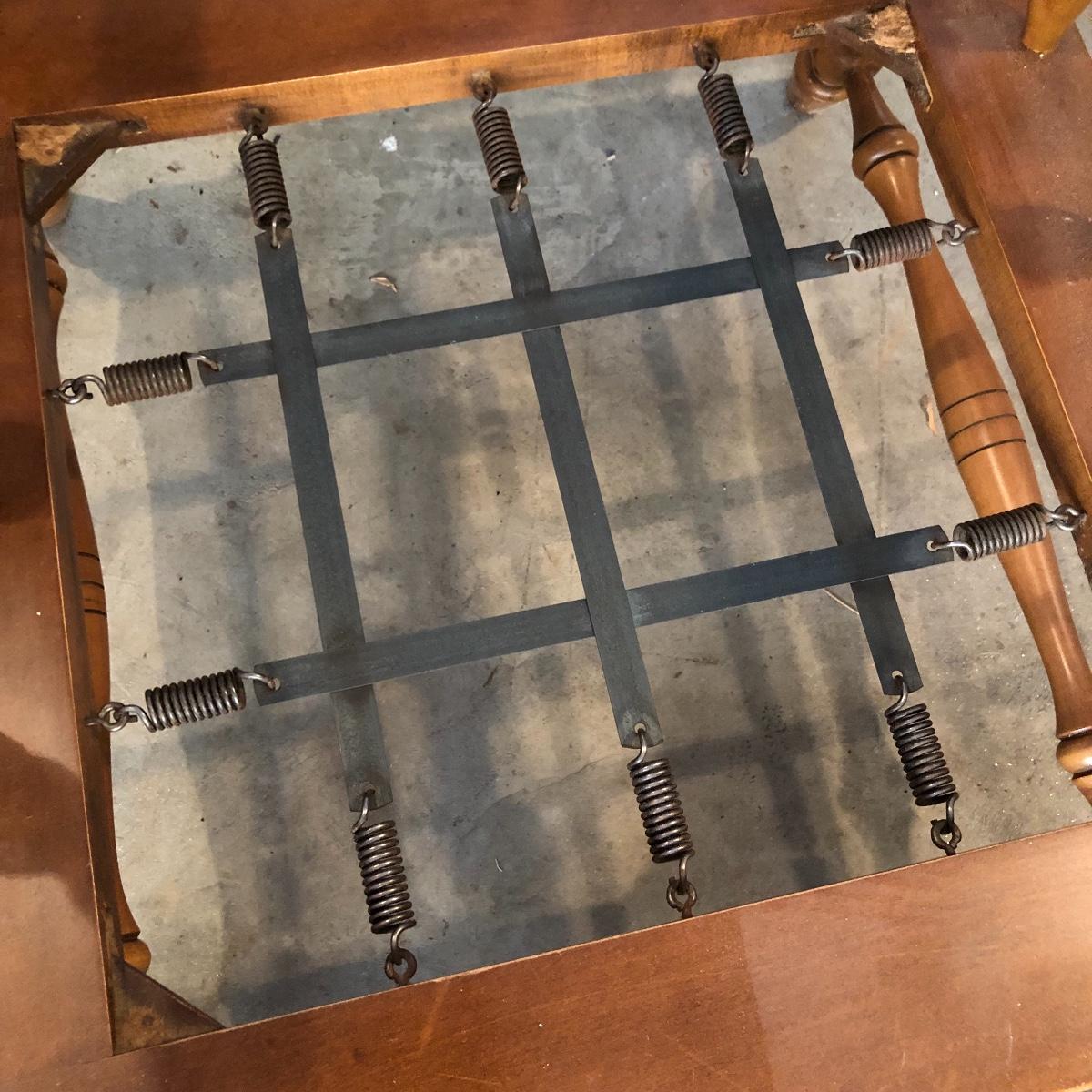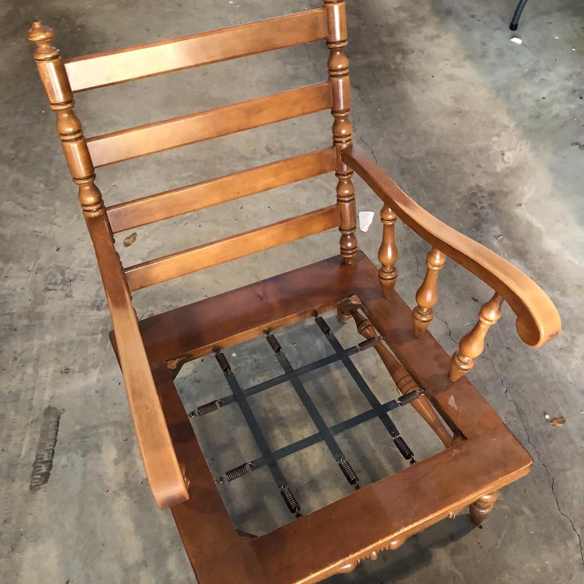 Both the seat and back cushions have zippers. They feel as if they may be made of a wool blend. The chair is solid wood and has metal springs and straps. Dimensions are 24.5” x 26.5” x 32.5”. Seat height with cushion is 16”. Local pick up only.