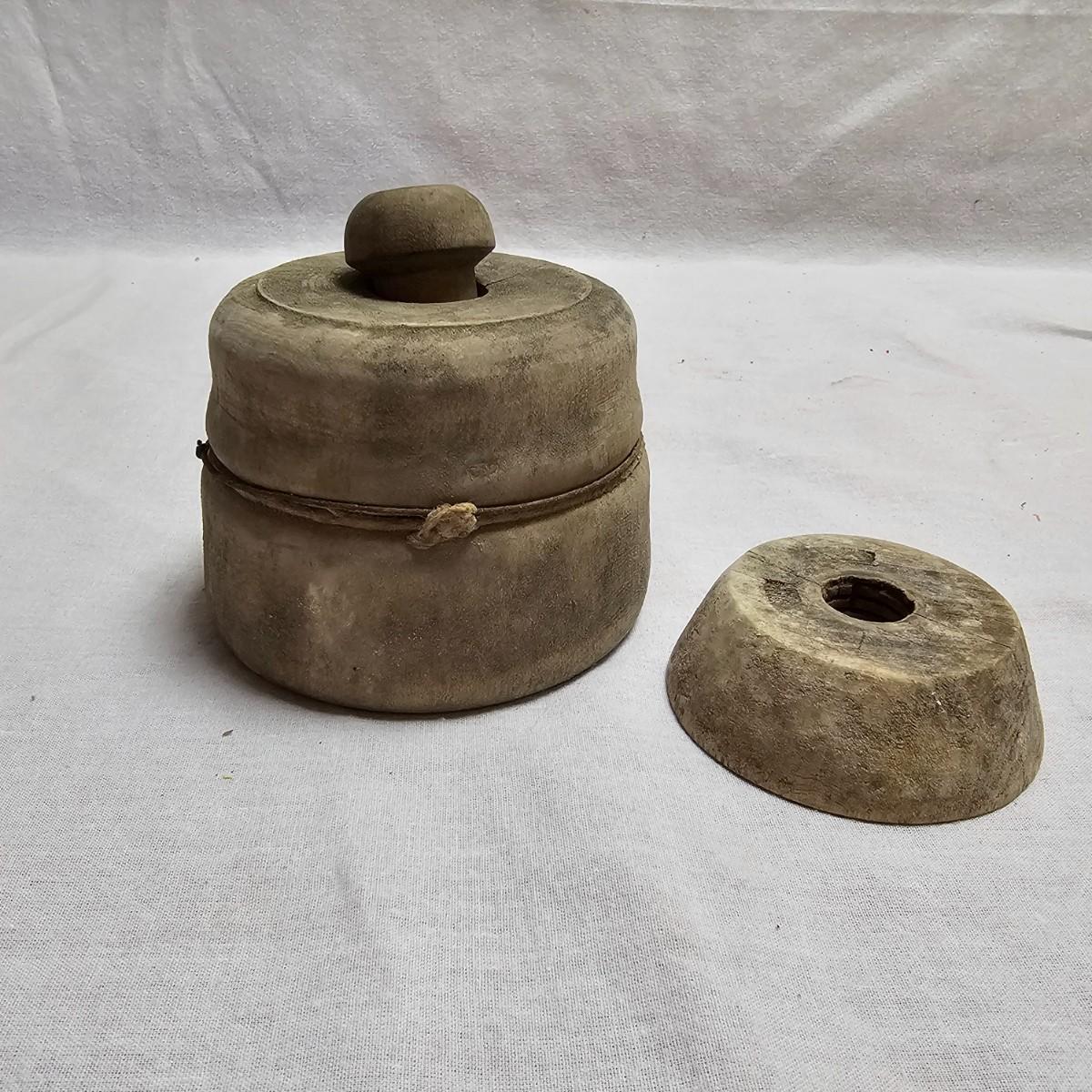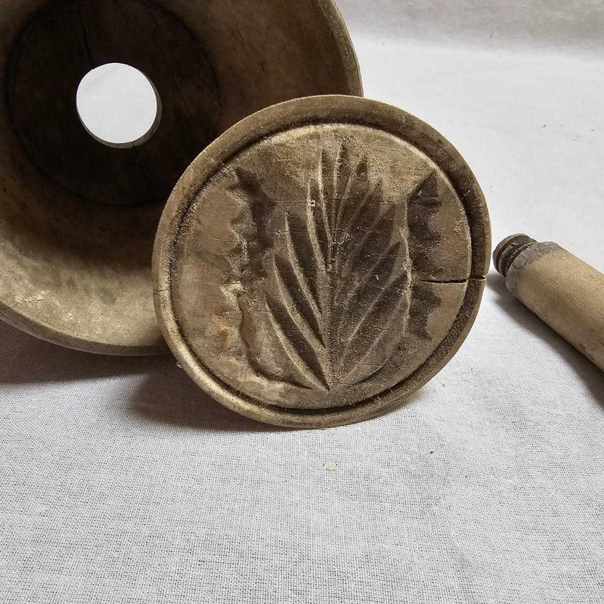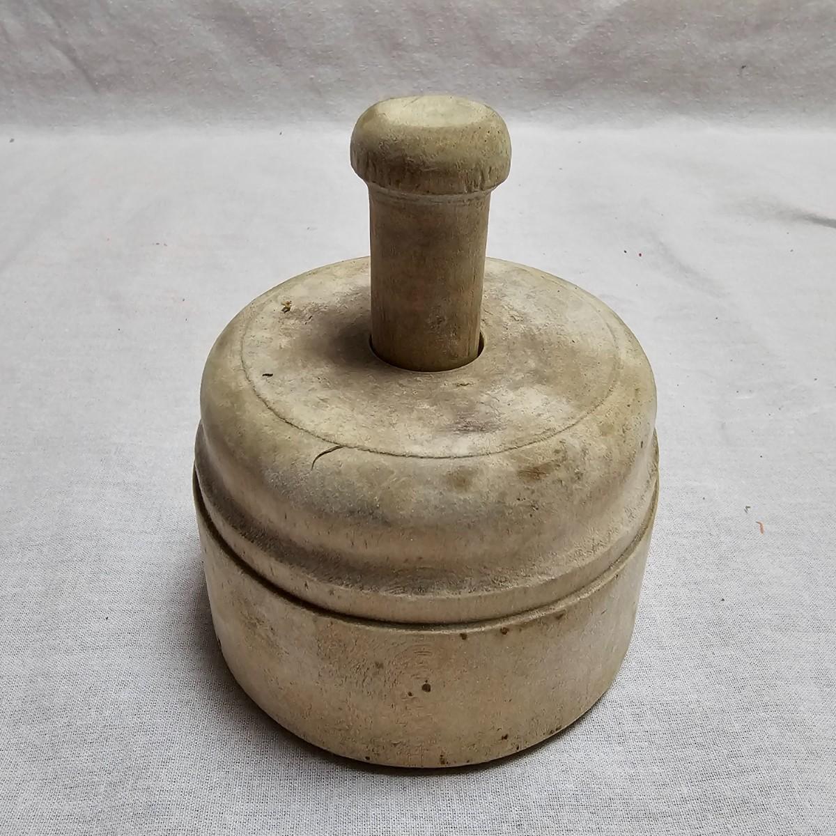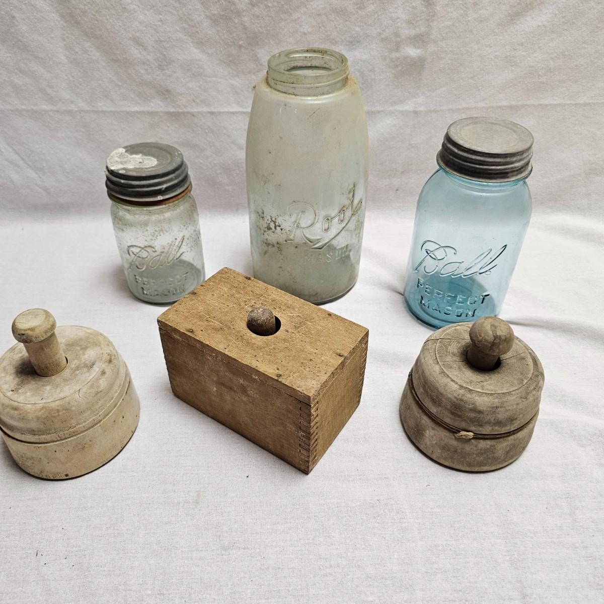 Three wooden butter molds and three canning jars. Two jars by Ball, one clear, one blue. One jar by Root, 4.5" D x 9"H. Two round butter molds, 4"D x 4"H. Carved imprint in bottom of mold piece; one mold has loose handle. Rectangular mold has lapped joints, is 3.5" x 3.25" x 3.5"H. Plain bottom, no design. Some cracks in the wood; see photos for details. Shipping available.